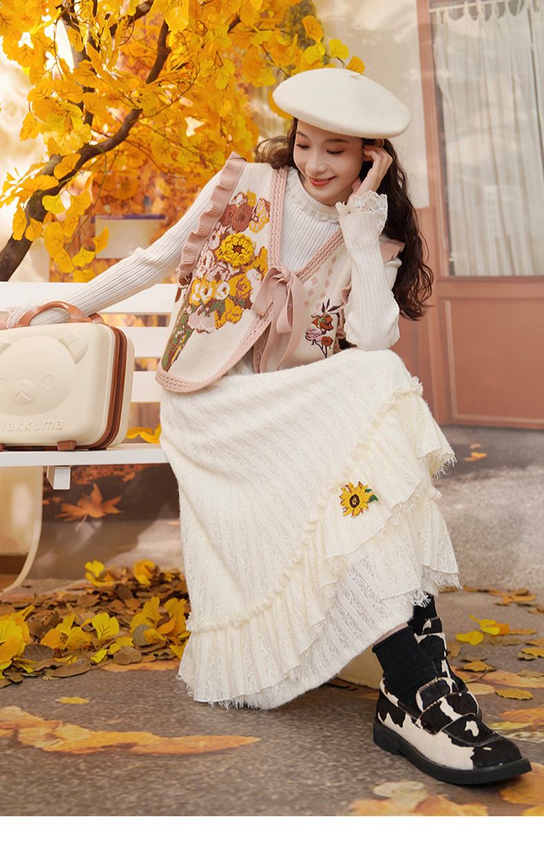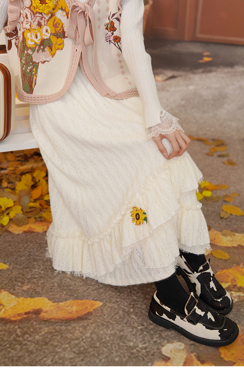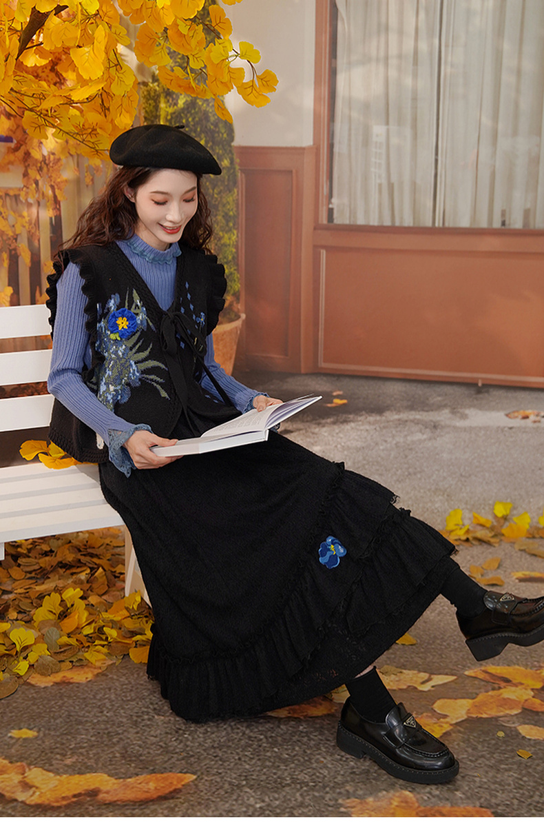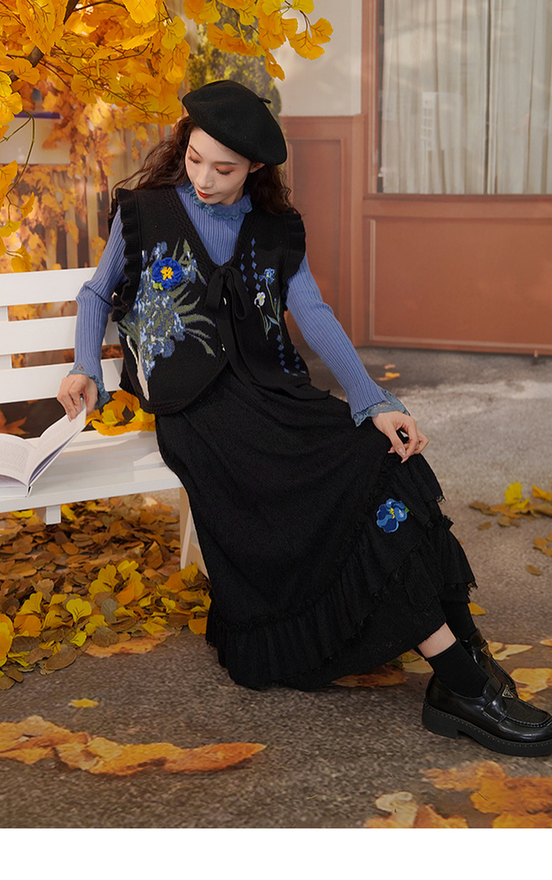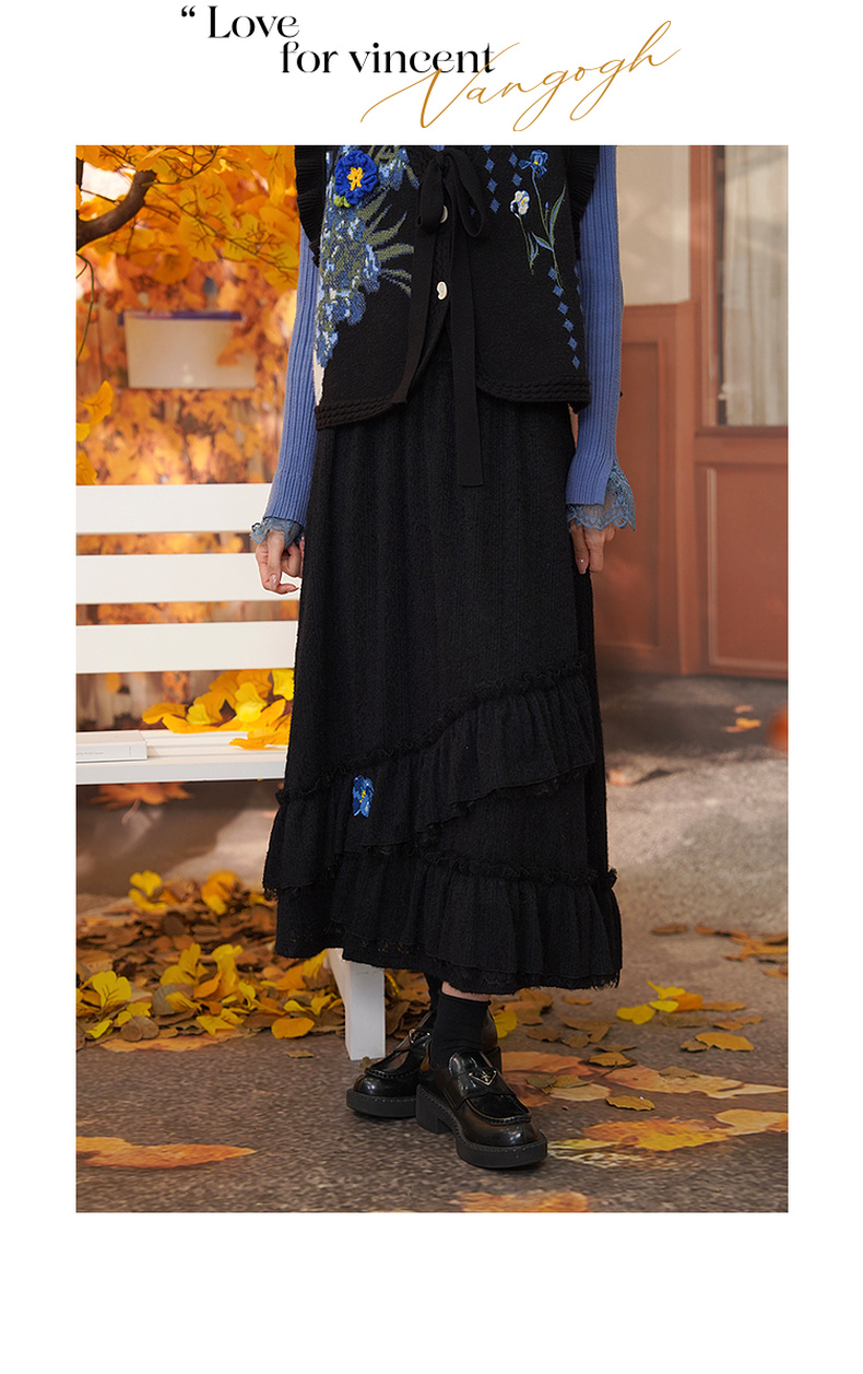 两三事梵高文艺蓝鸢仙葵2024冬新款立体花朵荷叶边拼接蕾丝半身裙
