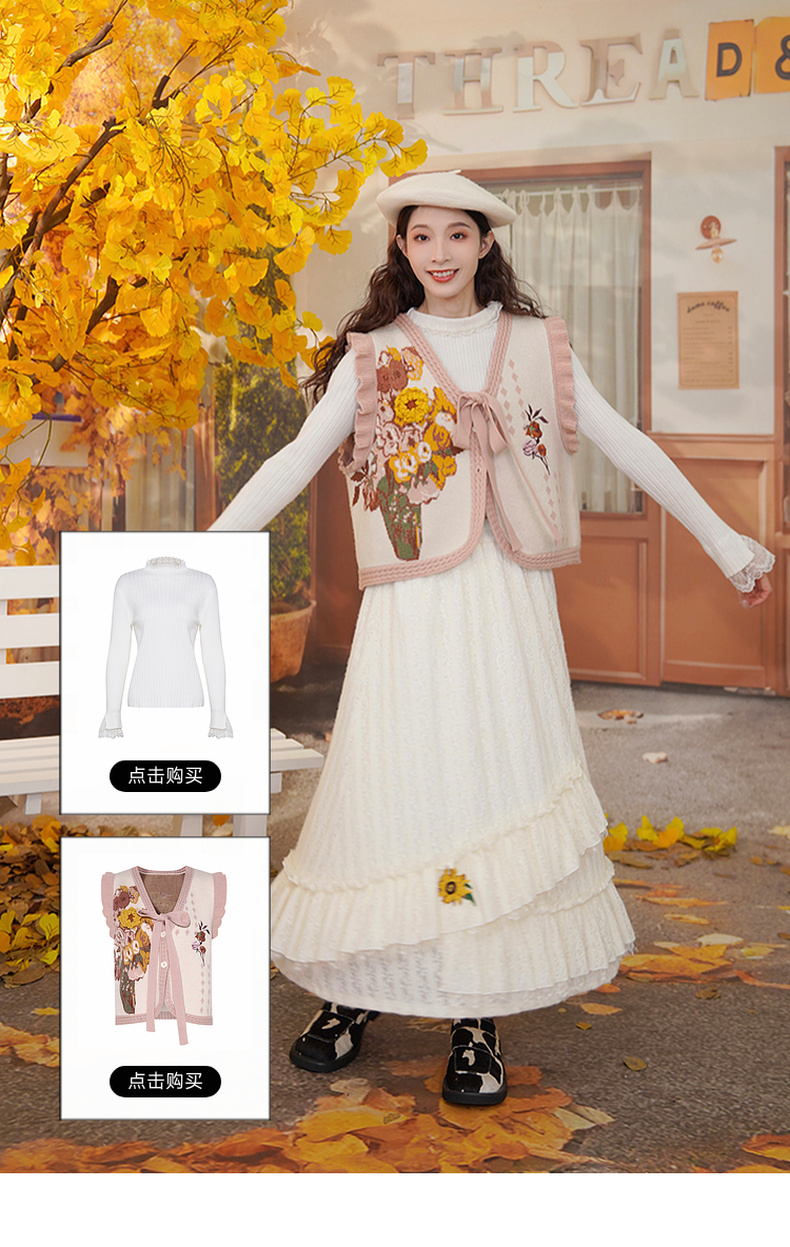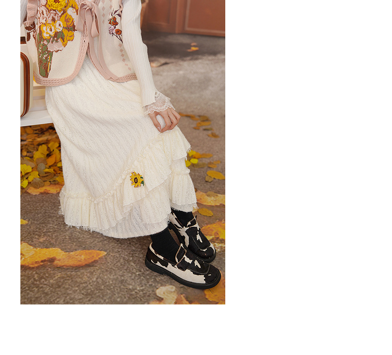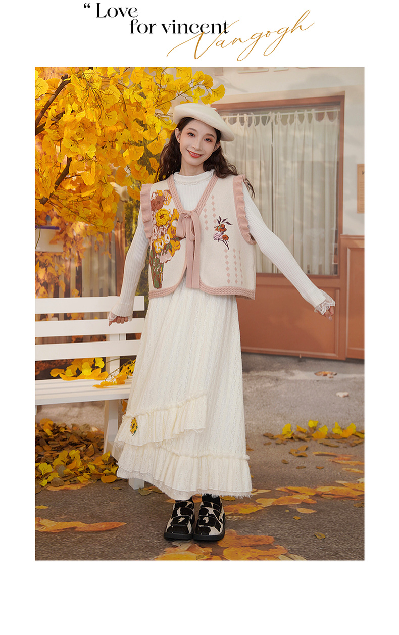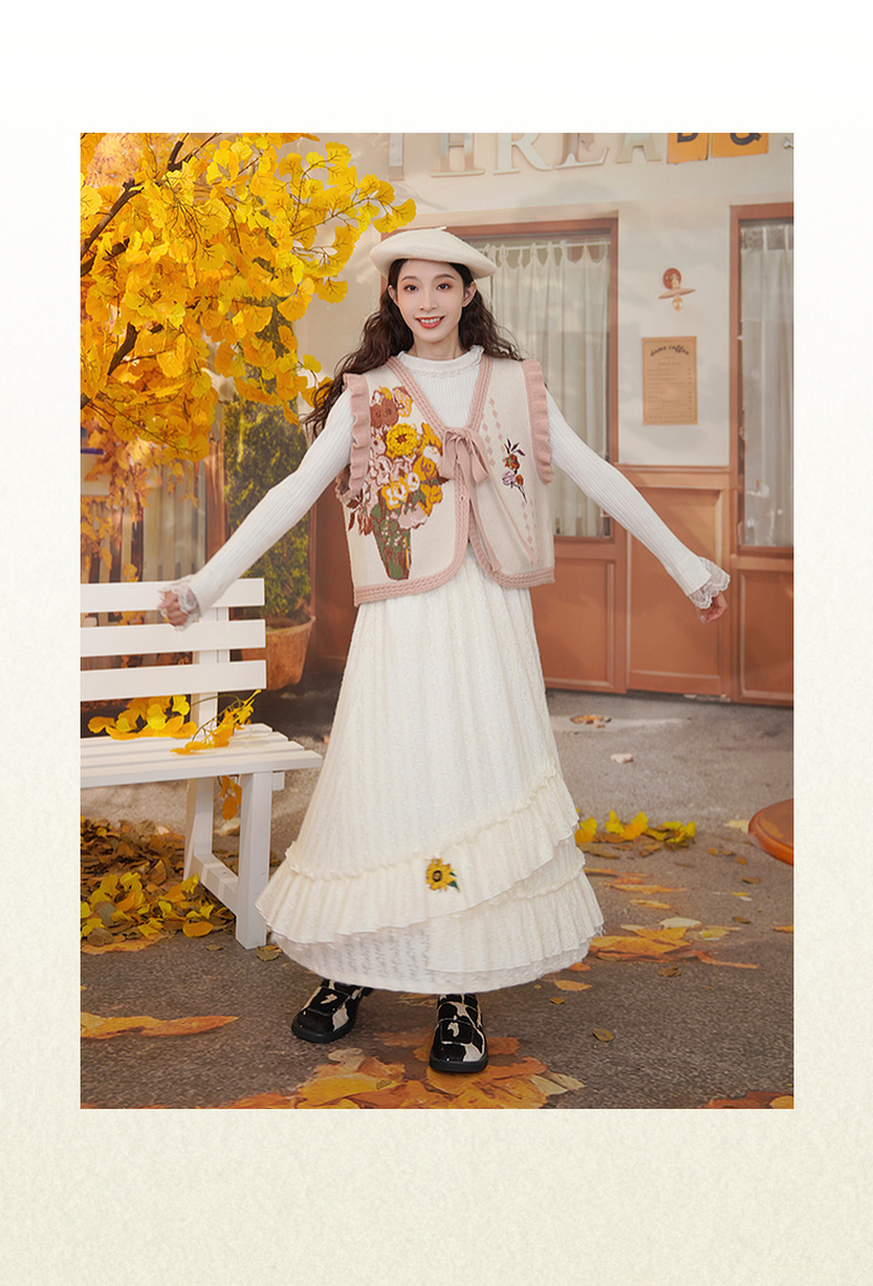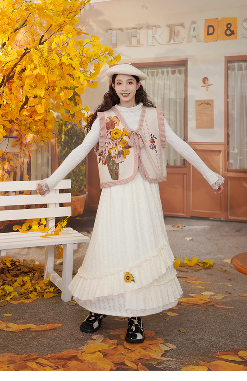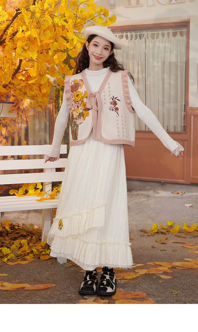 两三事梵高文艺蓝鸢仙葵2024冬新款立体花朵荷叶边拼接蕾丝半身裙