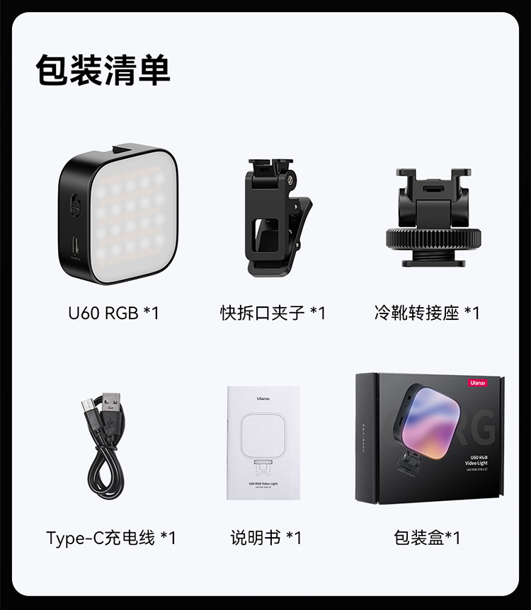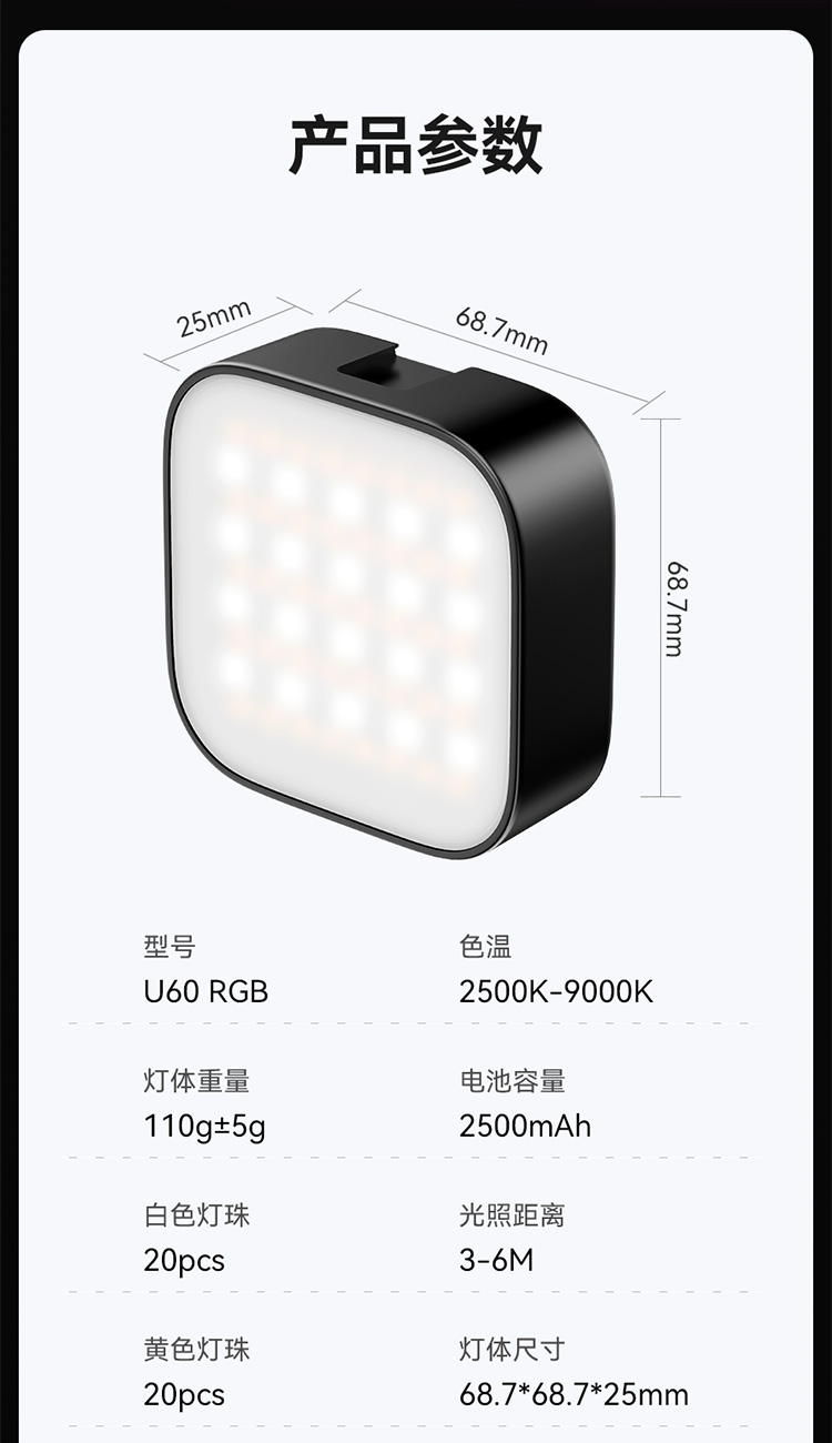 Ulanzi优篮子 U60方块RGB补光灯迷你口袋便携式手机直播拍照打光灯全彩LED手持拍摄美食专业发丝摄影灯