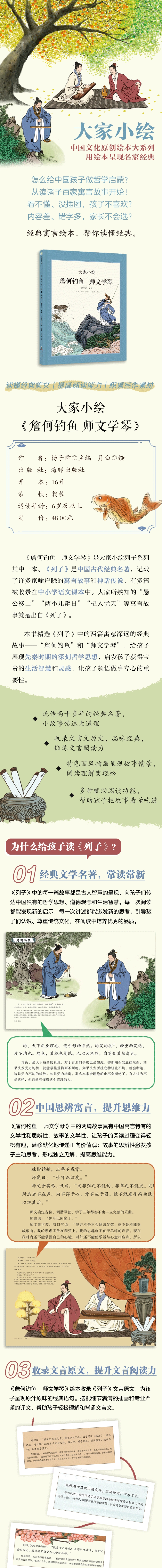 《詹何钓鱼 师文学琴》是大家小绘列子系列其中一本。《列子》是中国古代经典名著,记载了许多家喻户晓的寓言故事和神话传说,有多篇被收录在中小学语文课本中。大家所熟知的“愚公移山”“两小儿辩日”“杞人忧天”等寓言故事就是出自《列子》。 本书精选了《列子》中的两篇寓意深远的经典故事——“詹何钓鱼”和“师文学琴”,给孩子展现先秦时期的深刻哲学思想,启发孩子获得宝贵的生活智慧和灵感,让孩子领悟做事专心的重要性。
