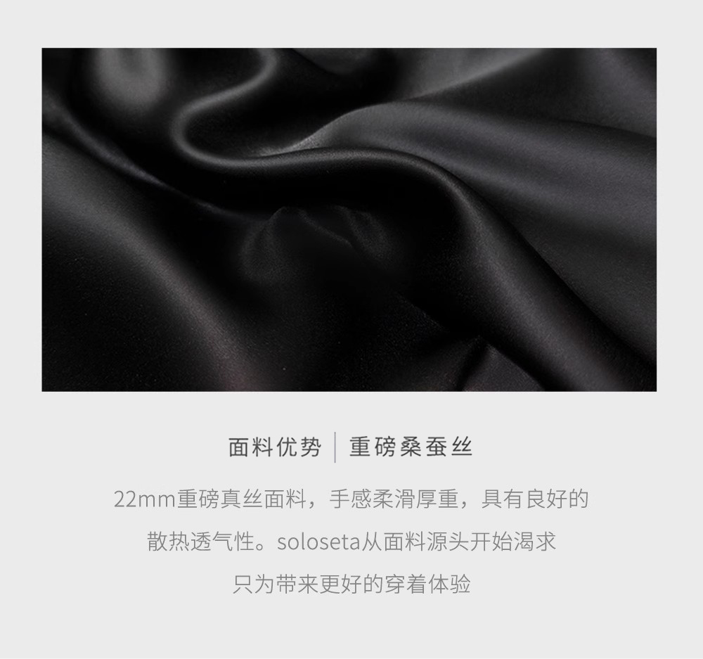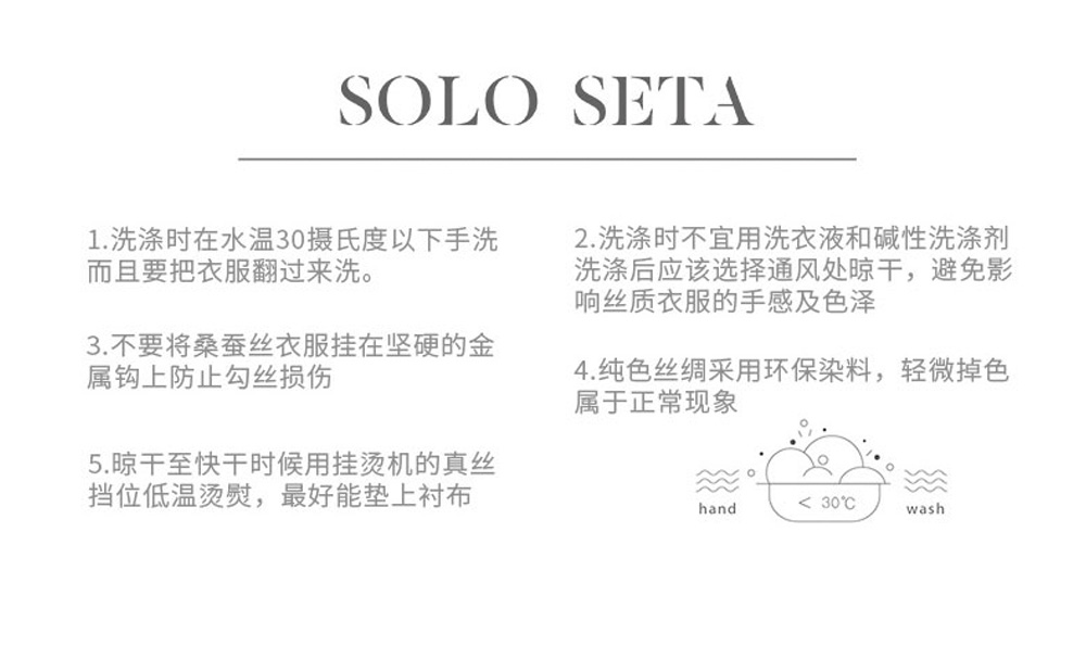 - soloseta专注于真丝织物,灵感源自意大利语,中文含义为“只做真丝”的意思。让睡衣变时尚,居家和外出瞬间切换,使其更具有出街,度假,参加宴会等功能。