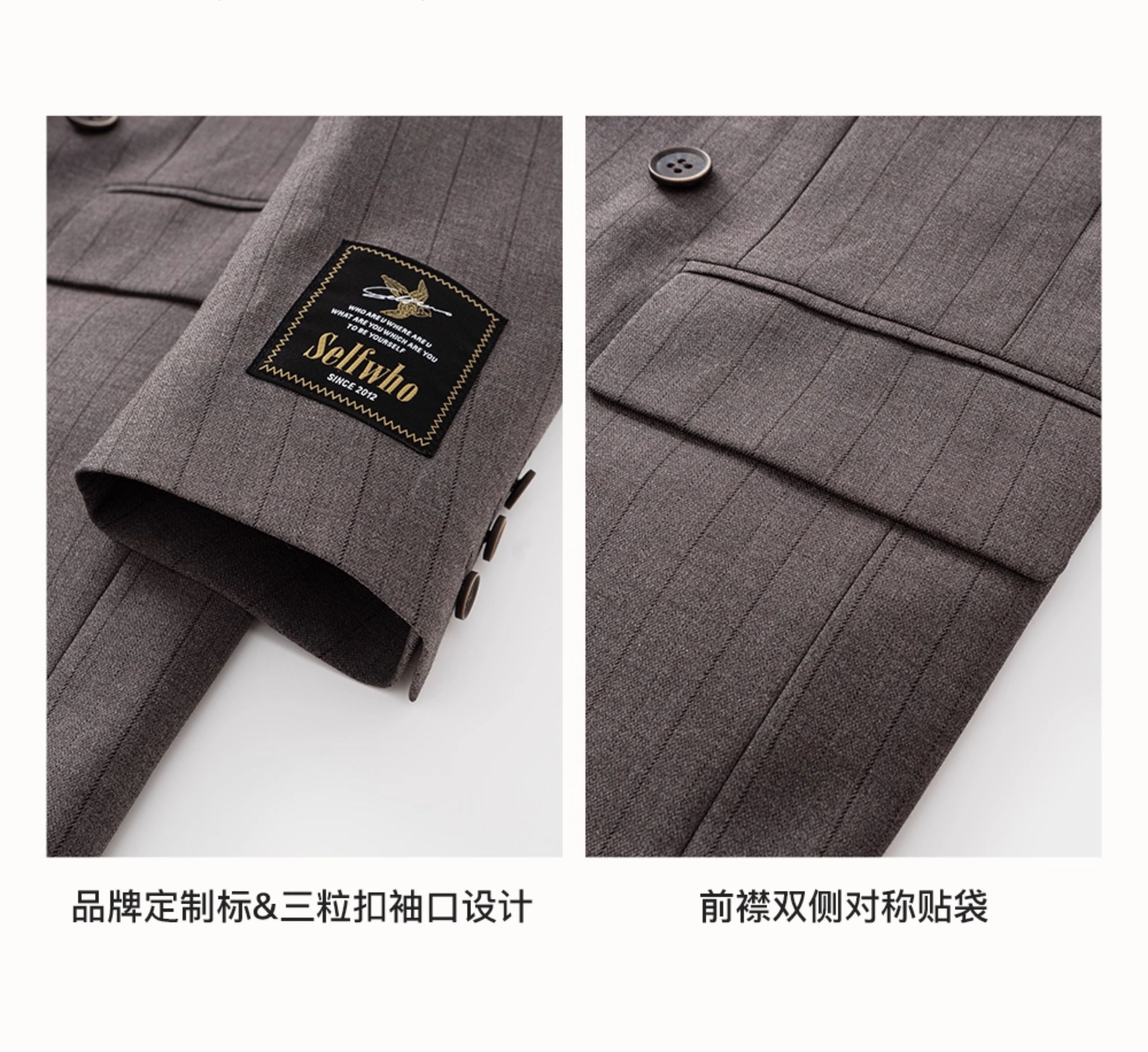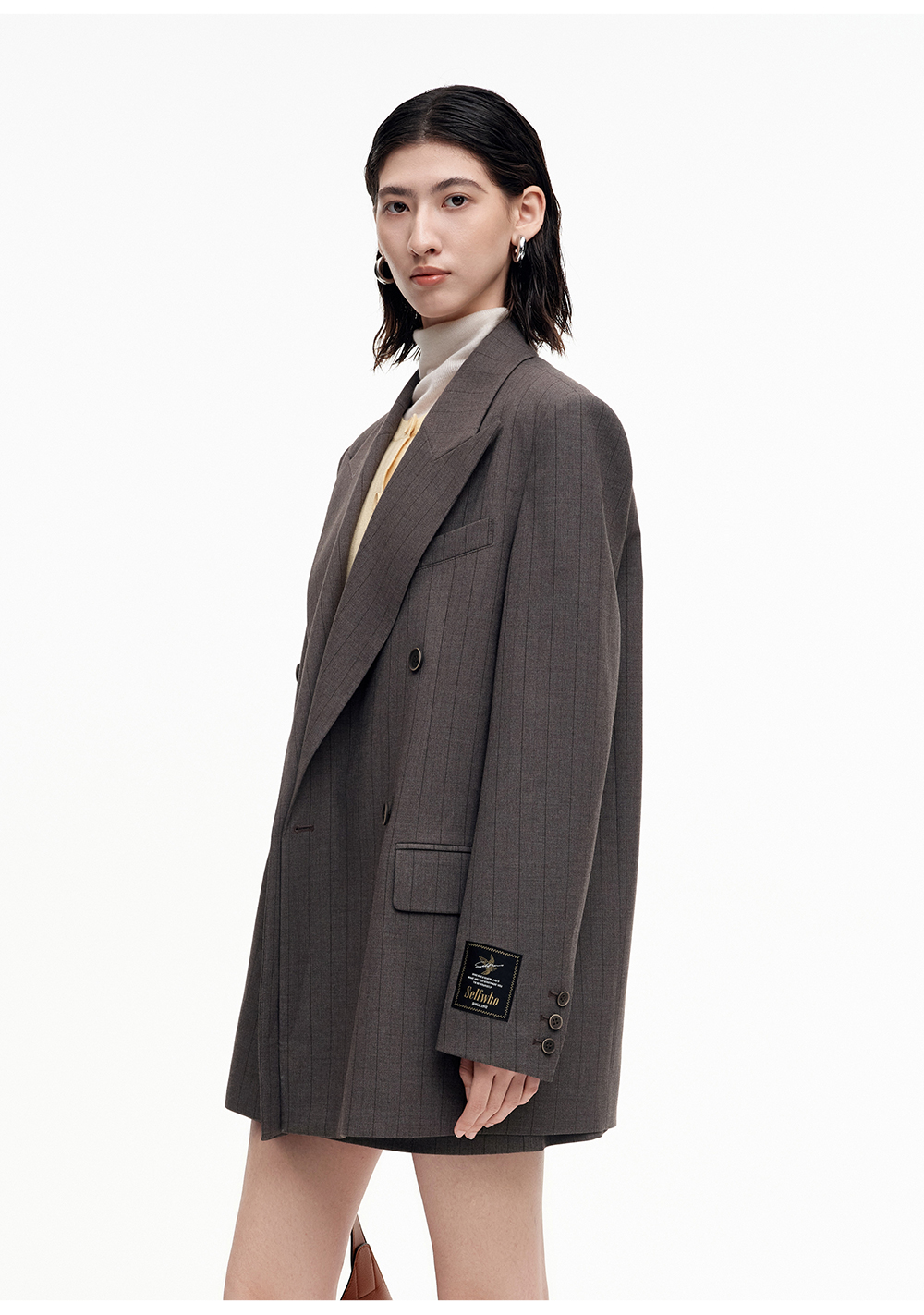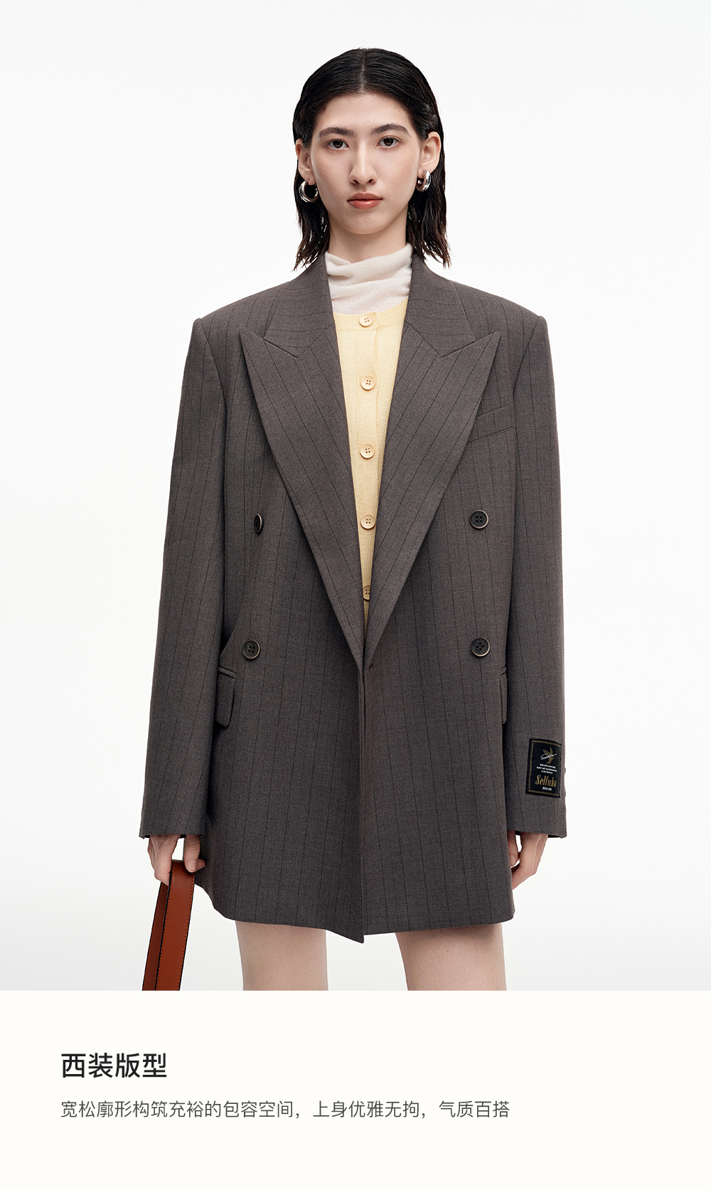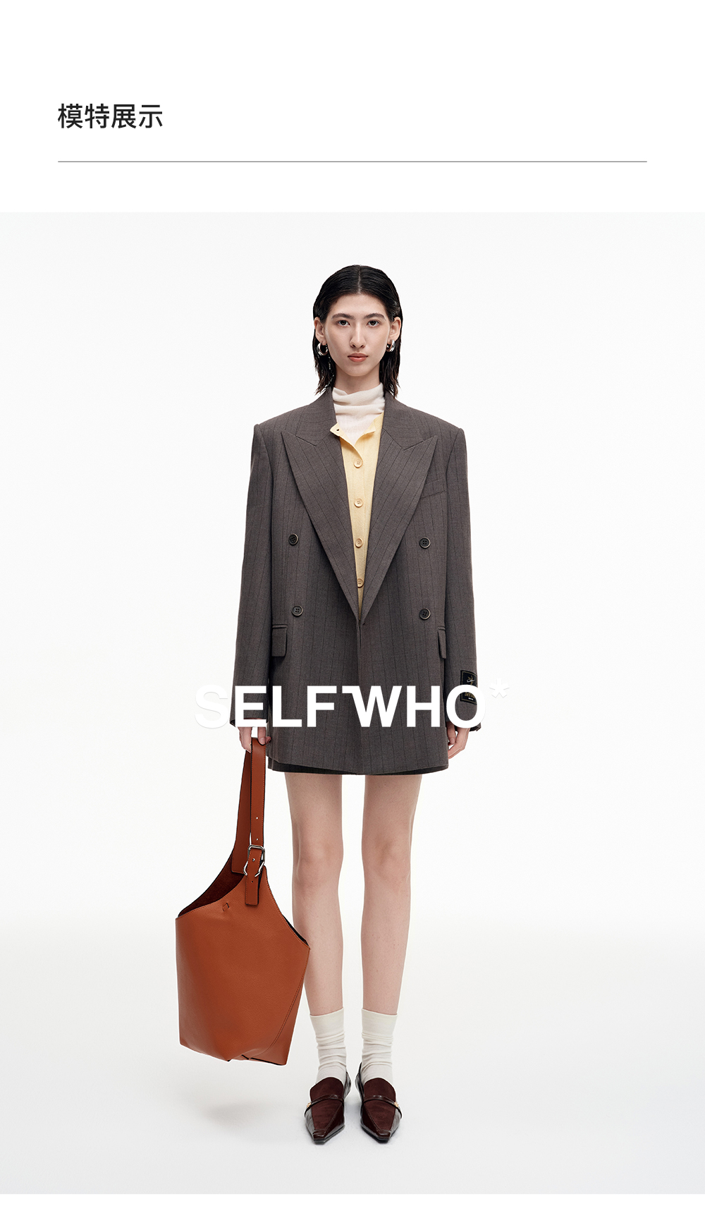 SELFWHO双排扣暗条纹西装外套女2025秋新款时尚通勤百搭垫肩西服