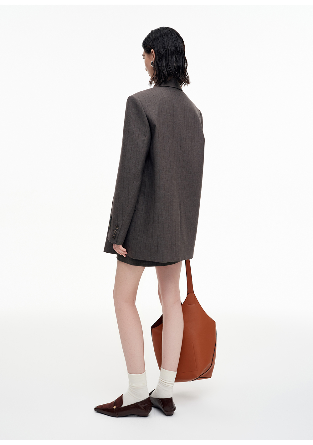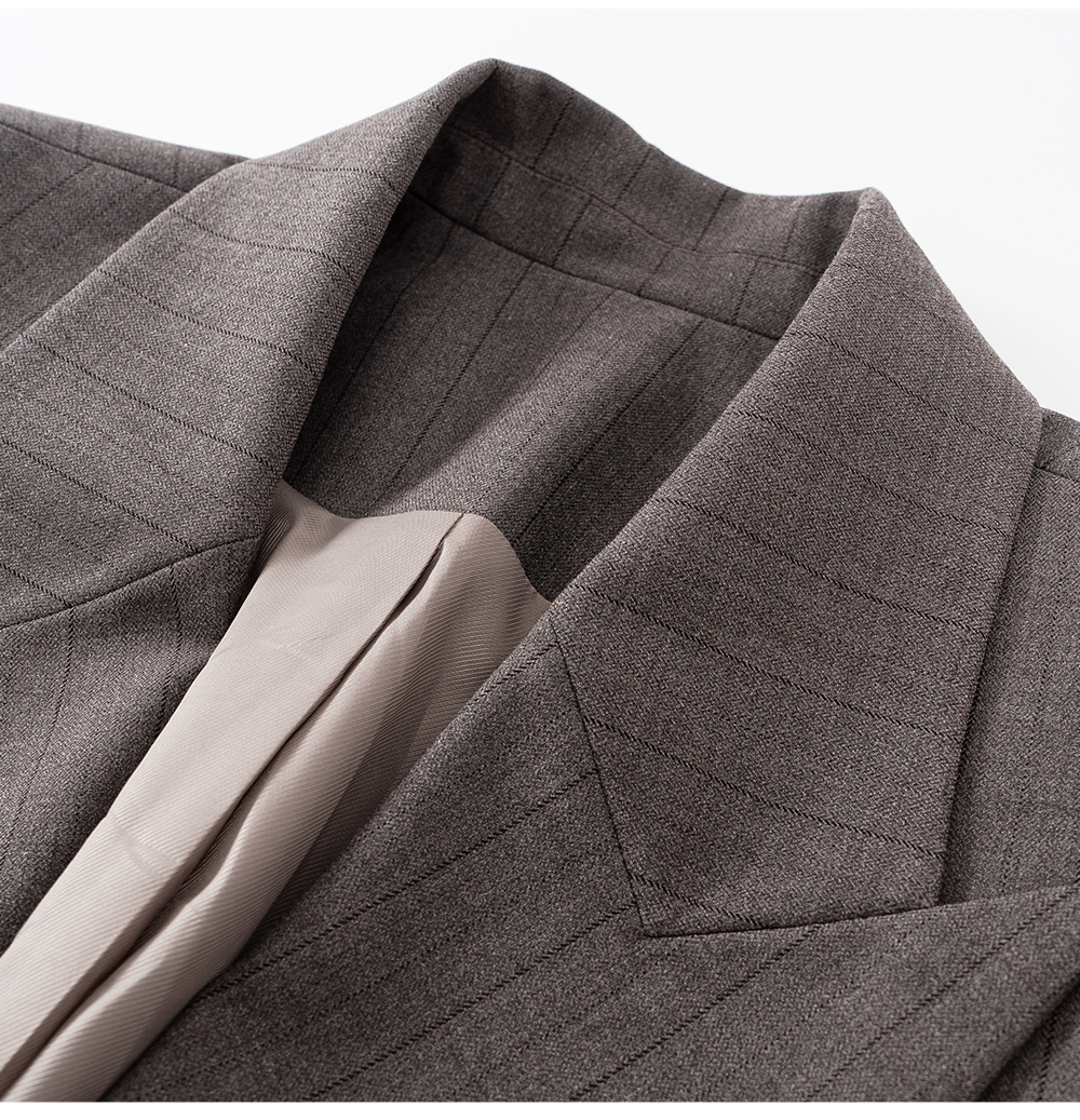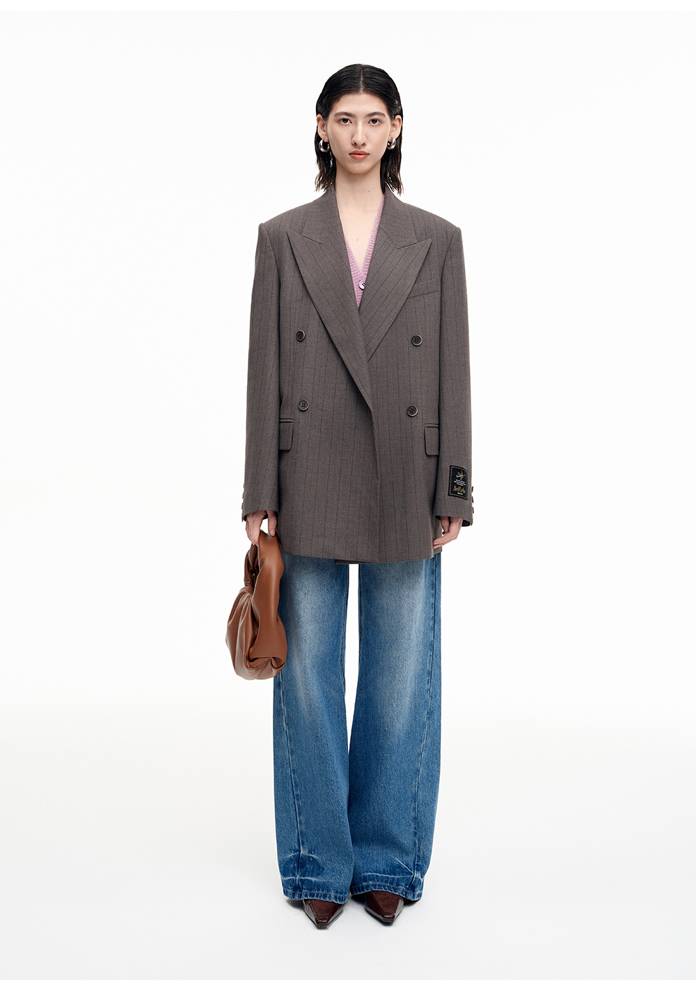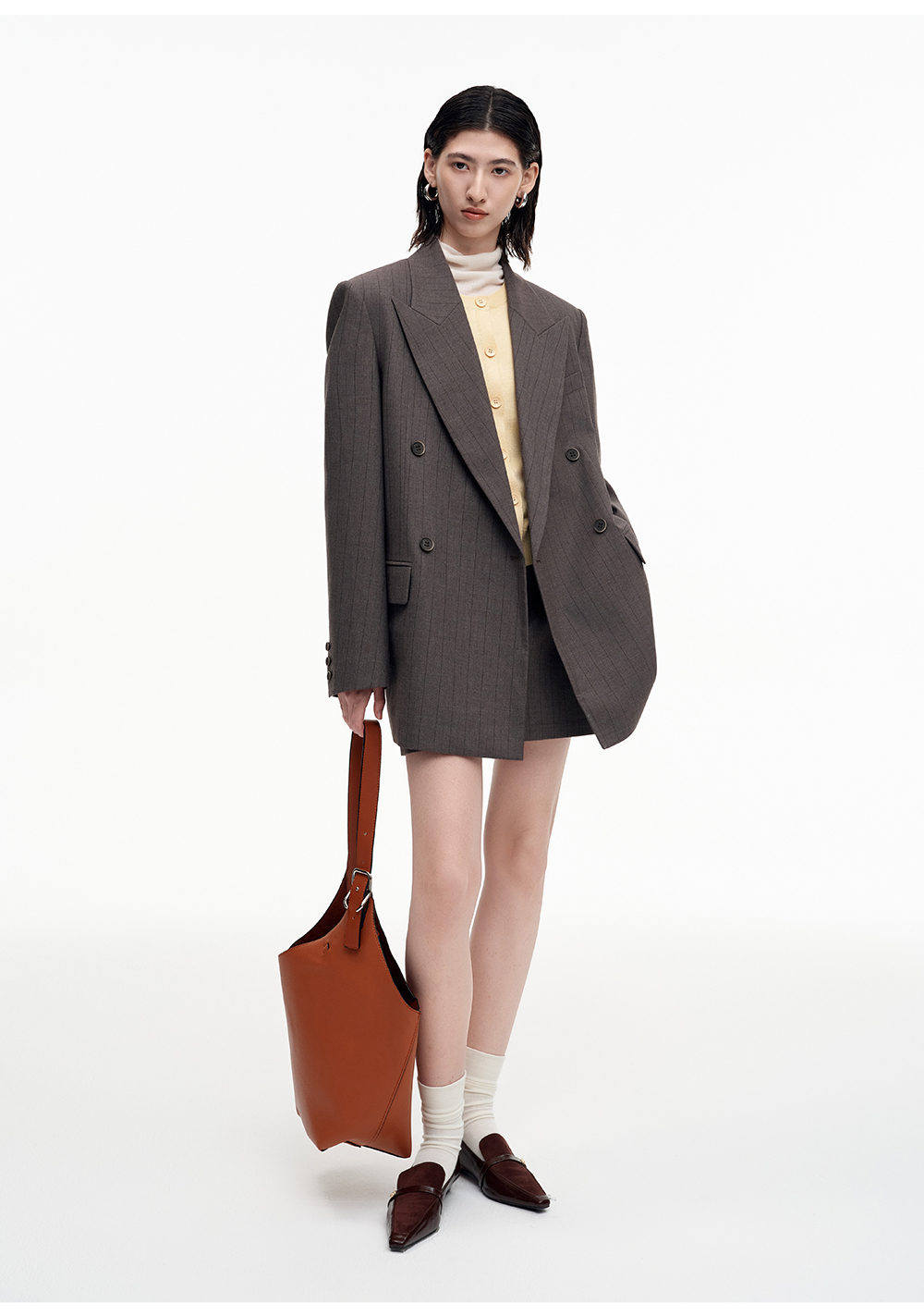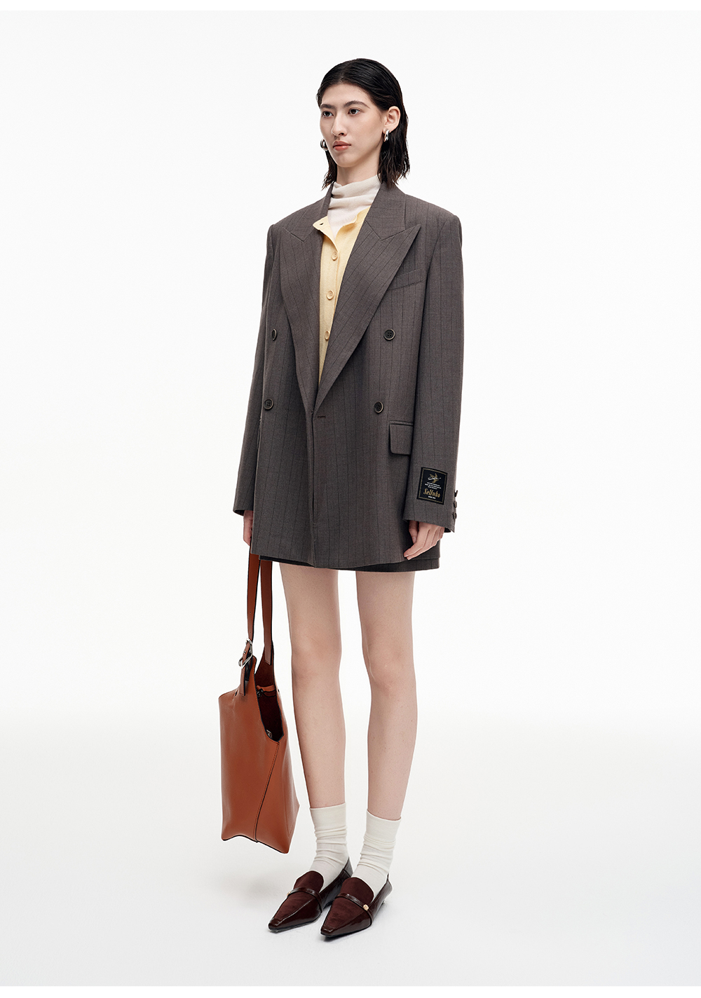 SELFWHO双排扣暗条纹西装外套女2025秋新款时尚通勤百搭垫肩西服