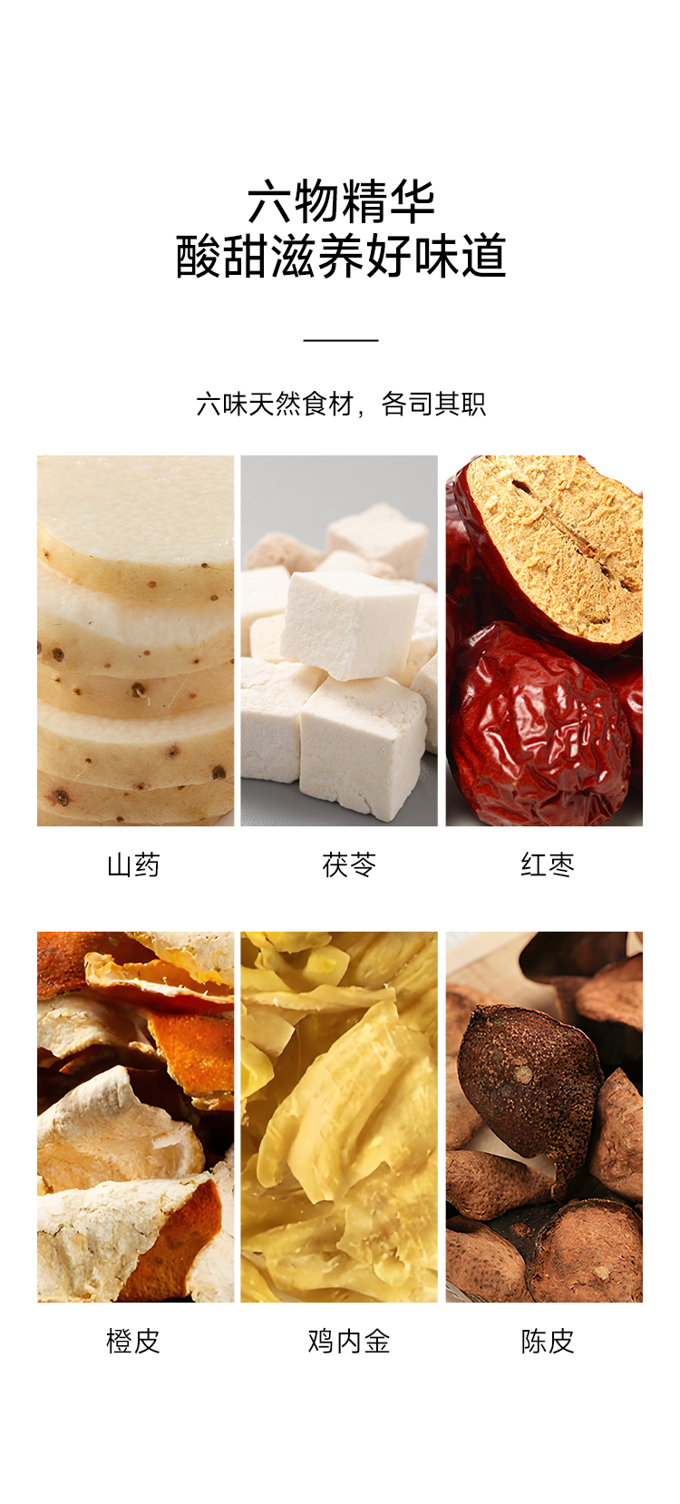 搭配橙皮、红枣、鸡内金、山药、茯苓、陈皮,每一种都是药食同源的食材。
