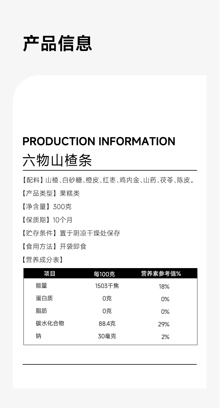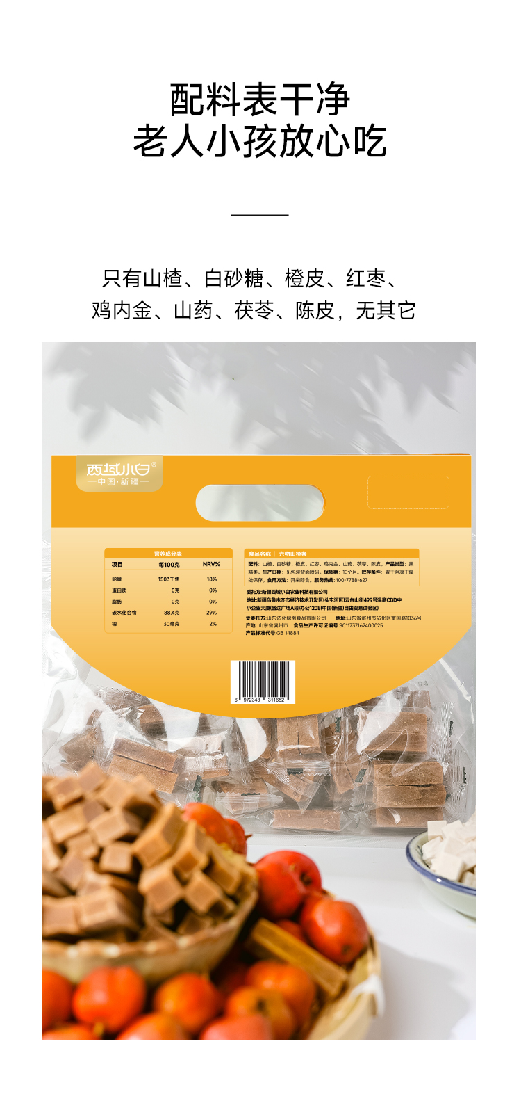 配料表:山楂、白砂糖、橙皮、红枣、鸡内金、山药、茯苓、陈皮。