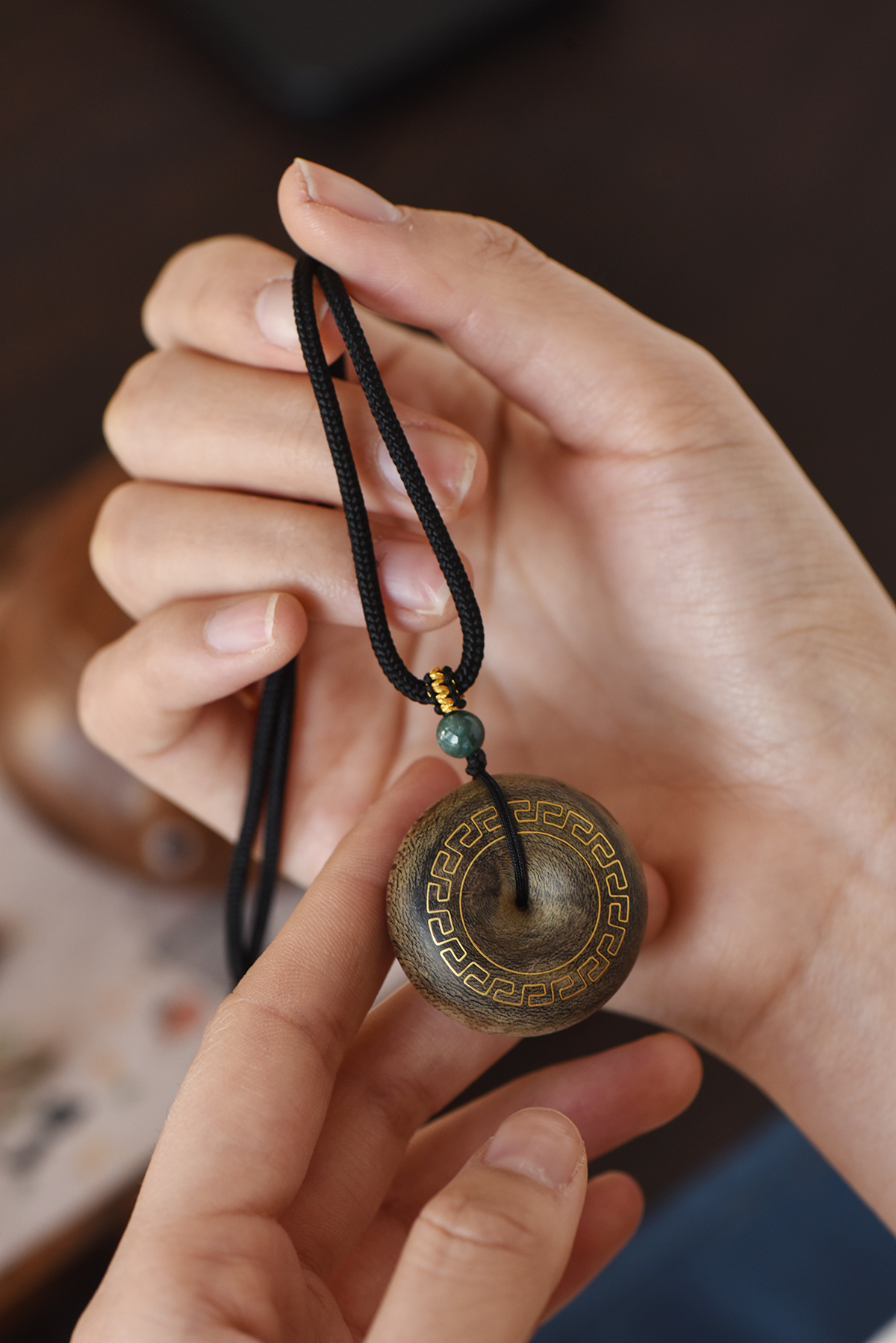 这款采用了木错金工艺的平安扣虽简单,但透出古朴大气,一抹亮金色,让整个平安扣金光闪闪。
