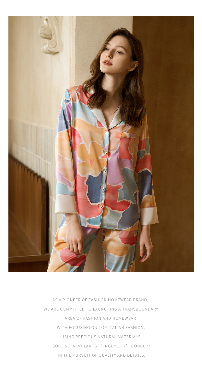 - soloseta专注于真丝织物,灵感源自意大利语,中文含义为“只做真丝”的意思。让睡衣变时尚,居家和外出瞬间切换,使其更具有出街,度假,参加宴会等功能。