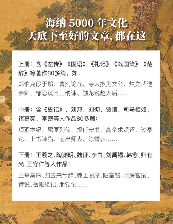 全书分上中下三册,以朝代为序,从先秦诸子、战国、到明末,包含《史记》《左传》《战国策》《汉书》唐宋散文、明清小品……数十部古籍经典菁华都在其中。