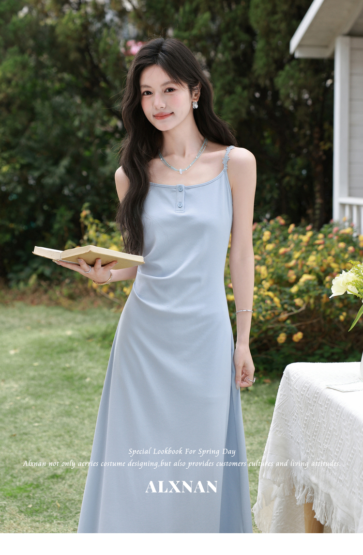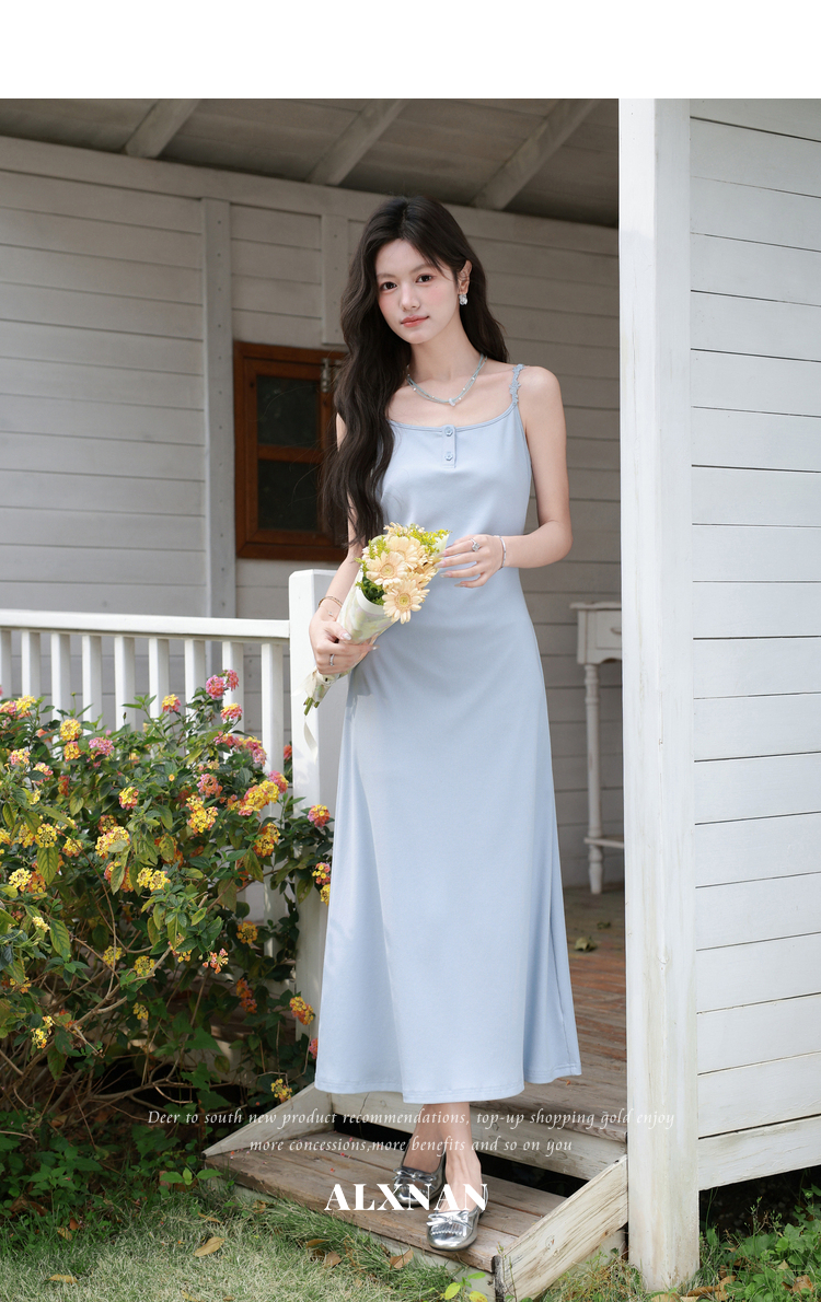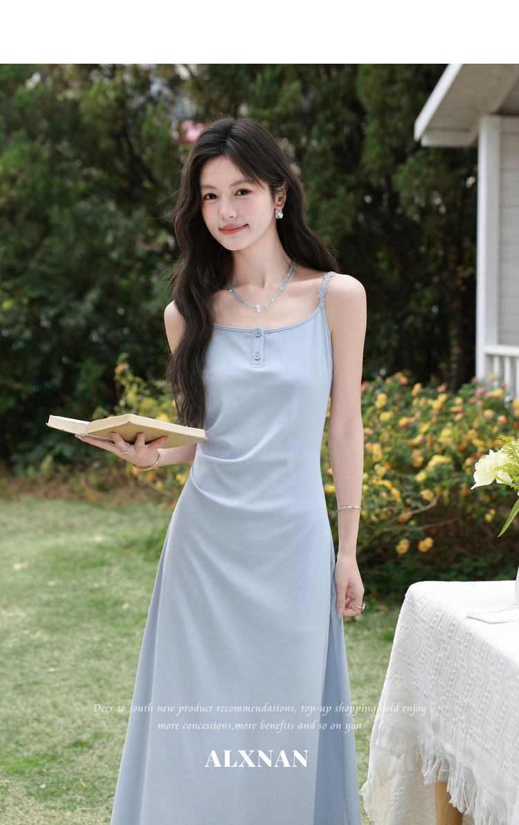 鹿向南「汀兰水色」法式气质吊带连衣裙女夏新款收腰显瘦蓝色长裙