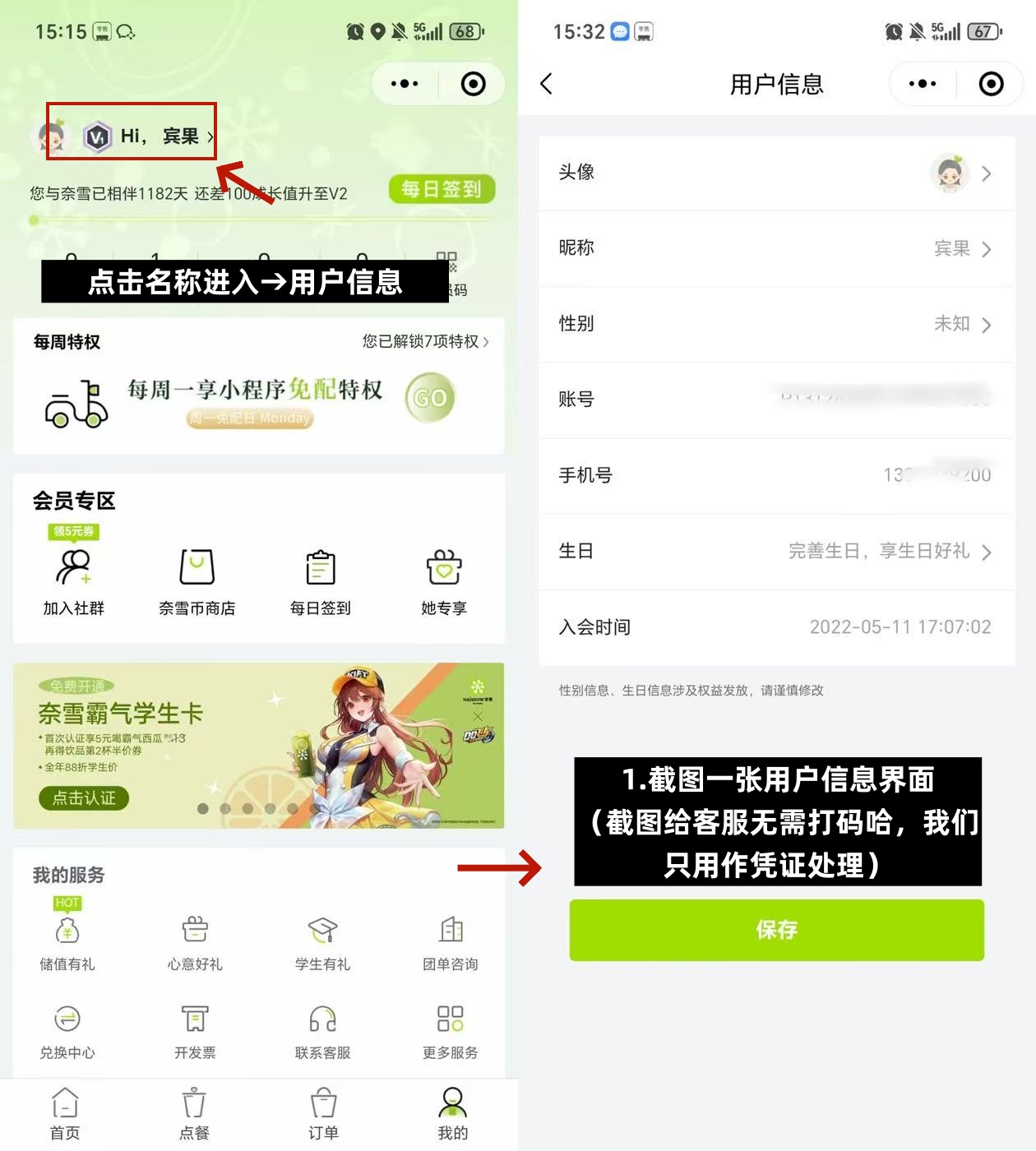 1. 到微信搜索小程序【奈雪点单】并登录您的账号。