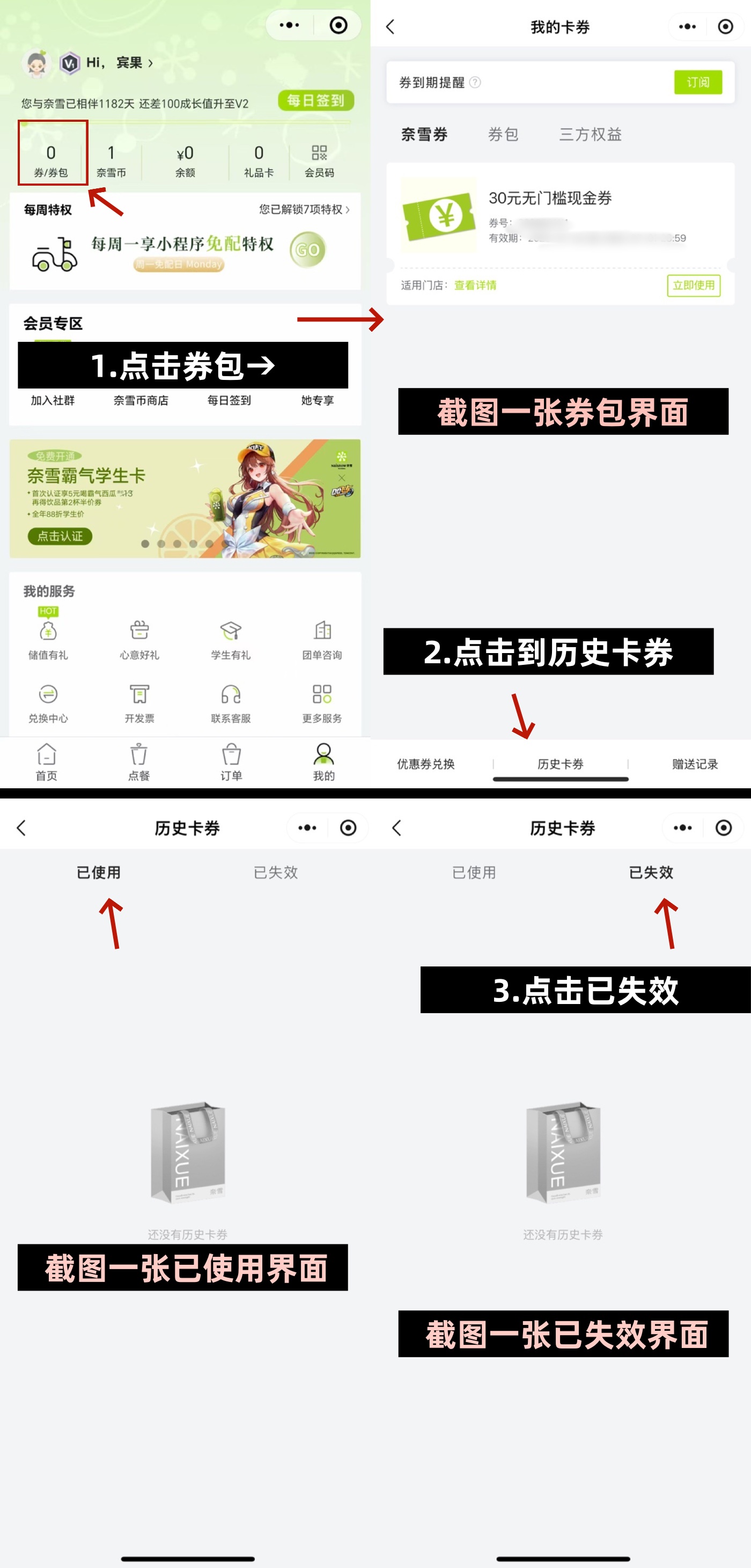 ▸截图一张历史卡券中已使用、和 已失效 ,两个界面