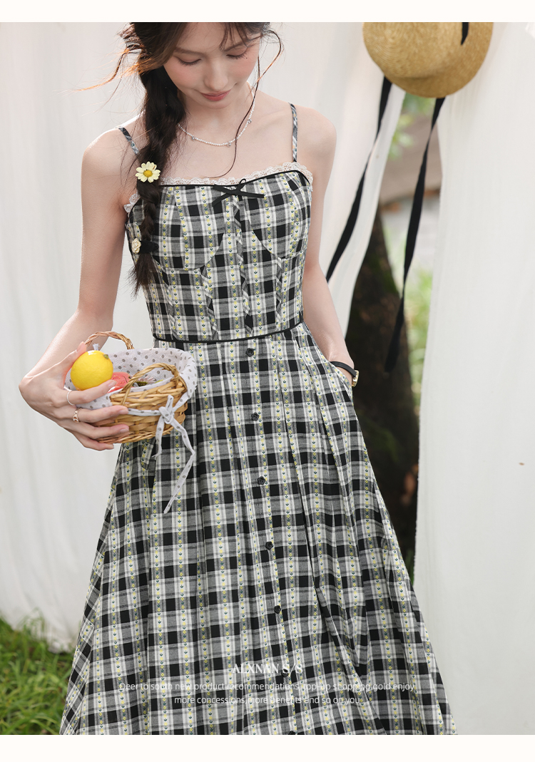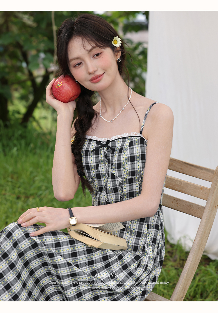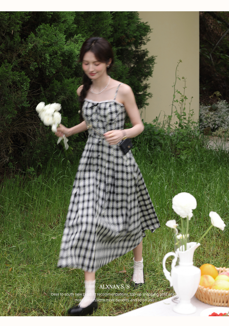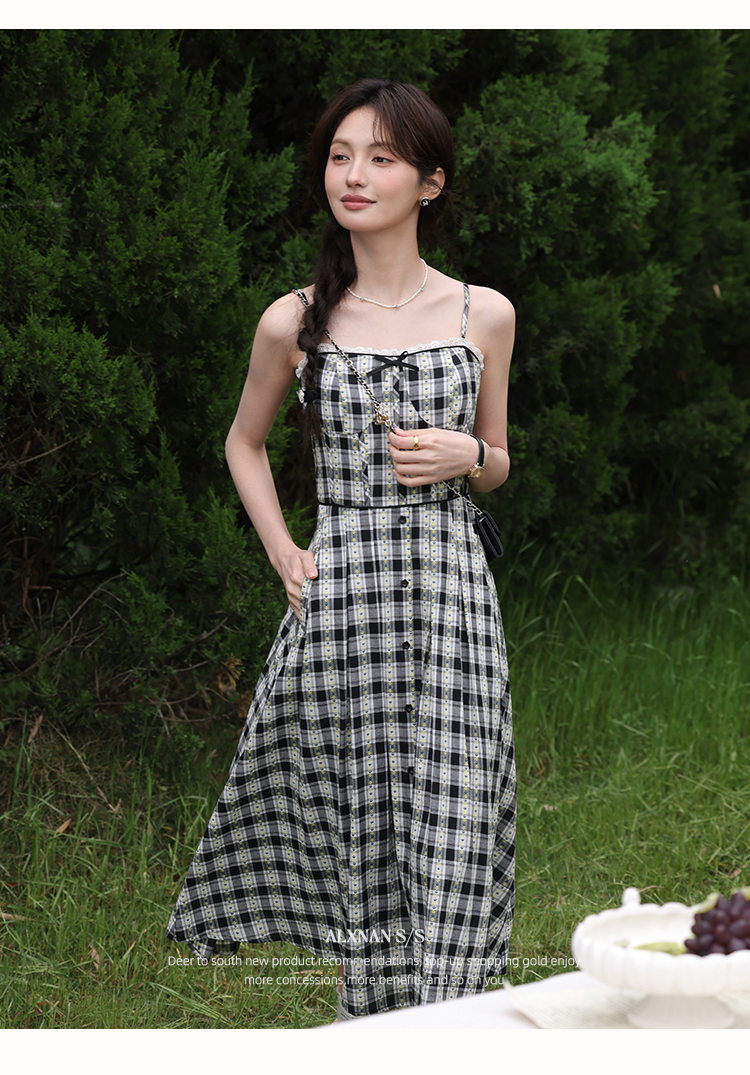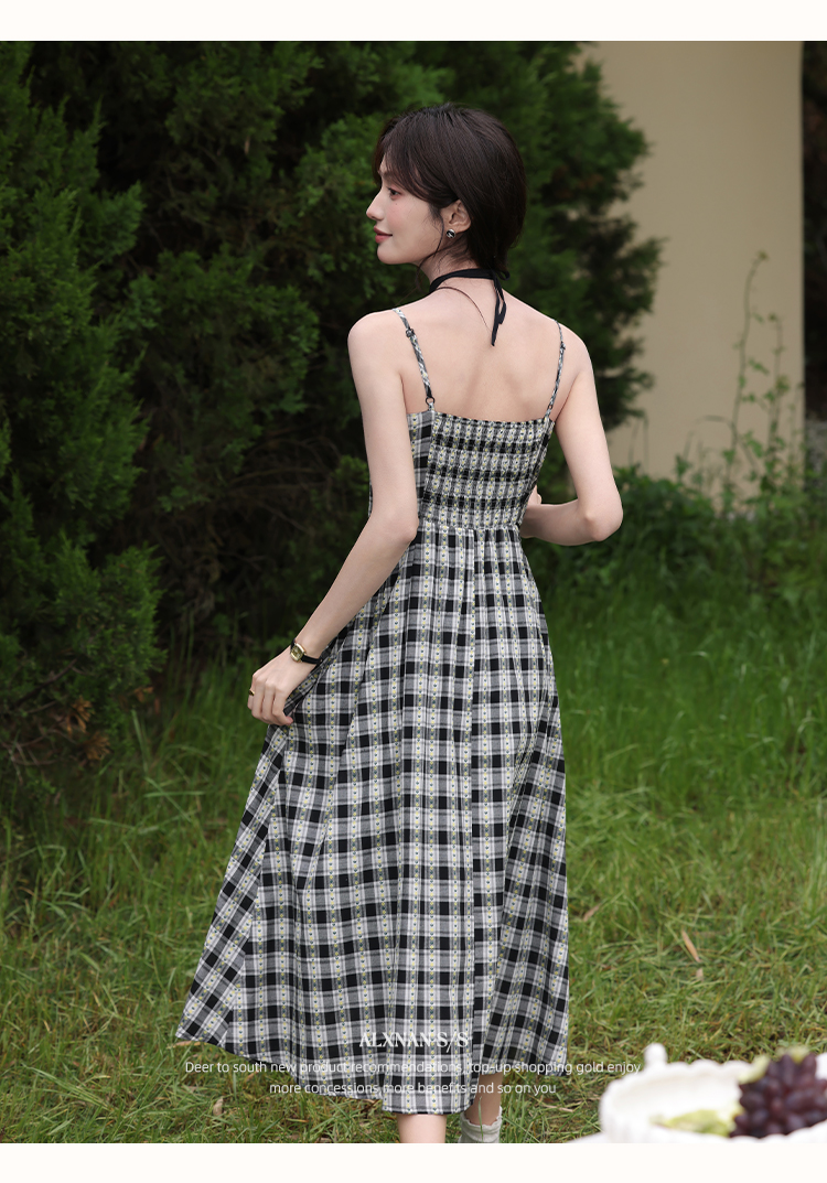 鹿向南「晨露格语」黑色格纹吊带连衣裙夏新款优雅气质显瘦长裙女