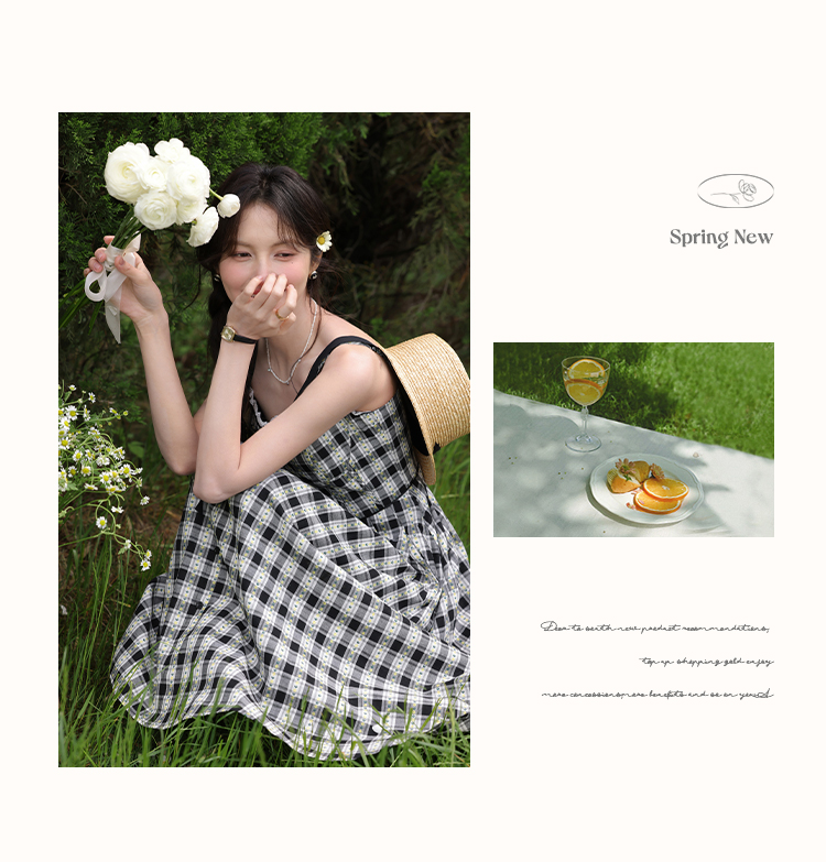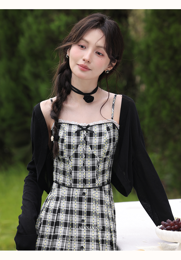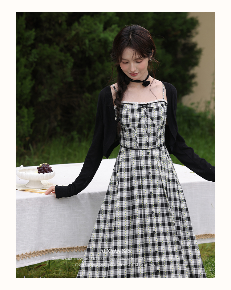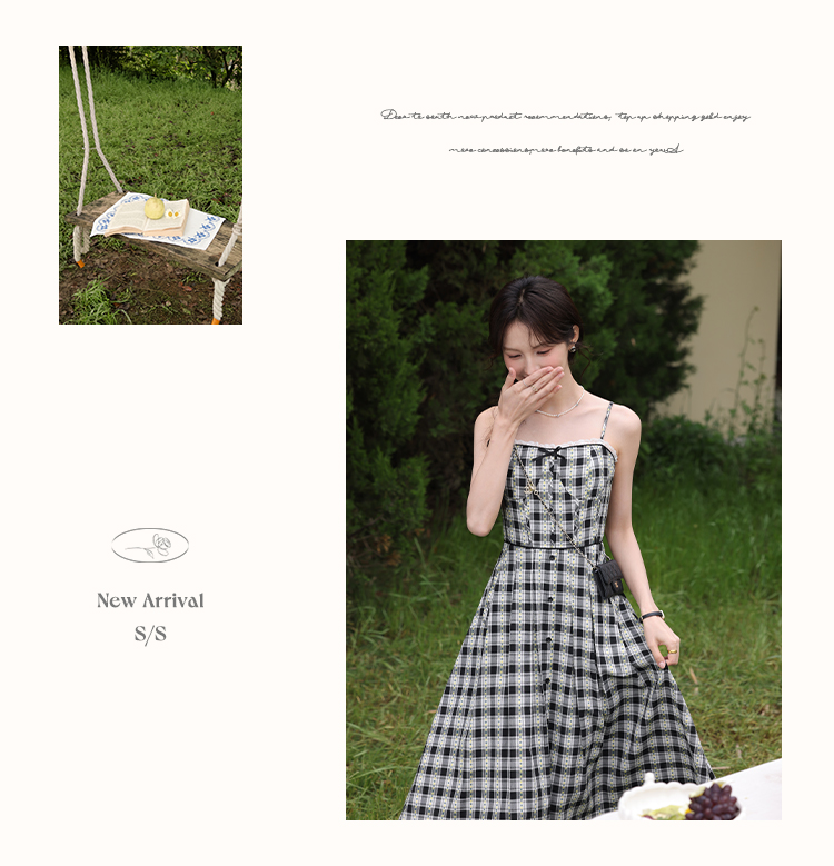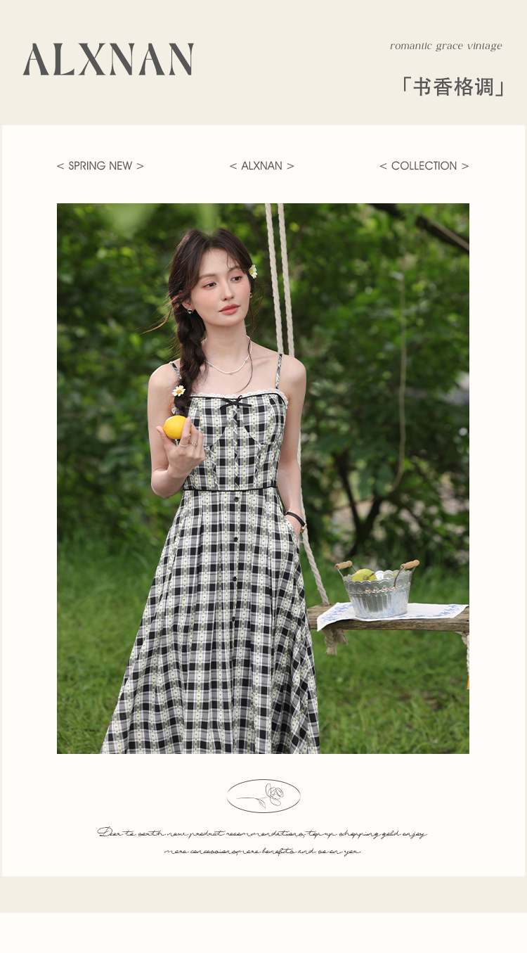 鹿向南「晨露格语」黑色格纹吊带连衣裙夏新款优雅气质显瘦长裙女