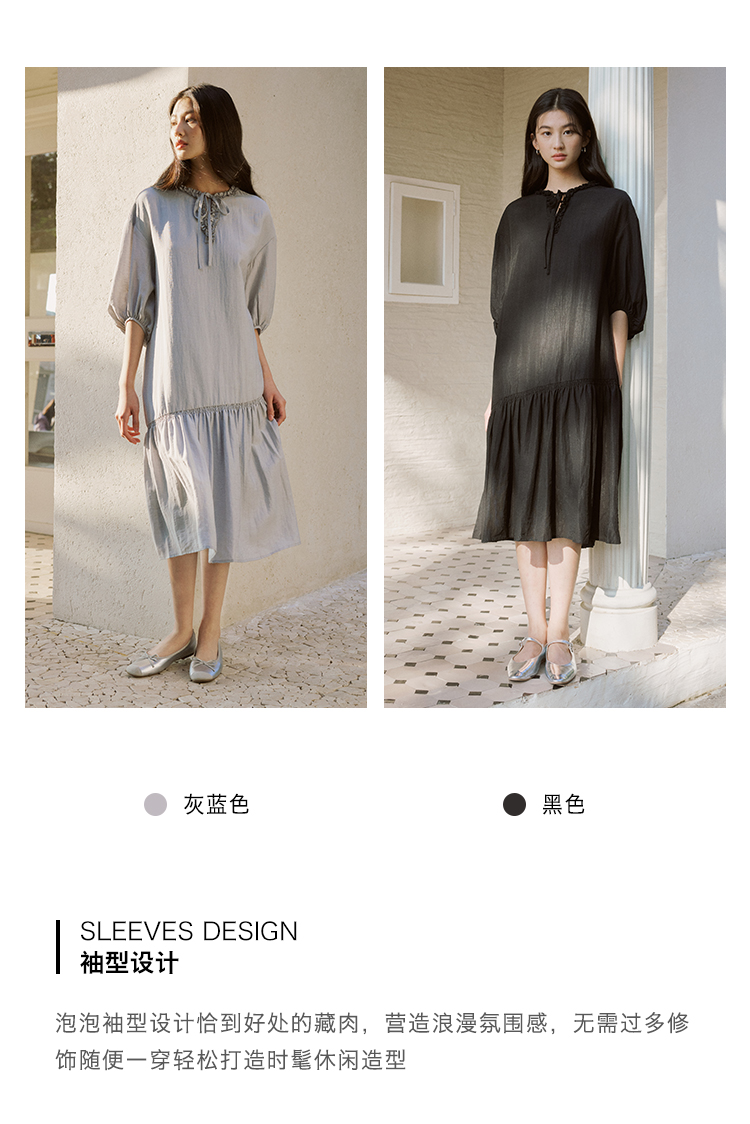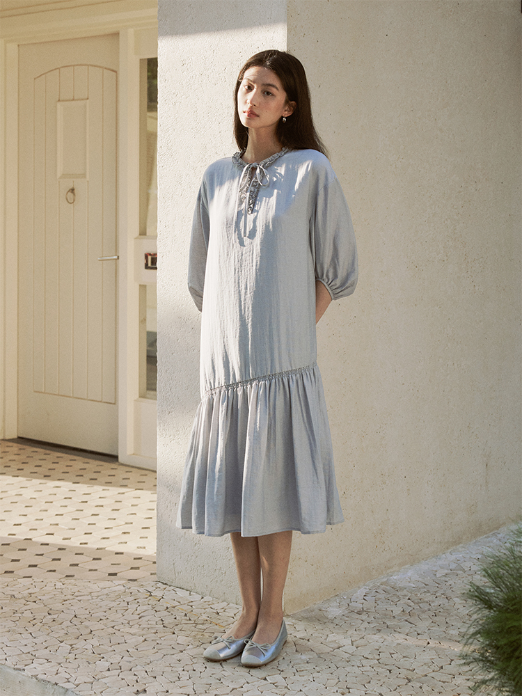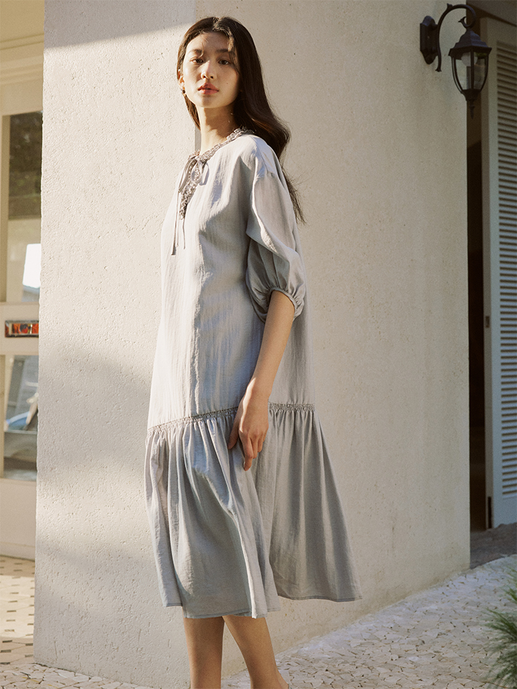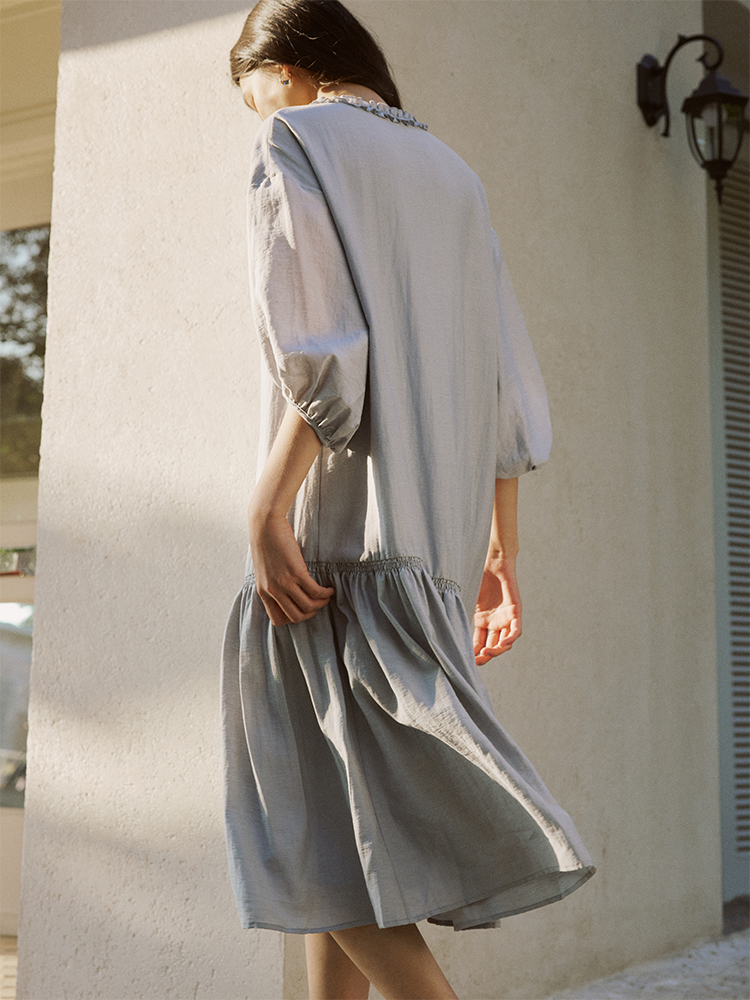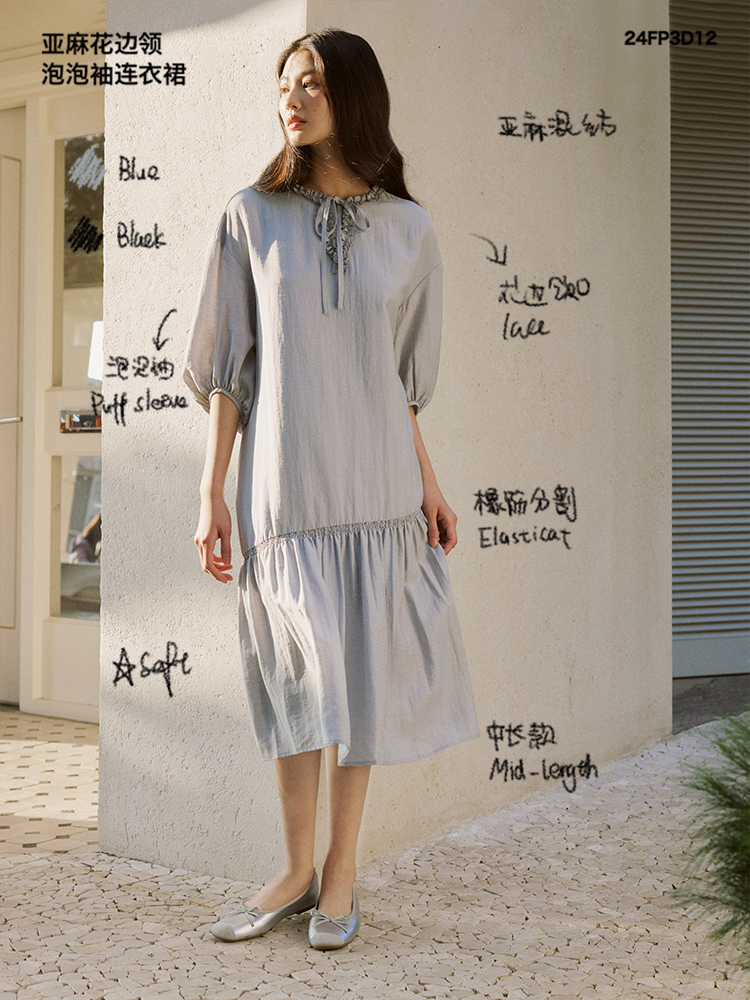 ForPoem 现货 24/SS原创设计春季新款亚麻花边领法式泡泡袖连衣裙女