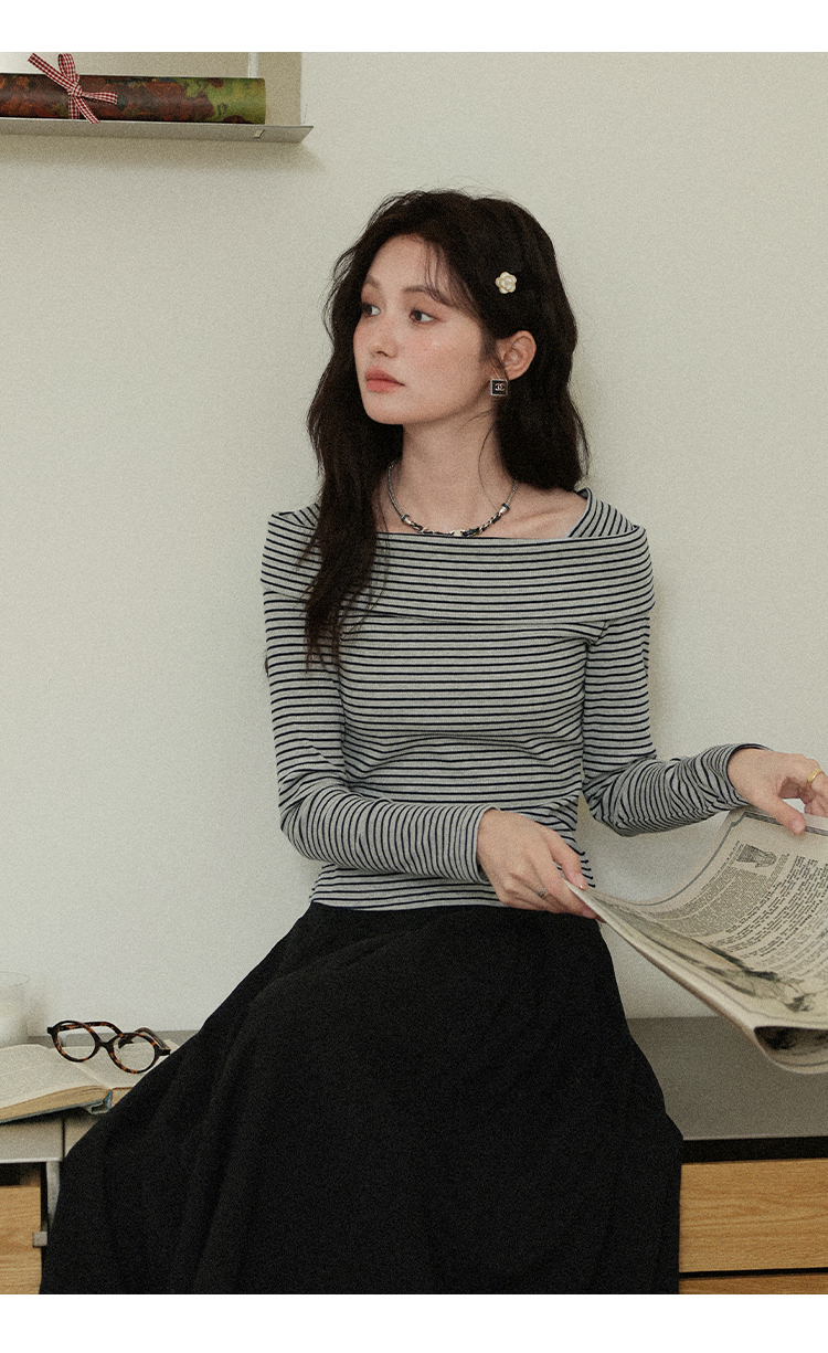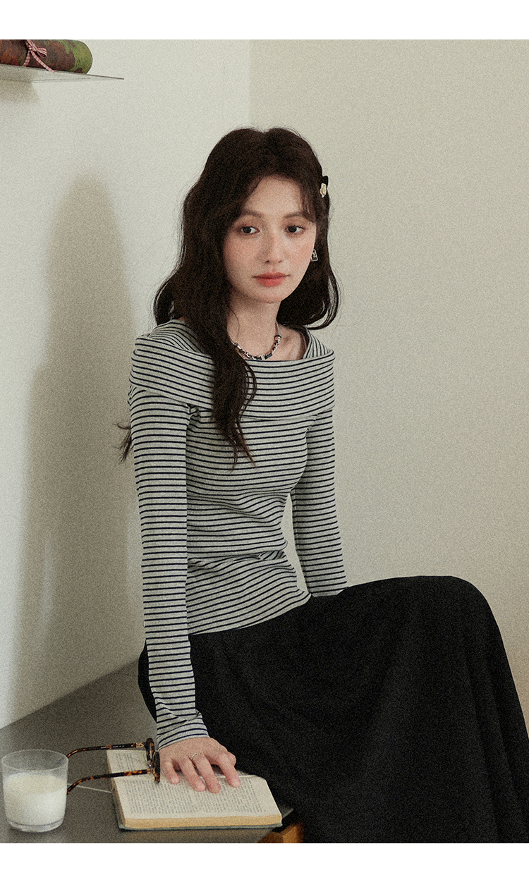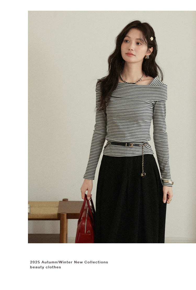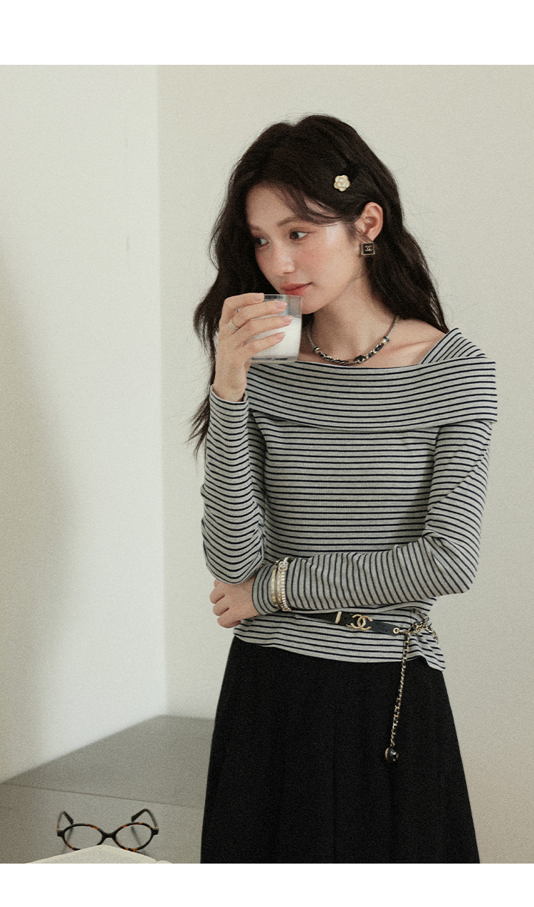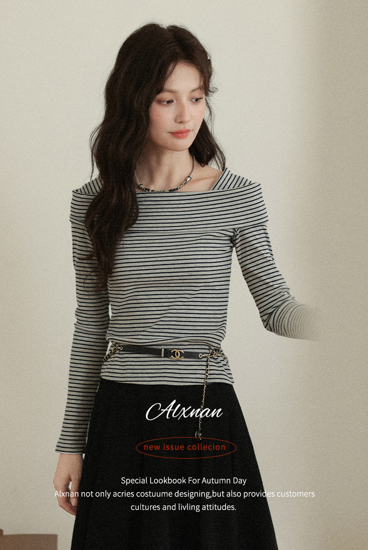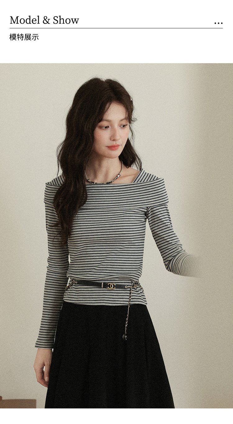 鹿向南「月光灰岩」条纹一字肩T恤女款早秋别致百搭显瘦长袖上衣L56880