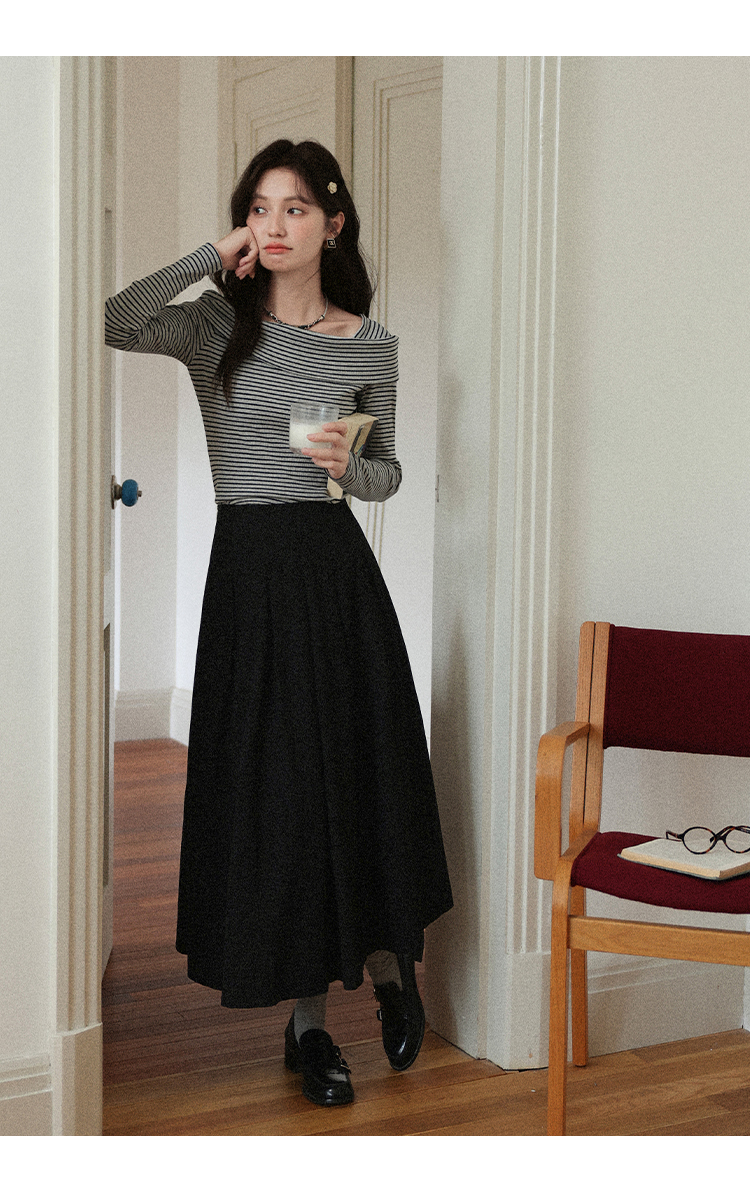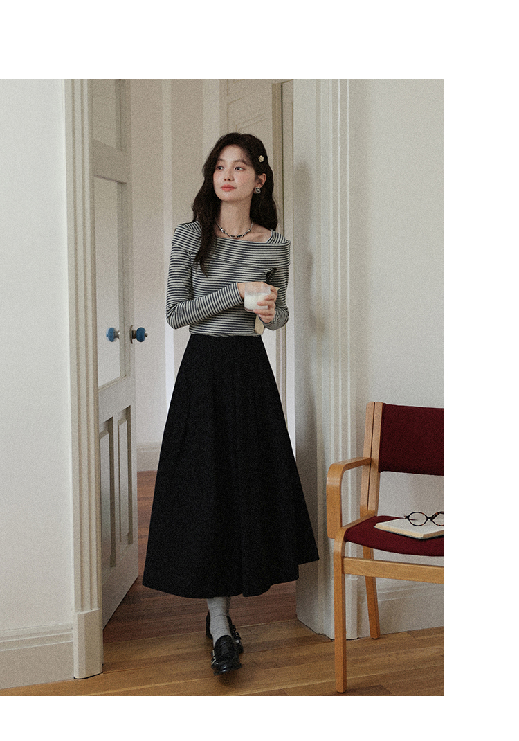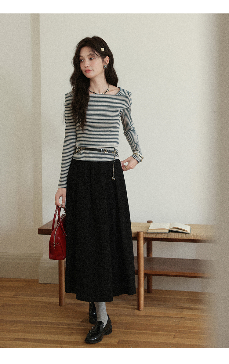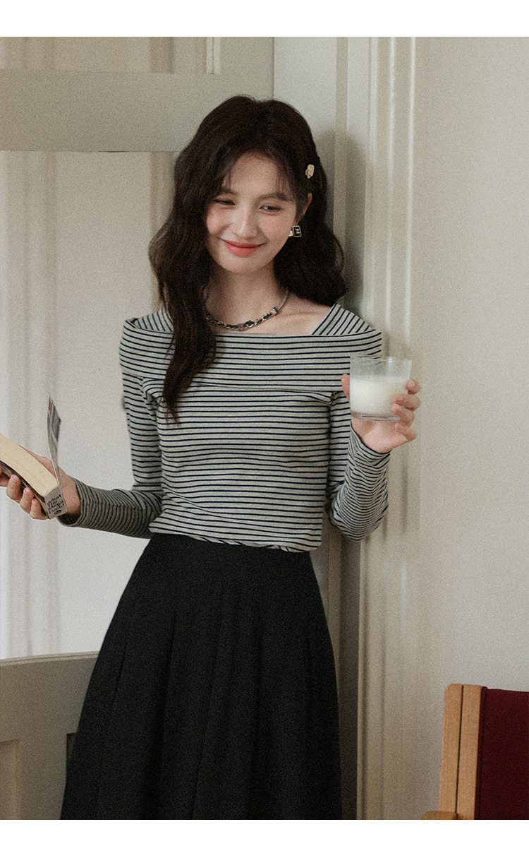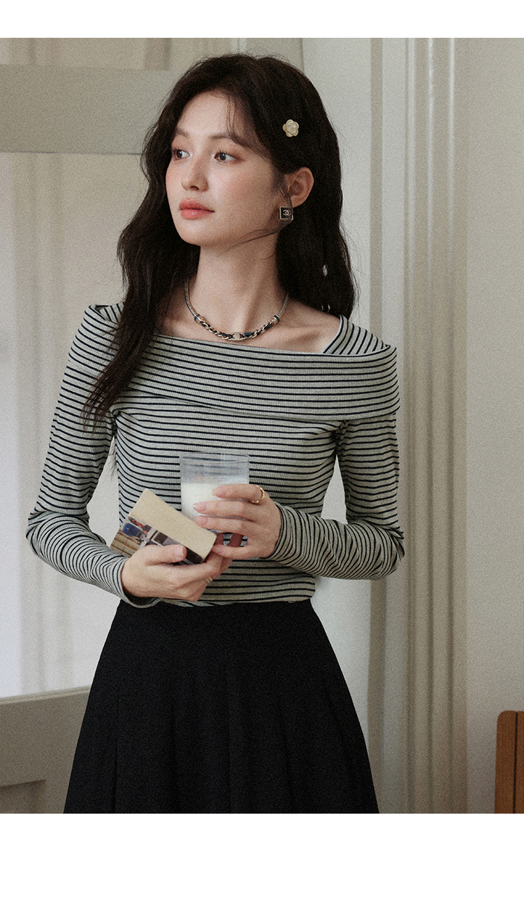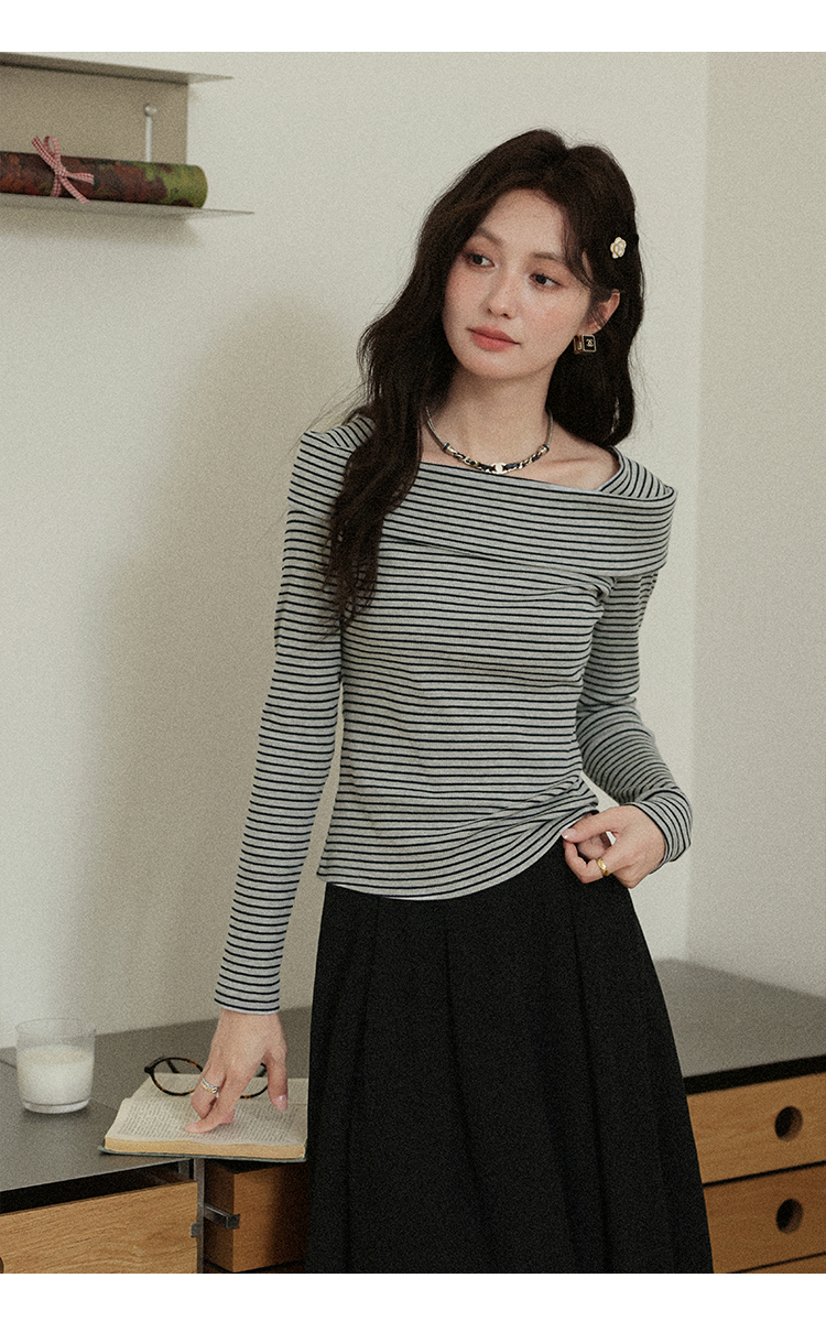 鹿向南「月光灰岩」条纹一字肩T恤女款早秋别致百搭显瘦长袖上衣L56880
