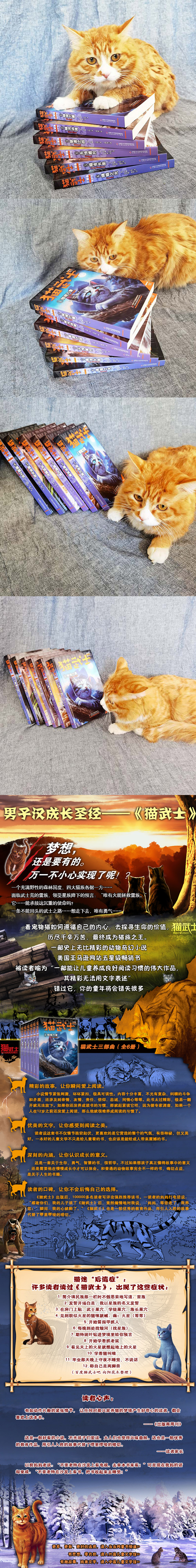 这是一部旷世奇作,把猫的众生相雕刻得栩栩如生。作品讲述的是一只宠物猫回归自由野性生活,凭借勇气、智慧、正直的品格*终成为族群领袖的励志传奇故事。亲情、友情、爱情、正义、邪恶、悬疑,还有更多更多,全部都融合在这一套书里。你如果错过,就会失去许多快乐,会后悔不迭。没看过这套书,千万别说你认识猫!