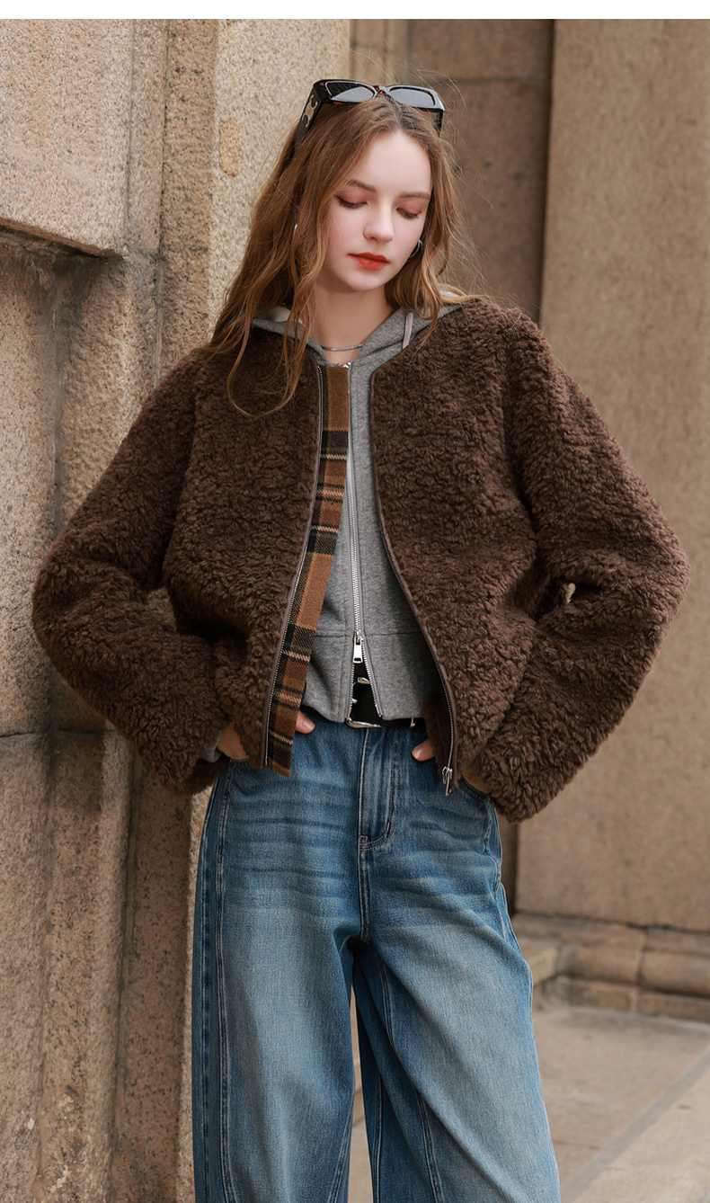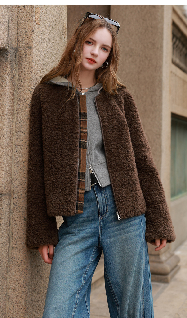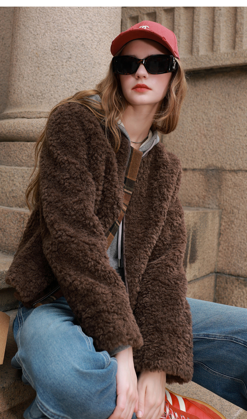 三彩2025冬季新款环保皮草圆领拼接毛毛外套短款休闲M