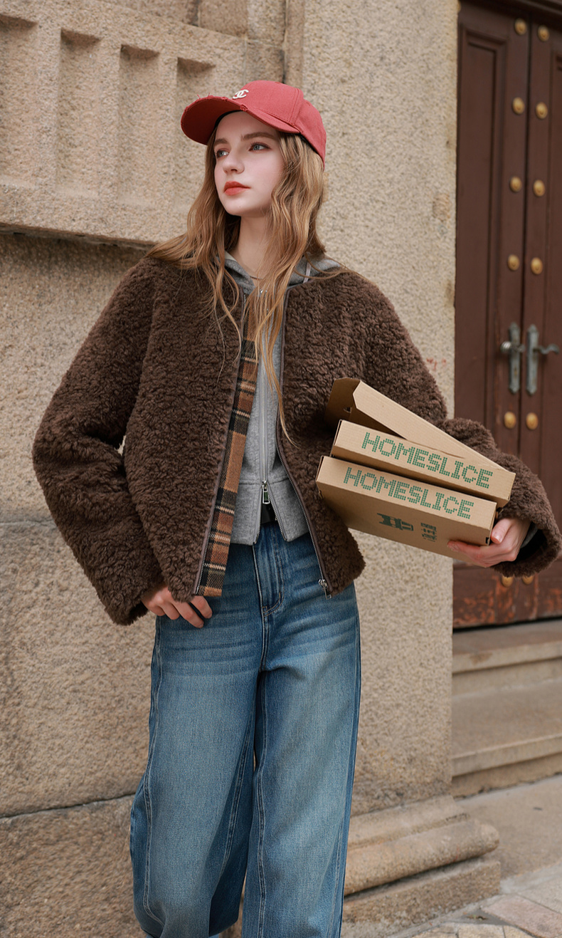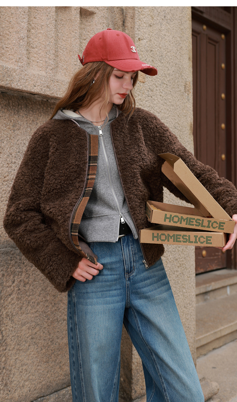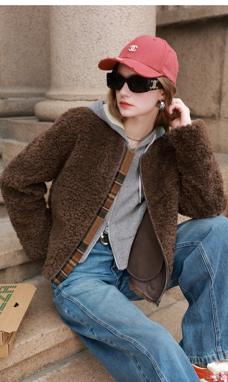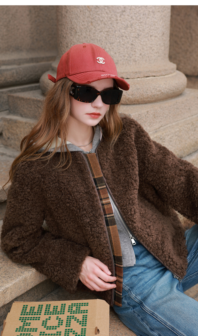 三彩2025冬季新款环保皮草圆领拼接毛毛外套短款休闲M