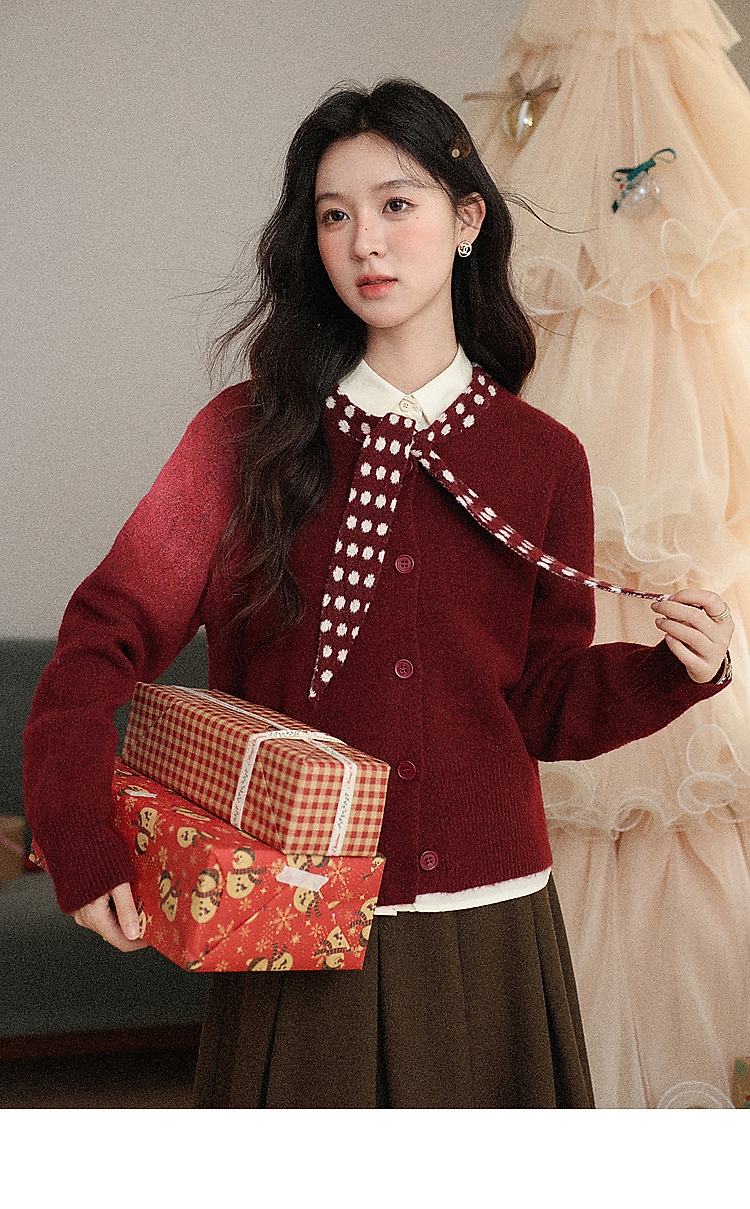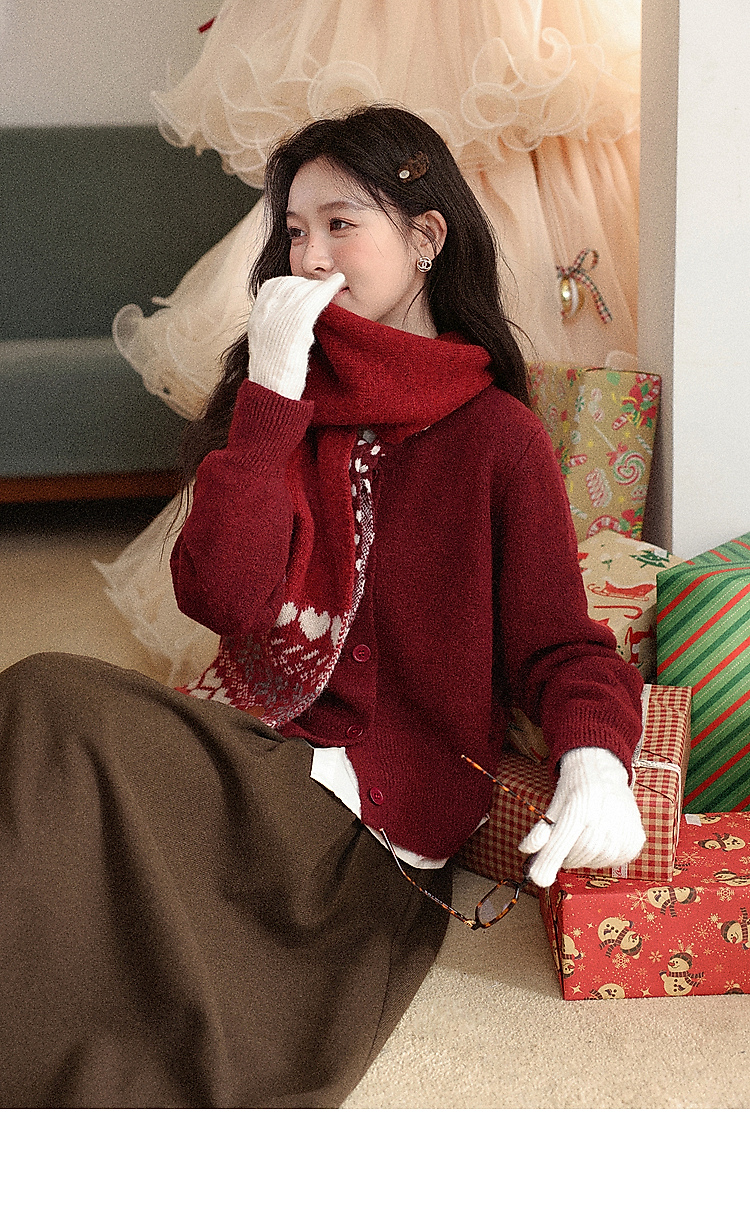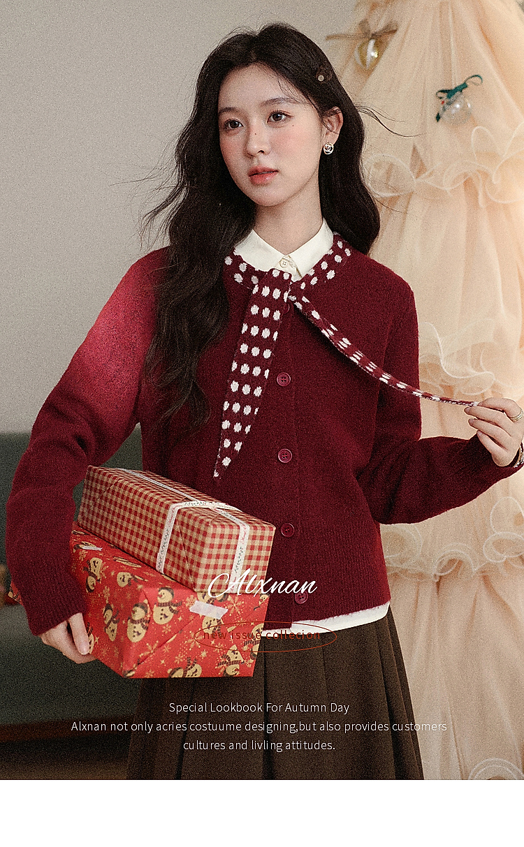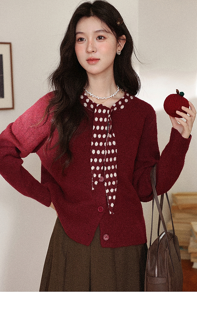 鹿向南「清欢渡月」法式洋气红色毛衣女秋冬时尚长袖开衫短款上衣