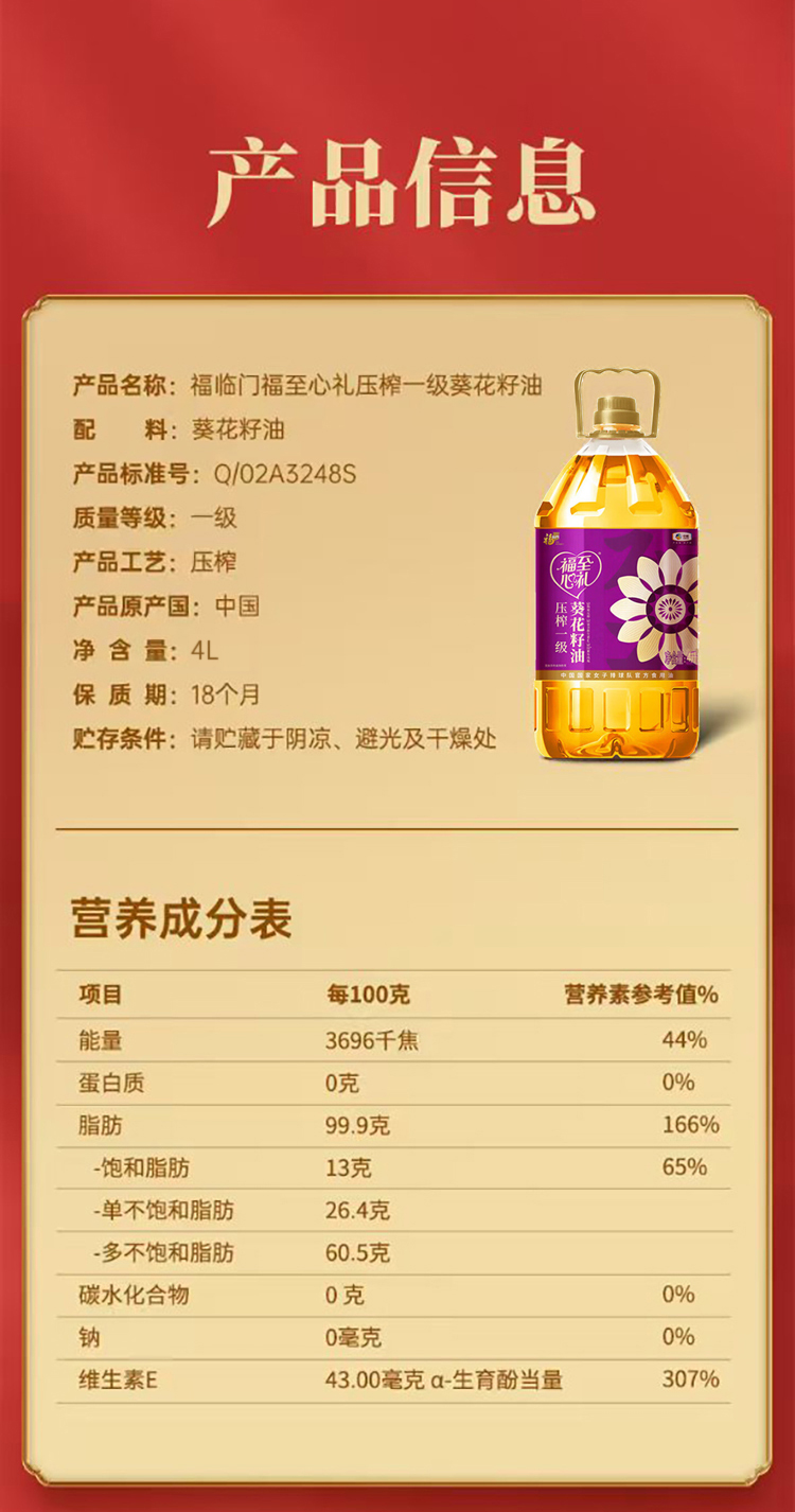 中粮福临门福至心礼压榨一级葵花籽油4L