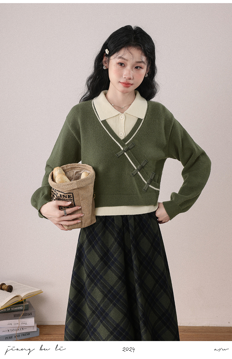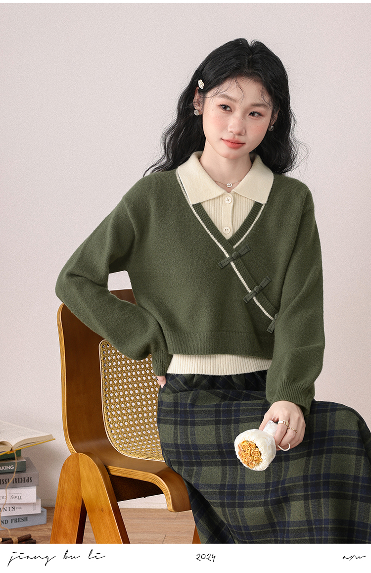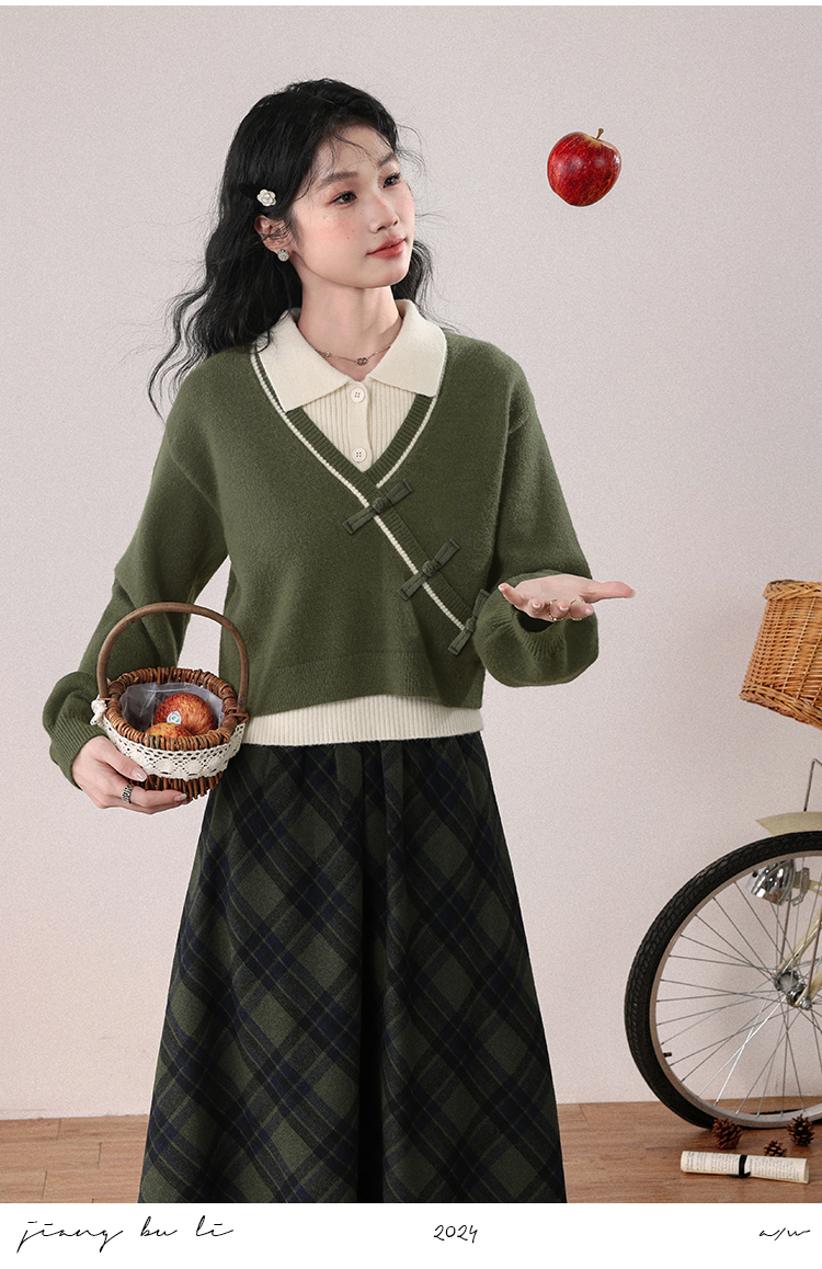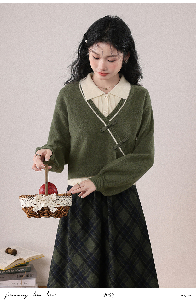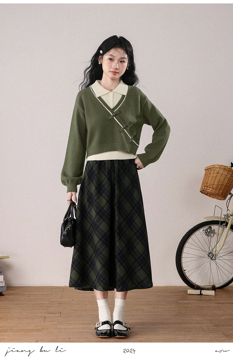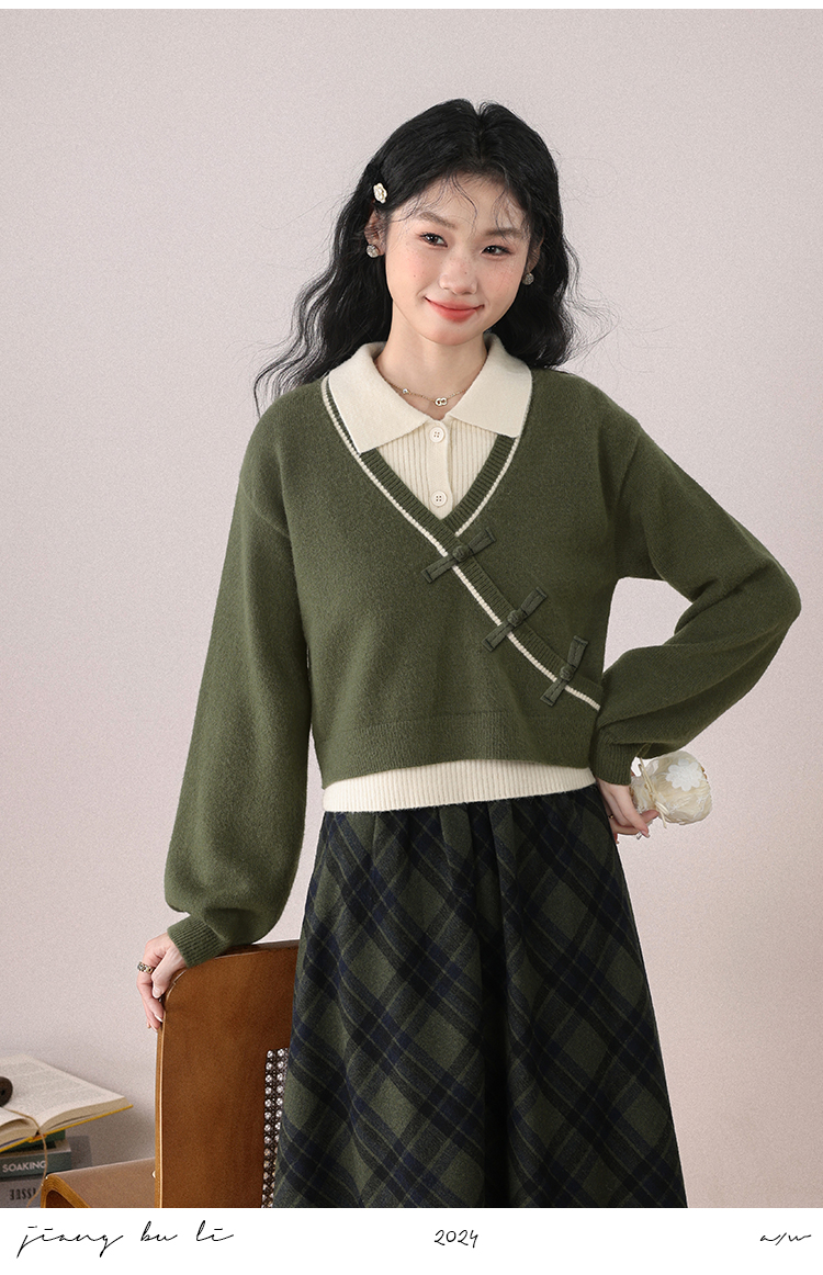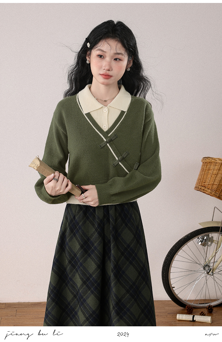 鹿向南「绿隐藏蝶」新中式假两件慵懒风毛衣秋冬针织衫&半身裙