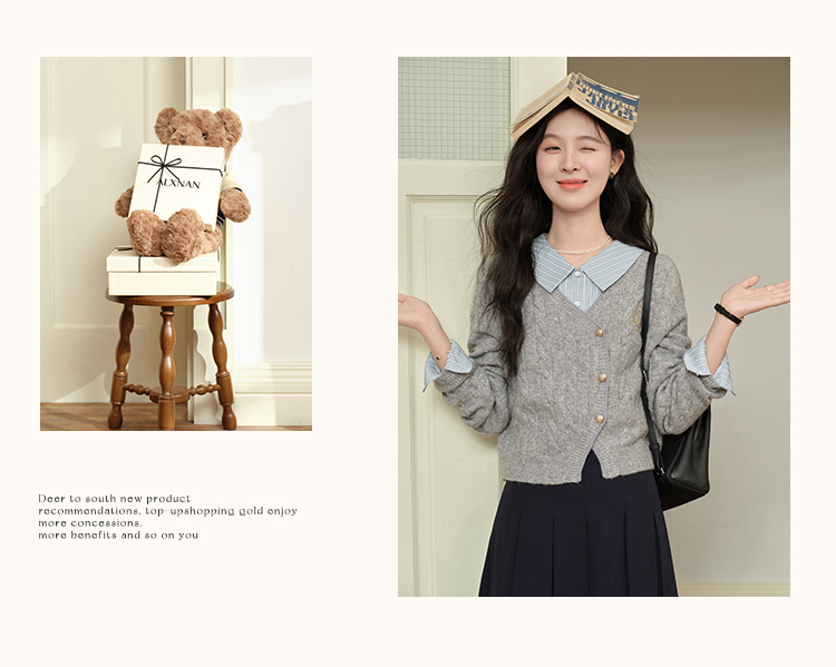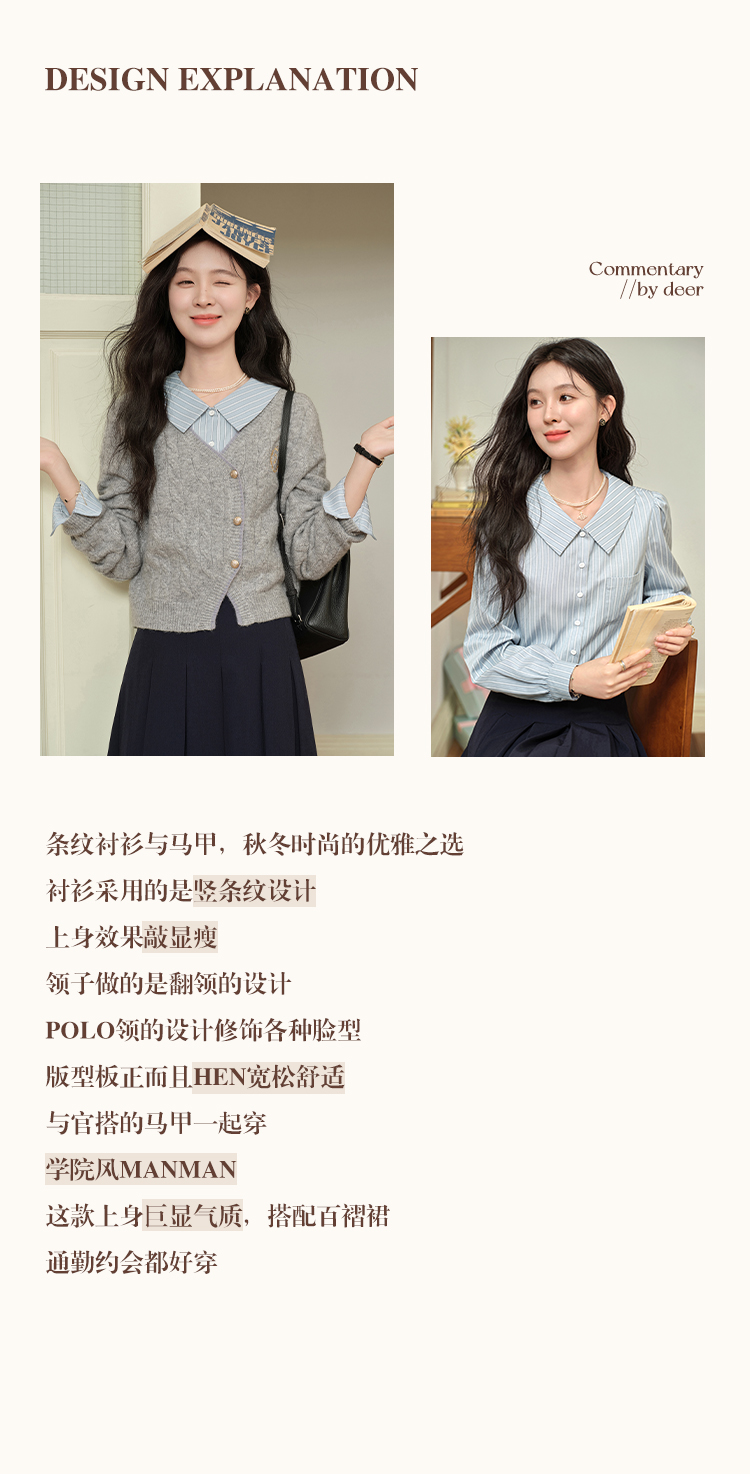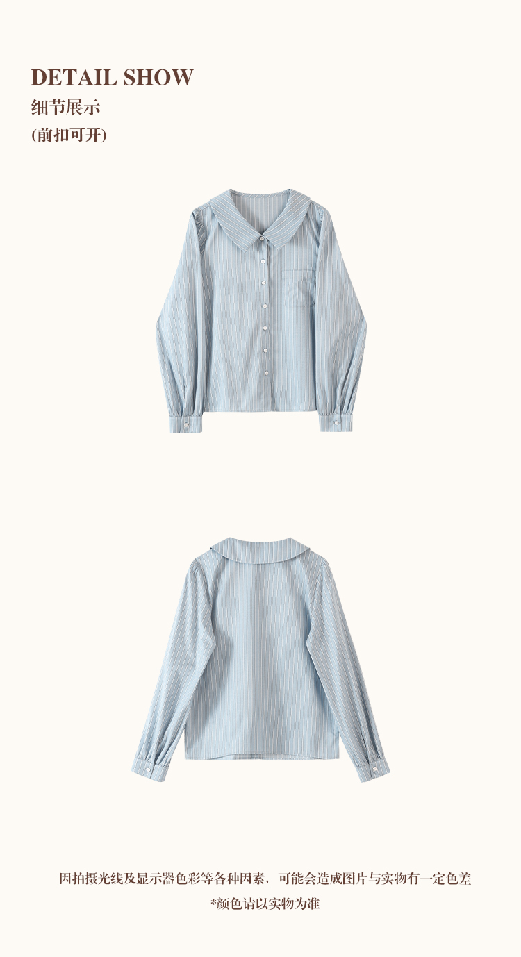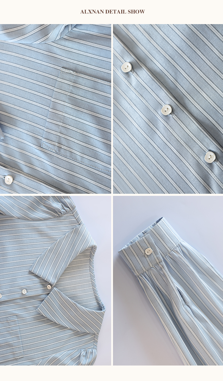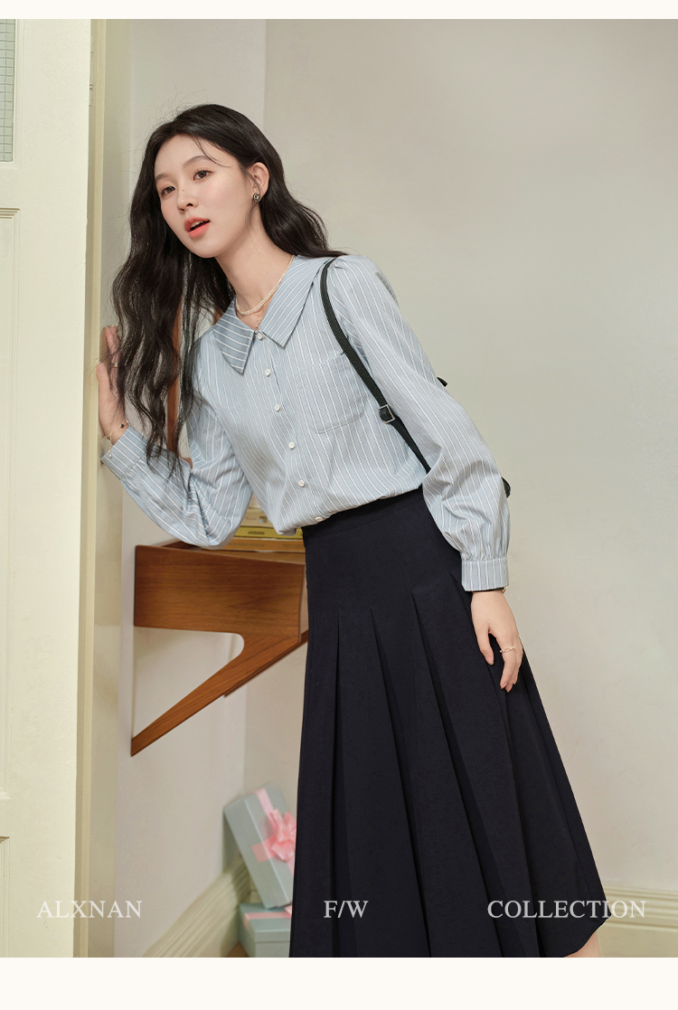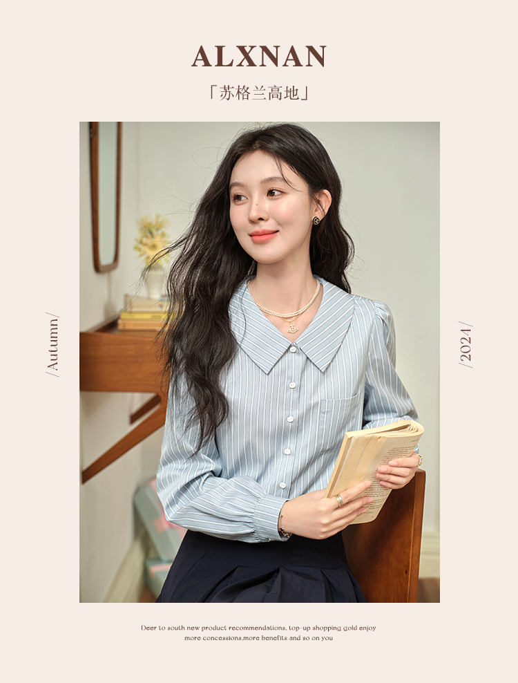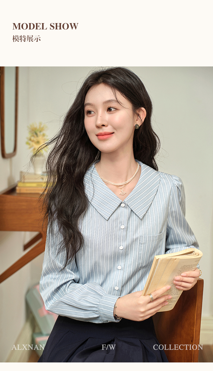 鹿向南「苏格兰高地」法式蓝色翻领条纹衬衫女秋季新款内搭衬衣