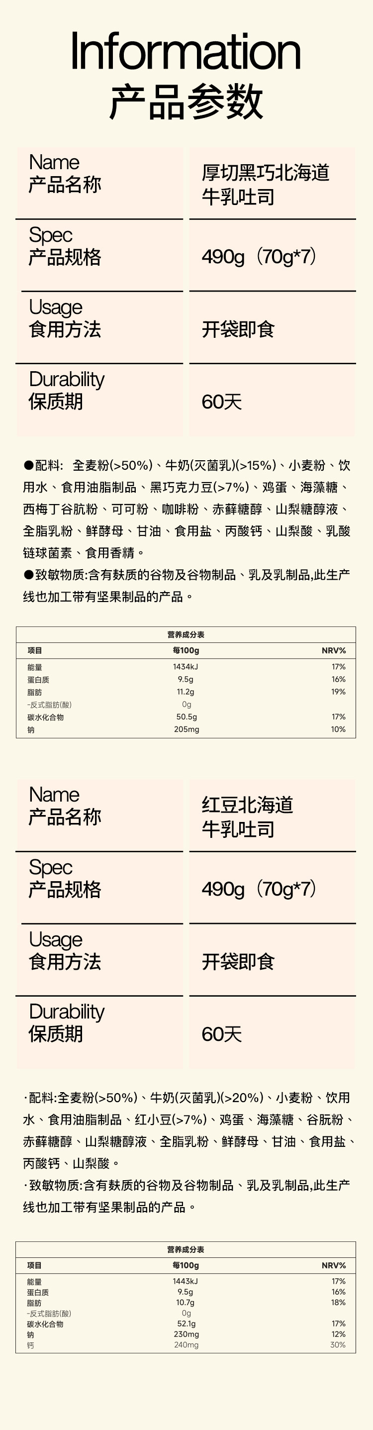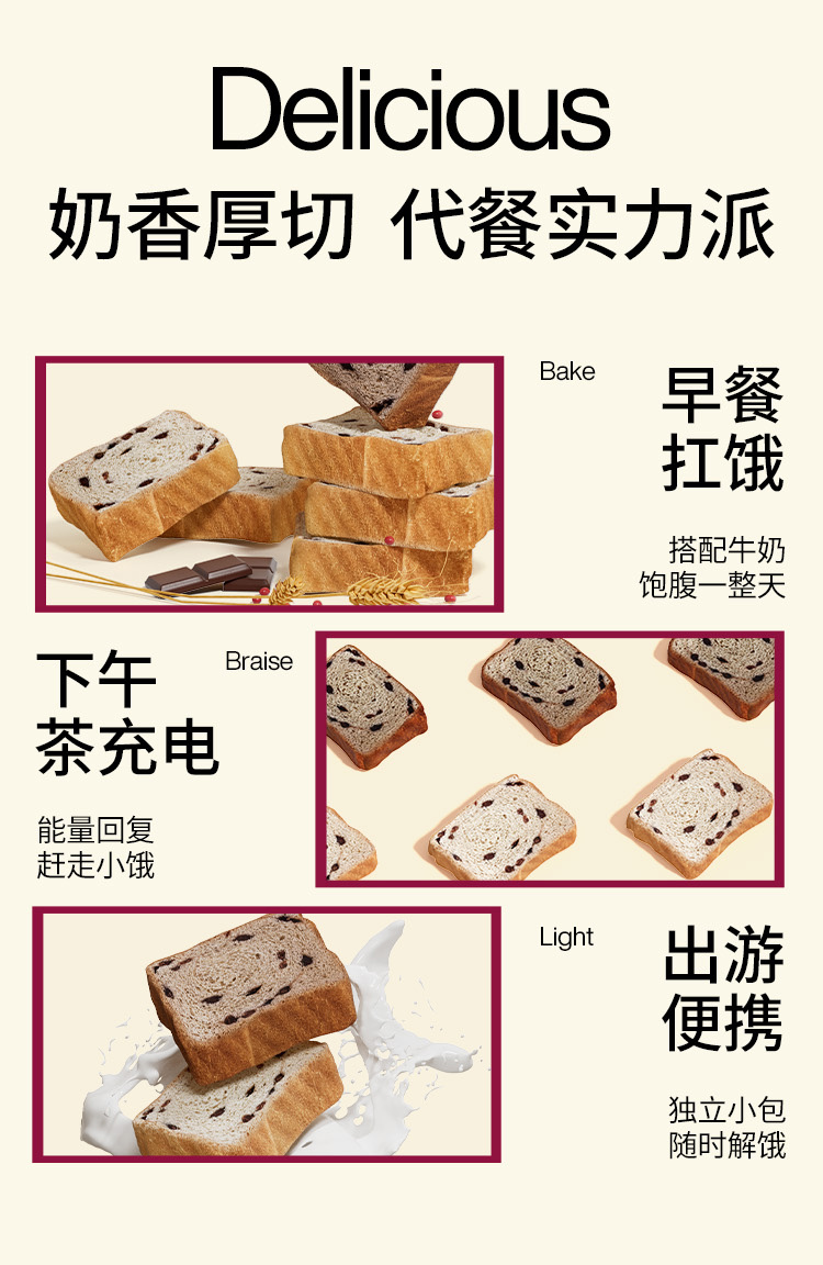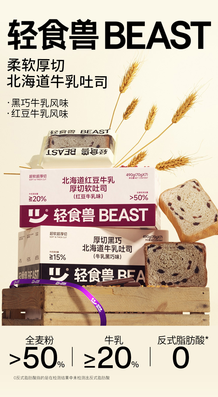 【轻食兽】厚切牛乳吐司 490g/箱7包 黑麦西梅/北海道黑巧牛乳/北海道红豆牛乳