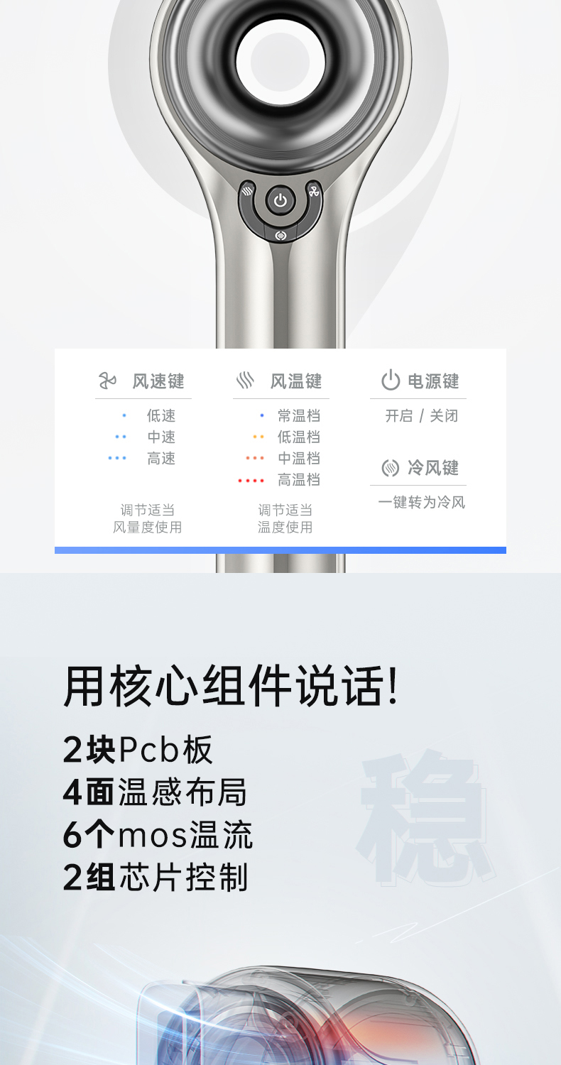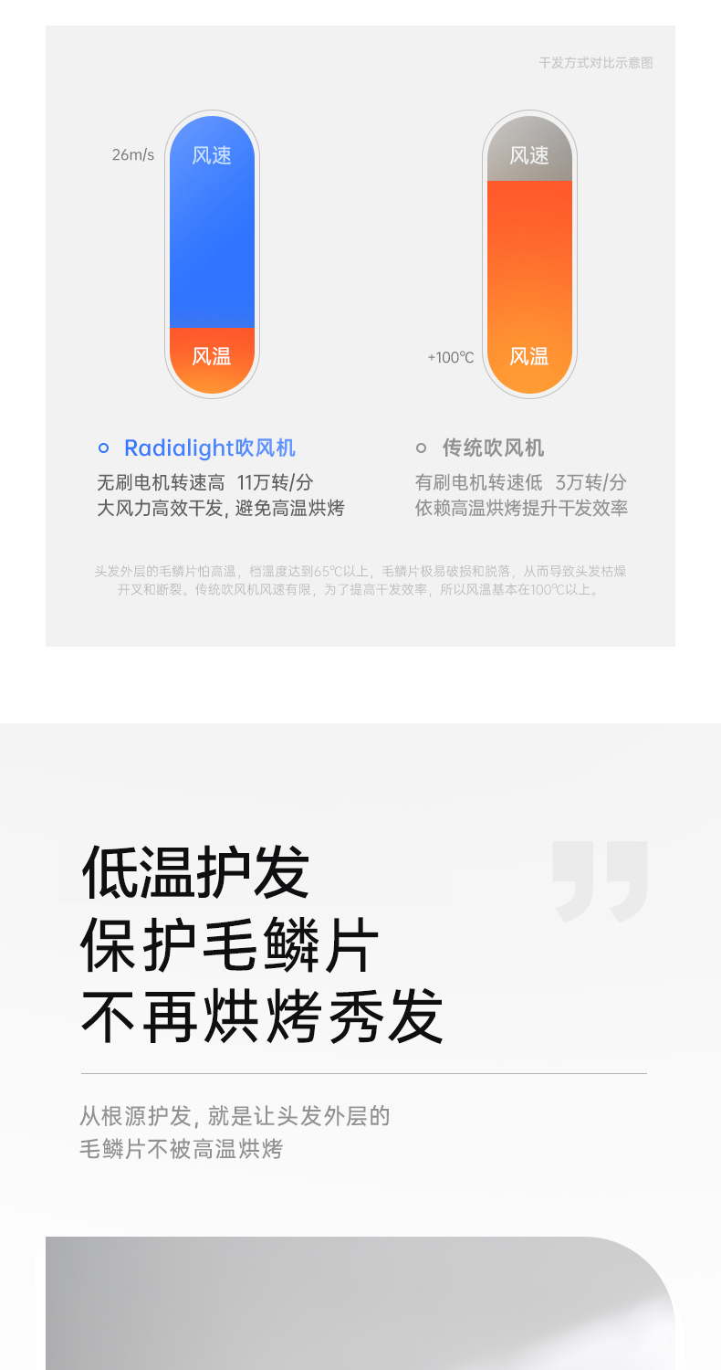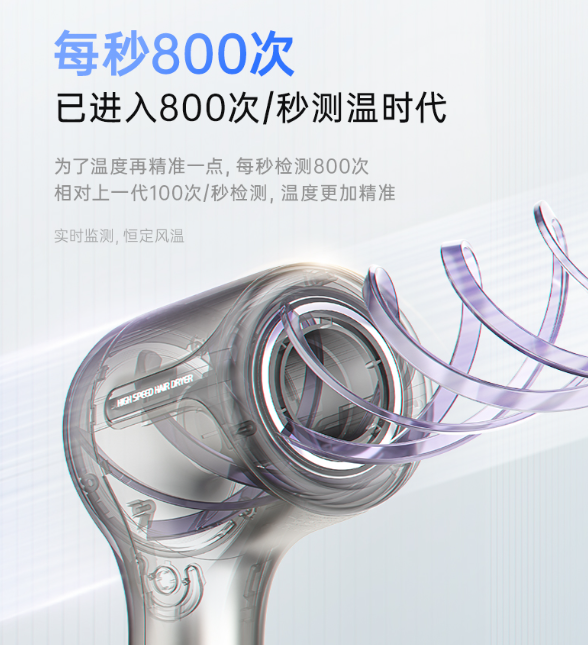 每分钟11万转高风速!还是恒温送风,最大档位温度不超60°(皮肤科专家建议最佳干发温度为60°以内,57℃最佳),