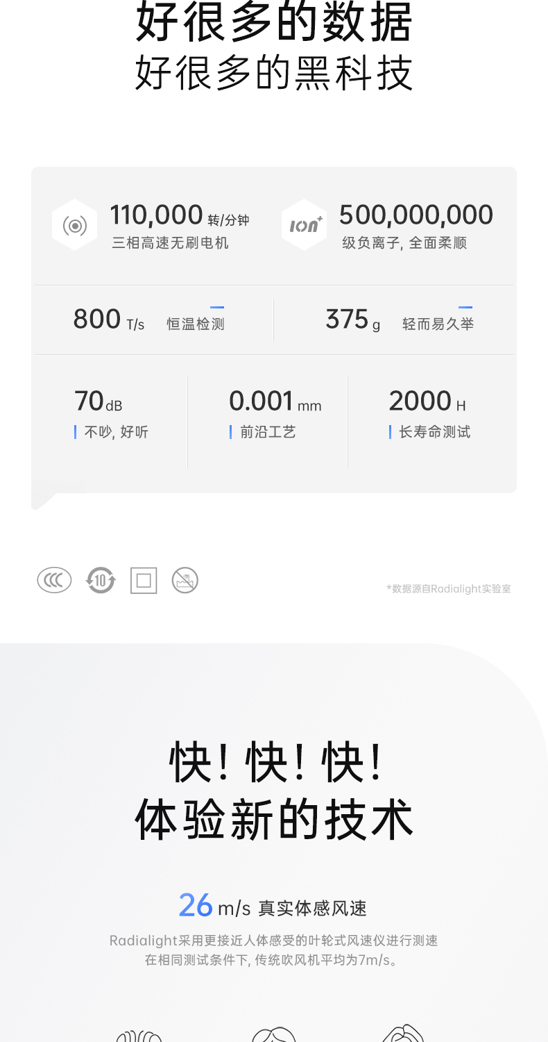 跟戴S的电机转速一样,radialight高速吹风机,使用的是转速稳定达到11万转/分钟的电机!