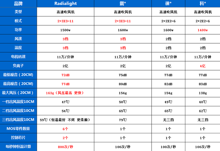 为此我还特地收集了几款同样是11万转速的吹风机品牌官方的数据,作为参考;
