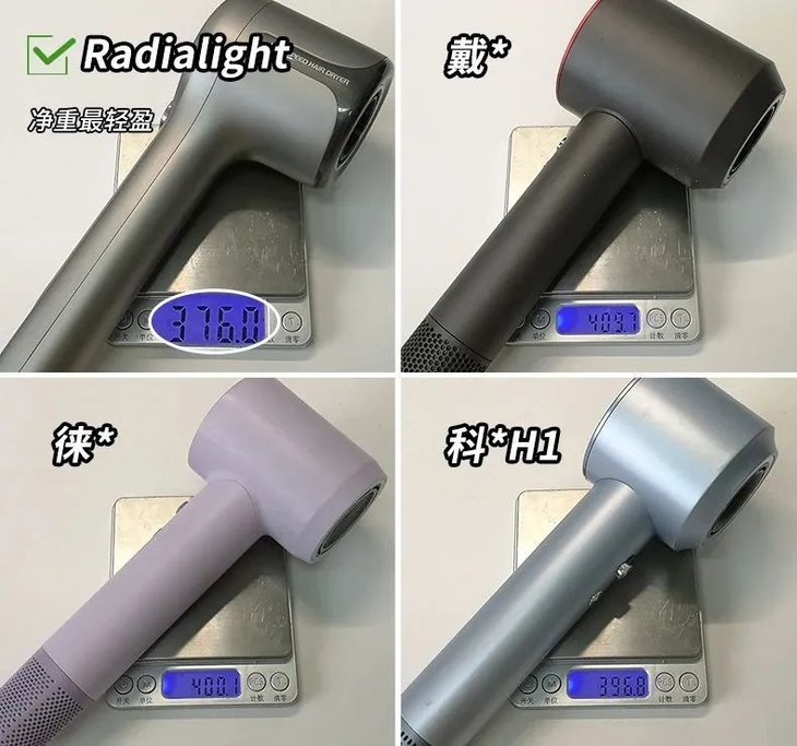 我翻了我们家以往买的吹风机放在一块比较,在重量这块,radialight依旧保持这亮眼的成绩!