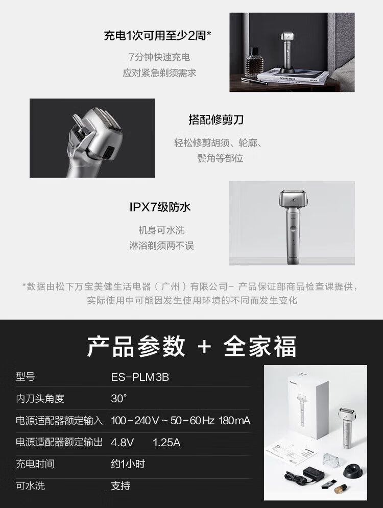 松下(Panasonic)小锤子电动剃须刀 男士充电往复立体浮动式刀头 高速磁悬浮马达ES-PLM3BS405