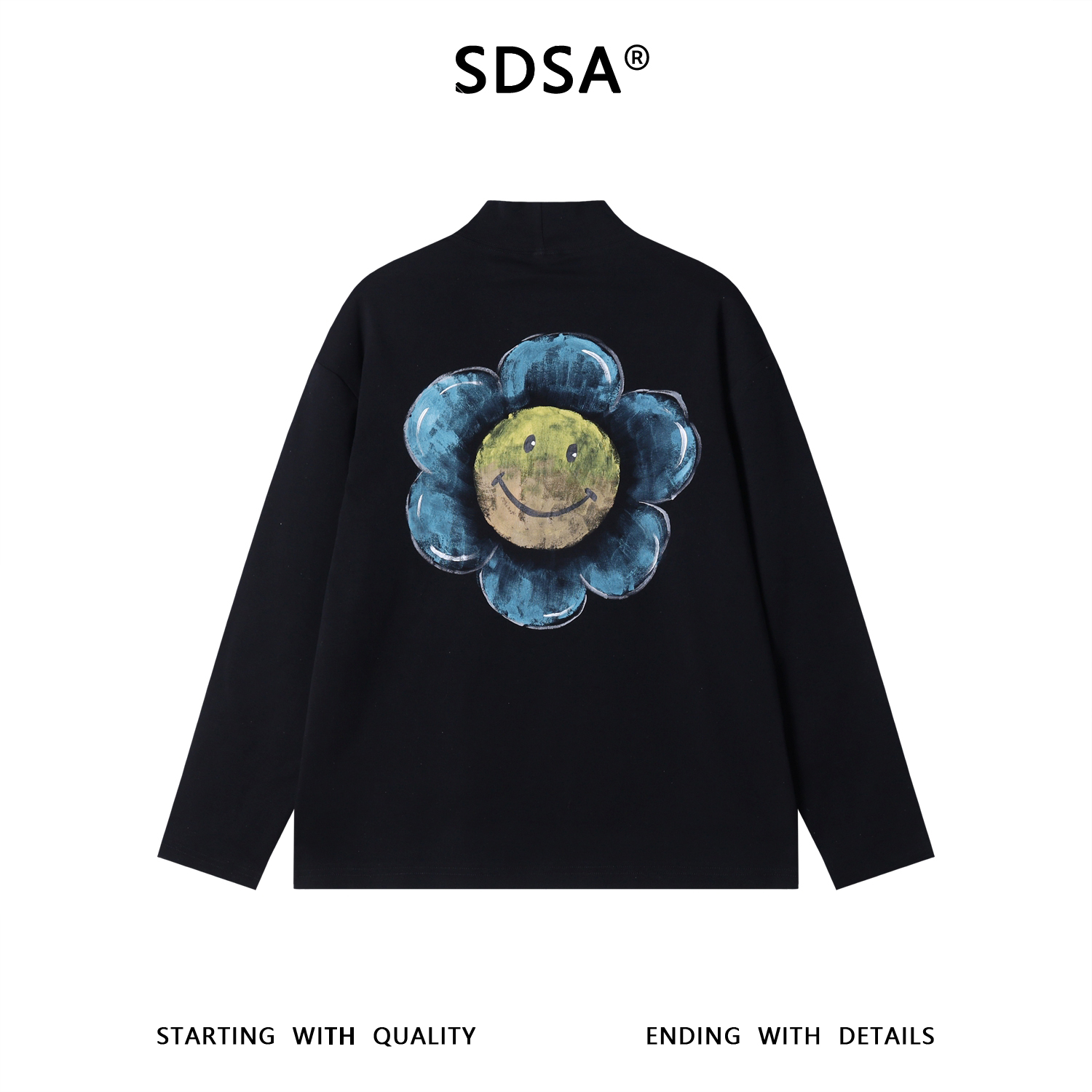 SDSA秋冬新款痞帅男装潮牌手绘花朵字母印花半高领长袖T恤百搭