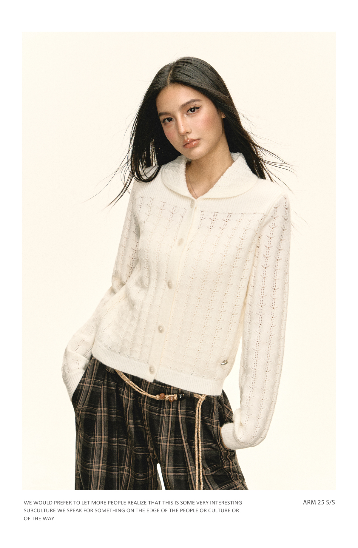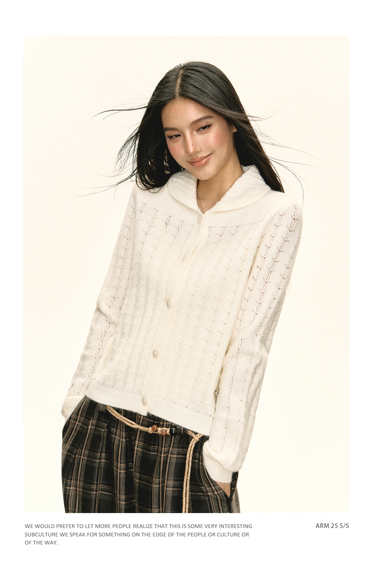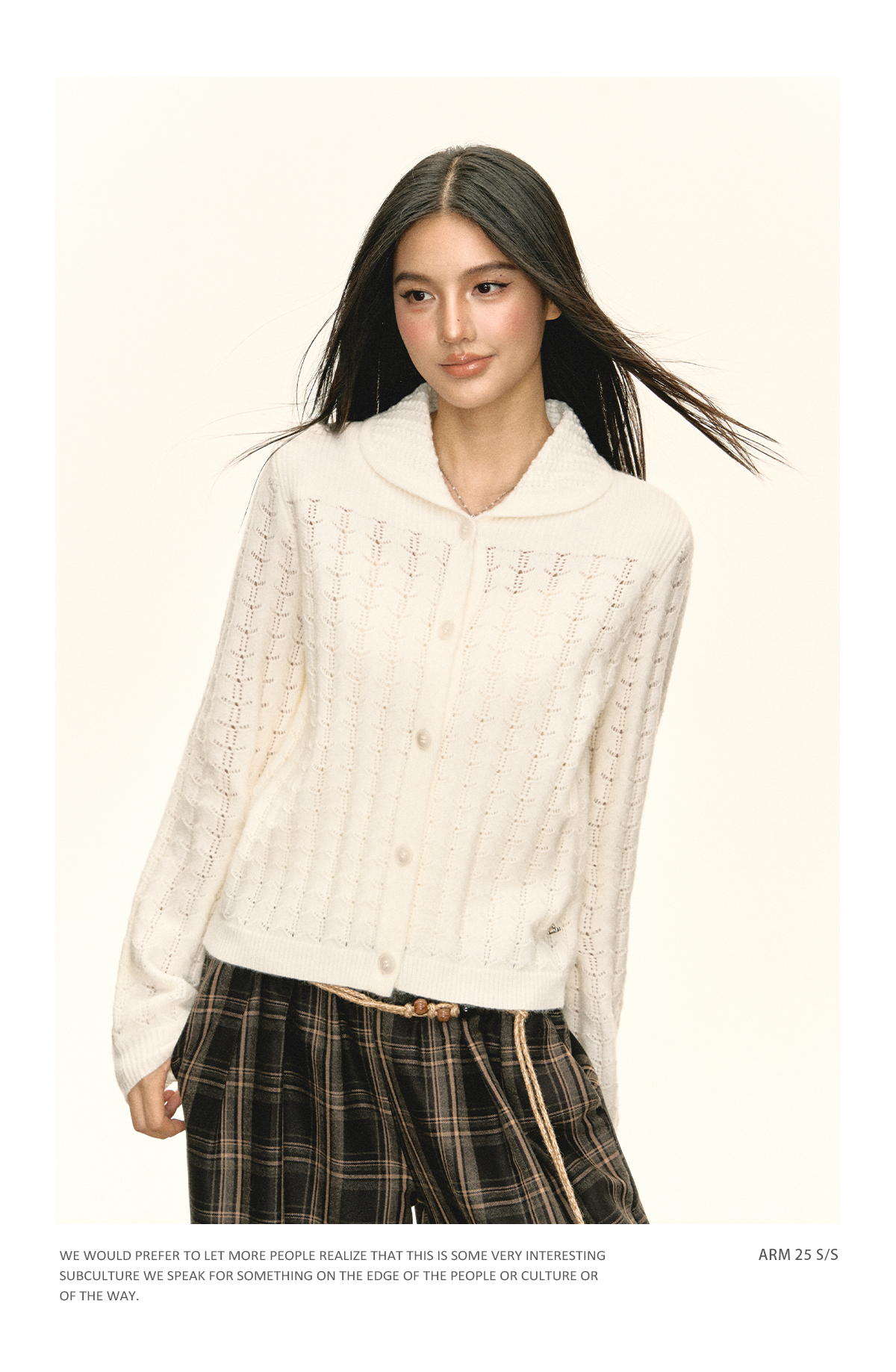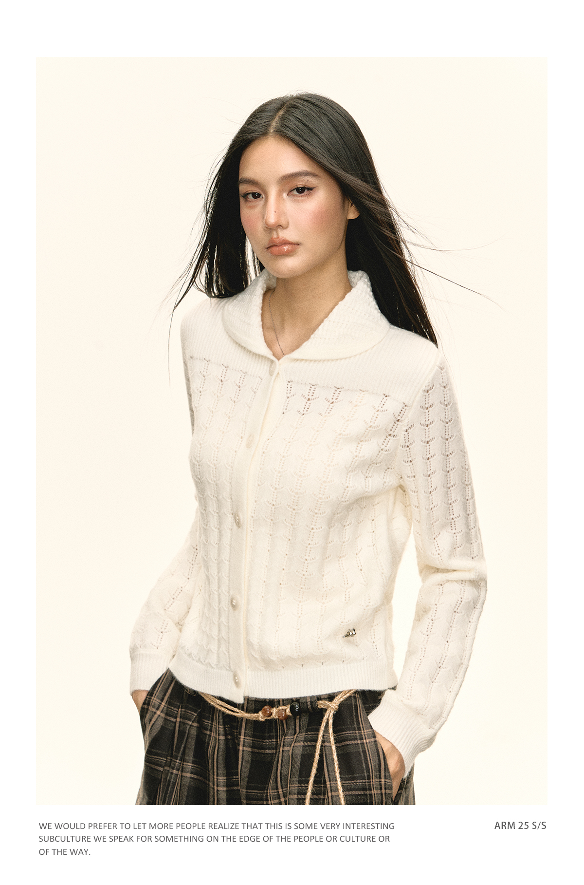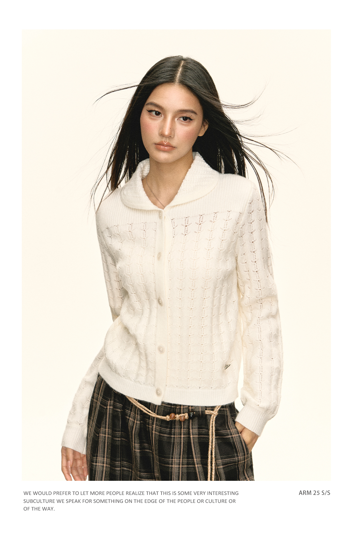 Ariseism 美式复古白色镂空针织开衫毛衣女秋季新款修身上衣外套