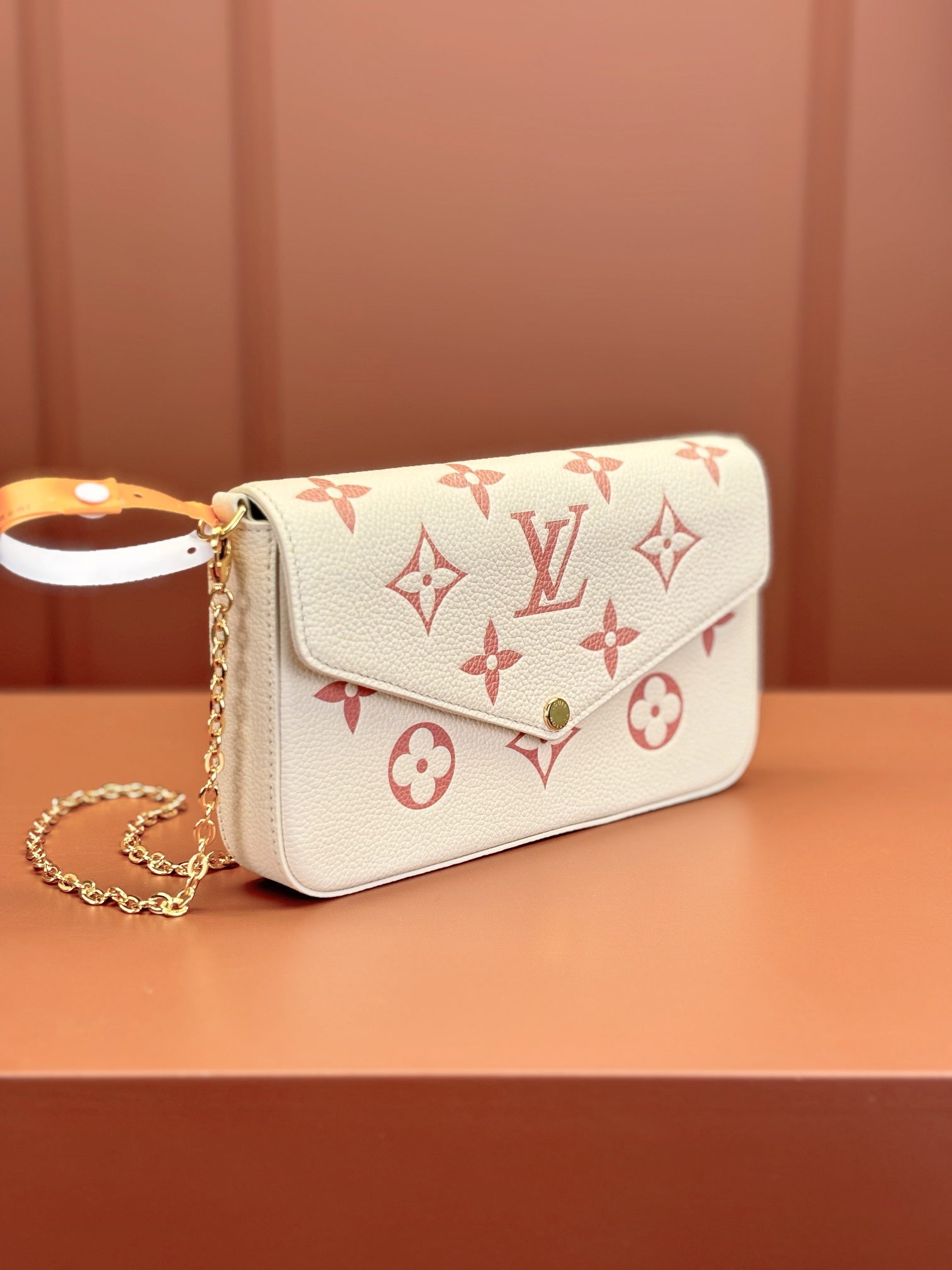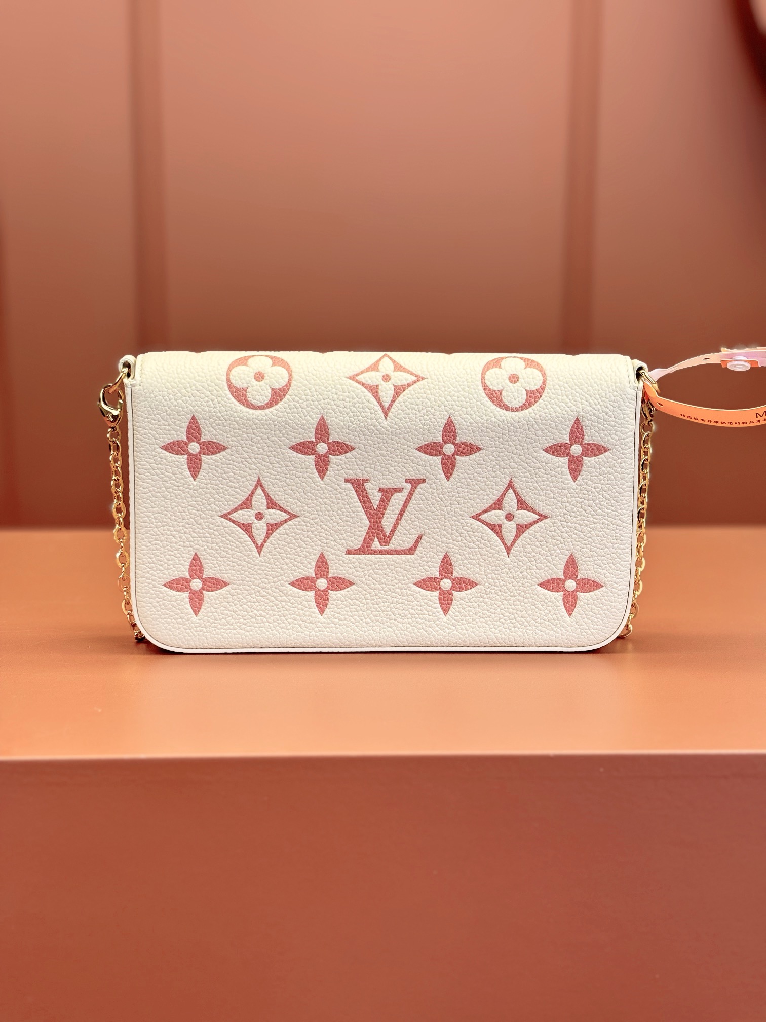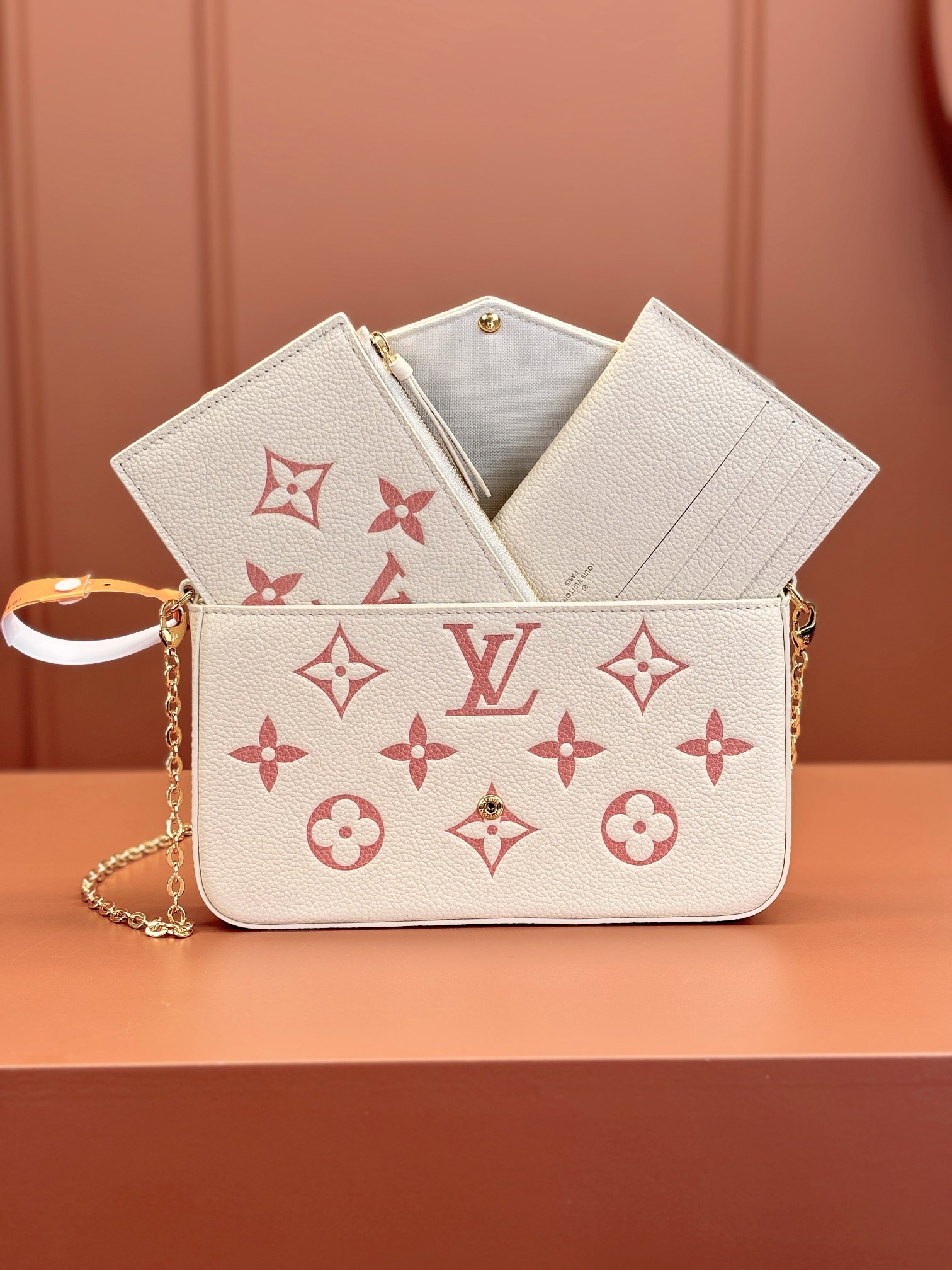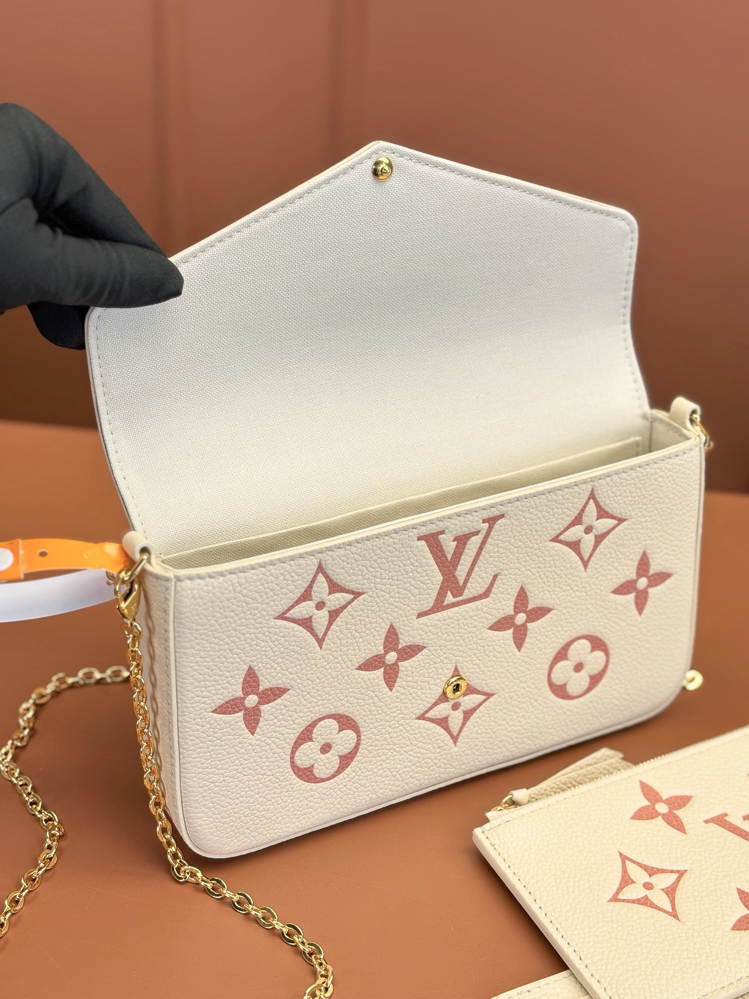 本款 Pochette Félicie 链条包选用 Monogram Empreinte 皮革,以淡雅色彩描绘 Monogram 图案。信封式构型囊括可拆卸内袋,取下链条即可化身优雅手拿包。