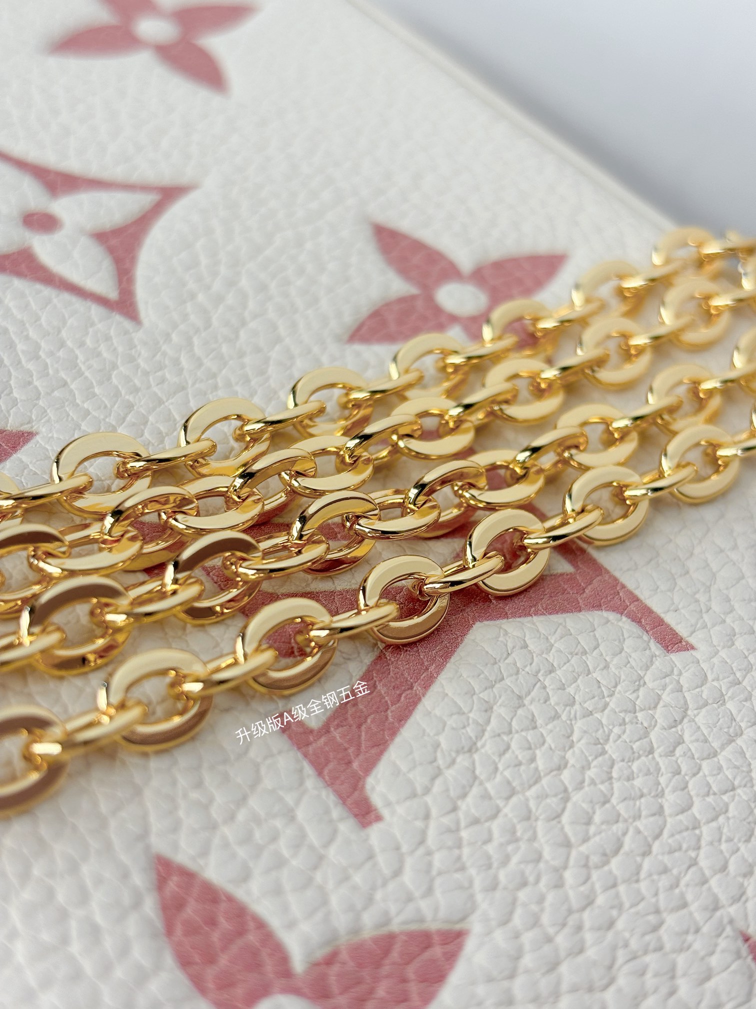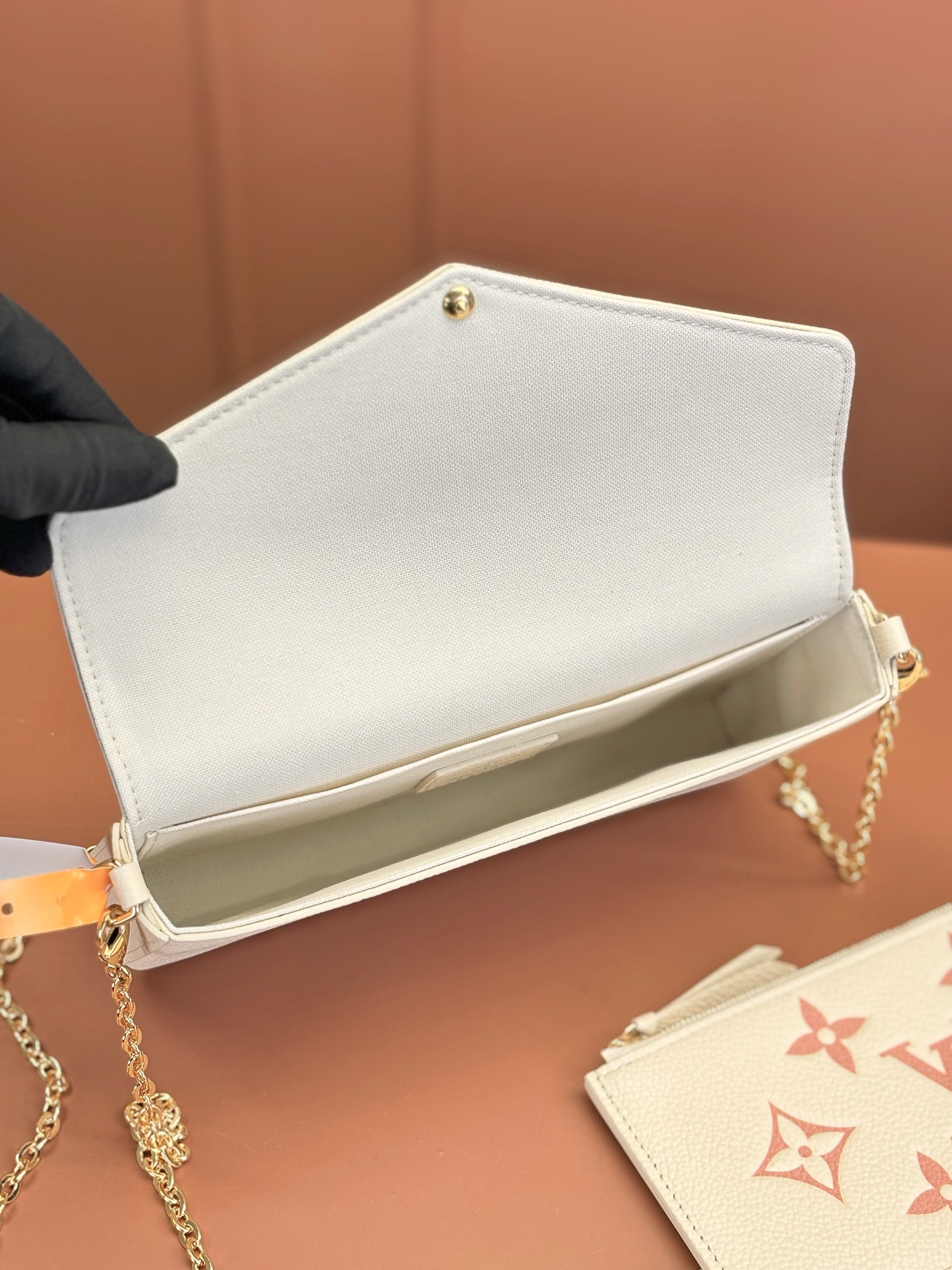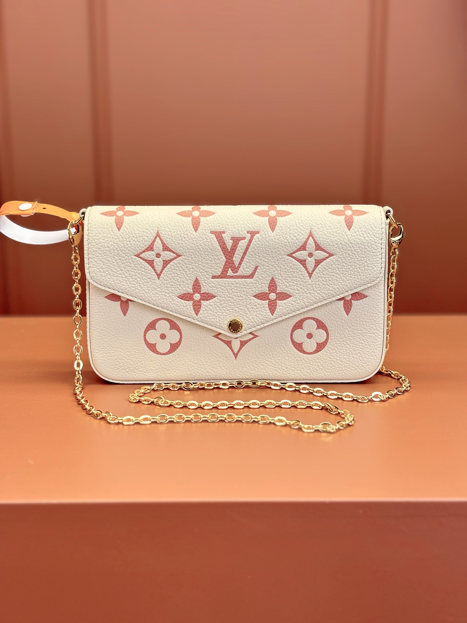 本款 Pochette Félicie 链条包选用 Monogram Empreinte 皮革,以淡雅色彩描绘 Monogram 图案。信封式构型囊括可拆卸内袋,取下链条即可化身优雅手拿包。