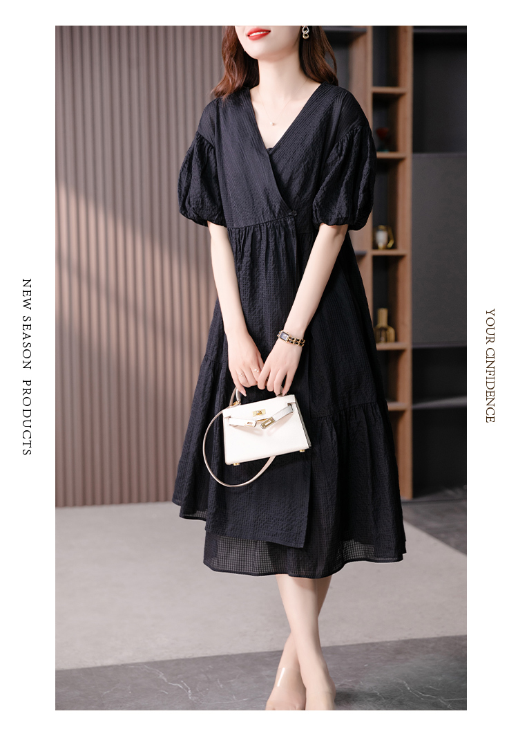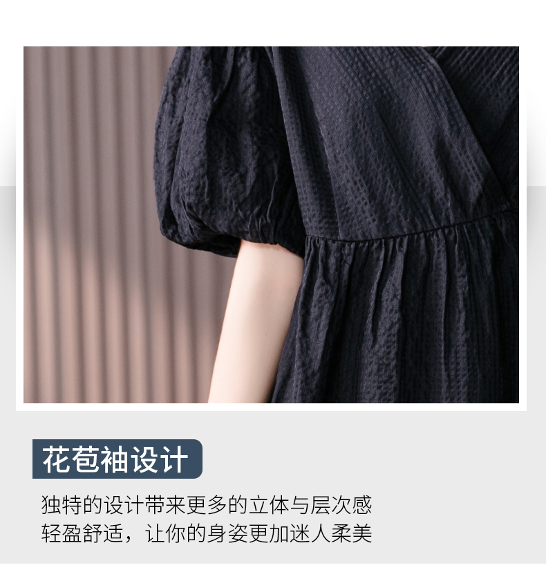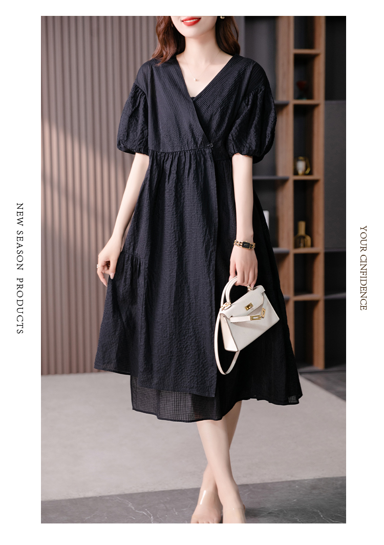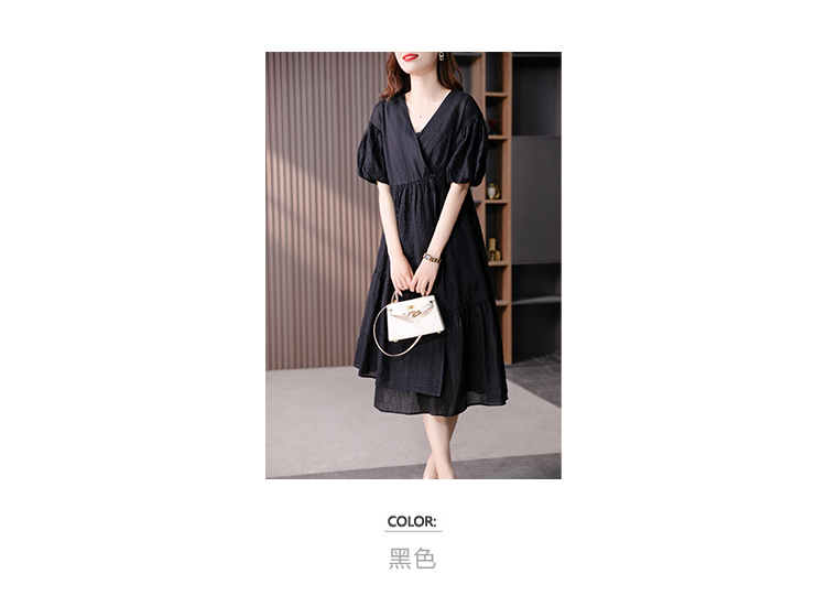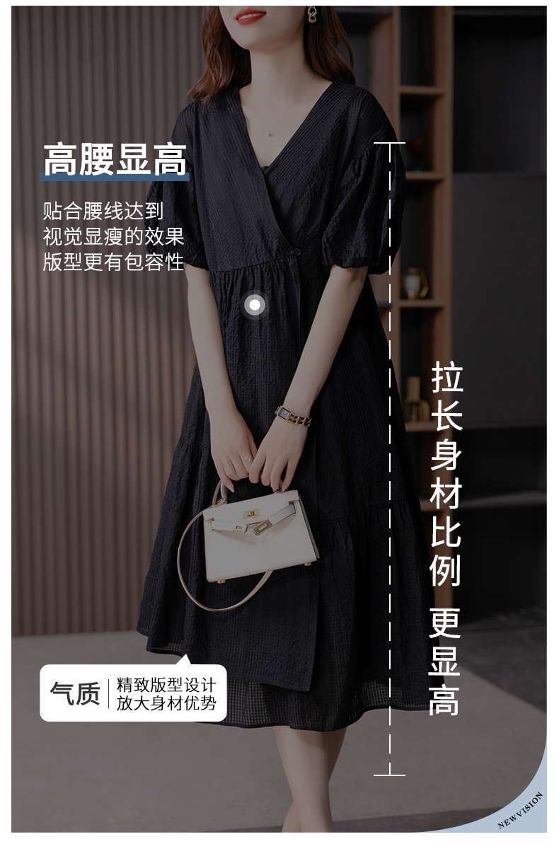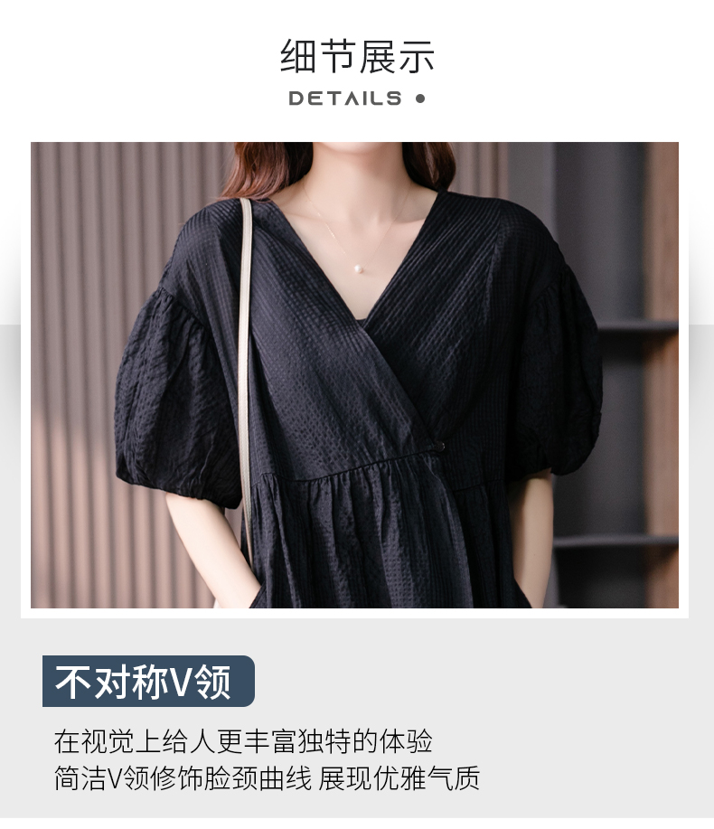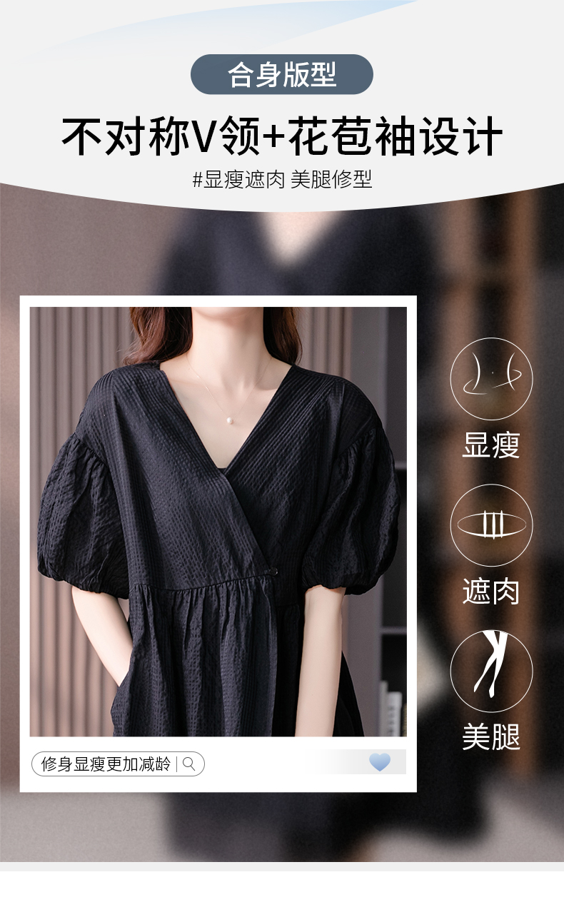 89153原形法式收腰不对称连衣裙女2024春夏季新款花苞袖V领显瘦长裙子