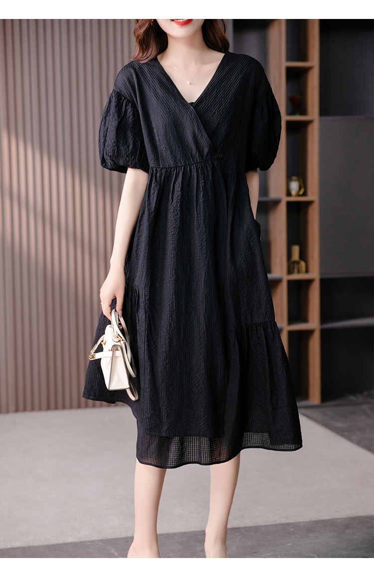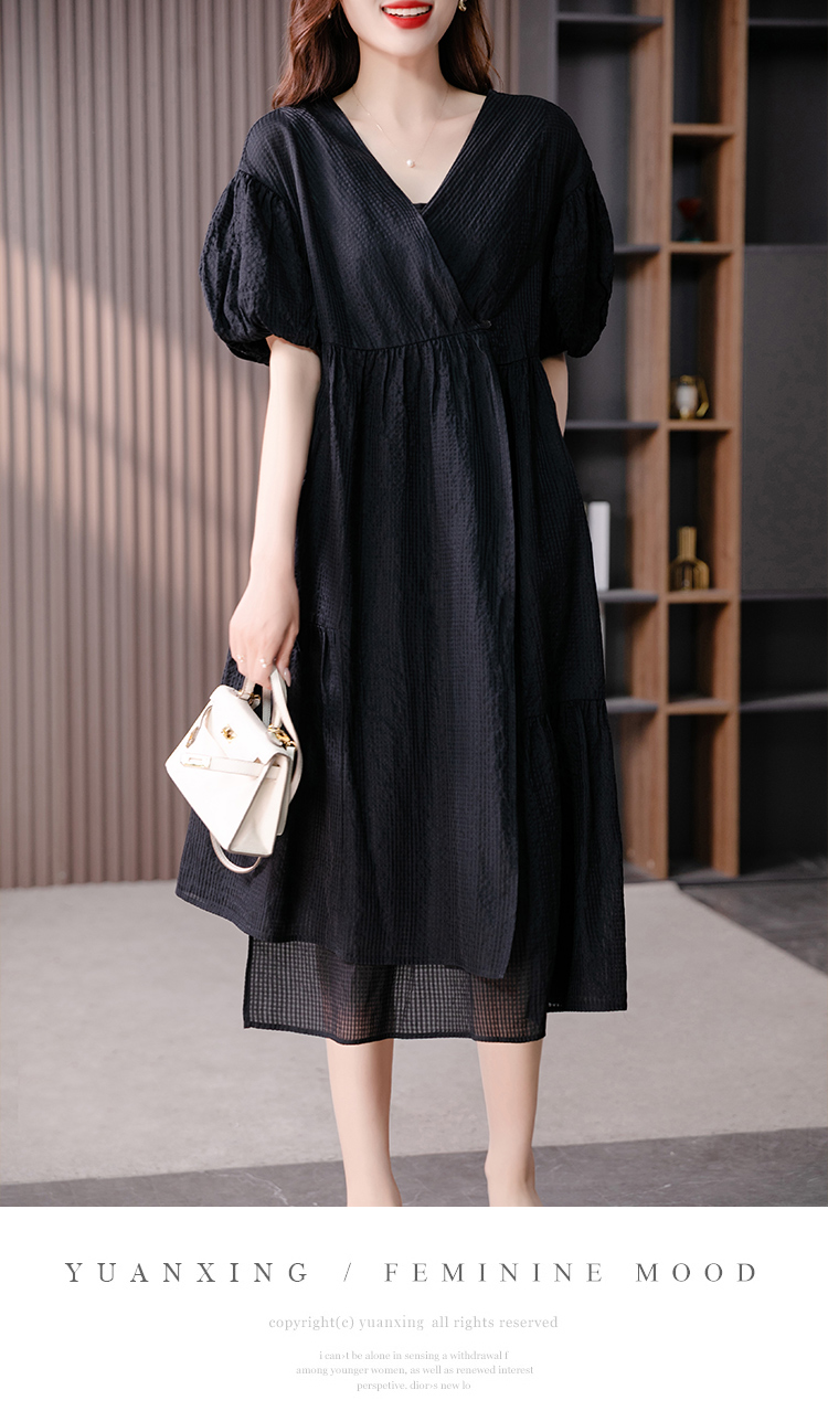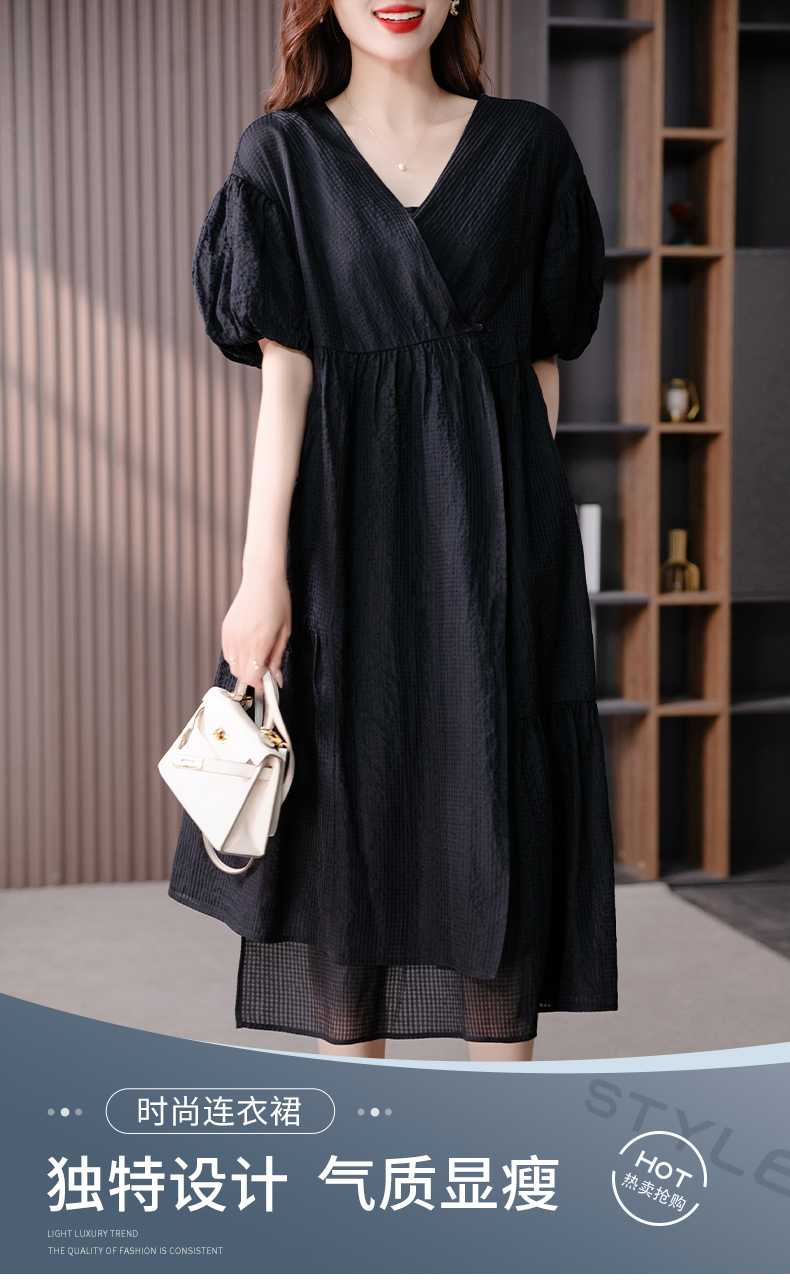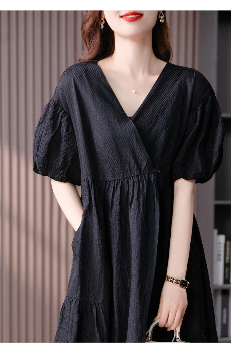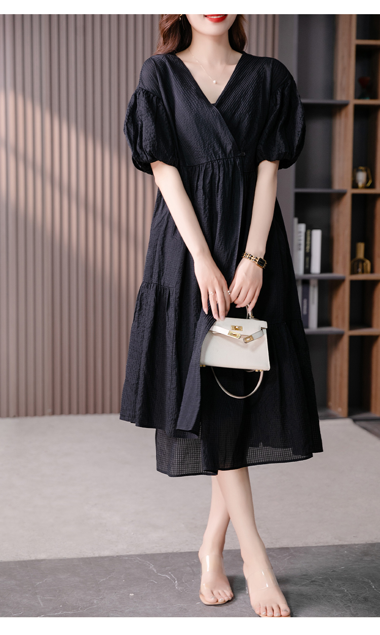 89153原形法式收腰不对称连衣裙女2024春夏季新款花苞袖V领显瘦长裙子