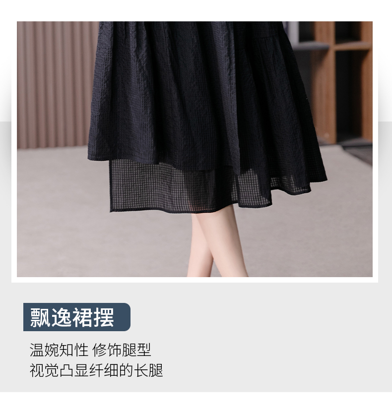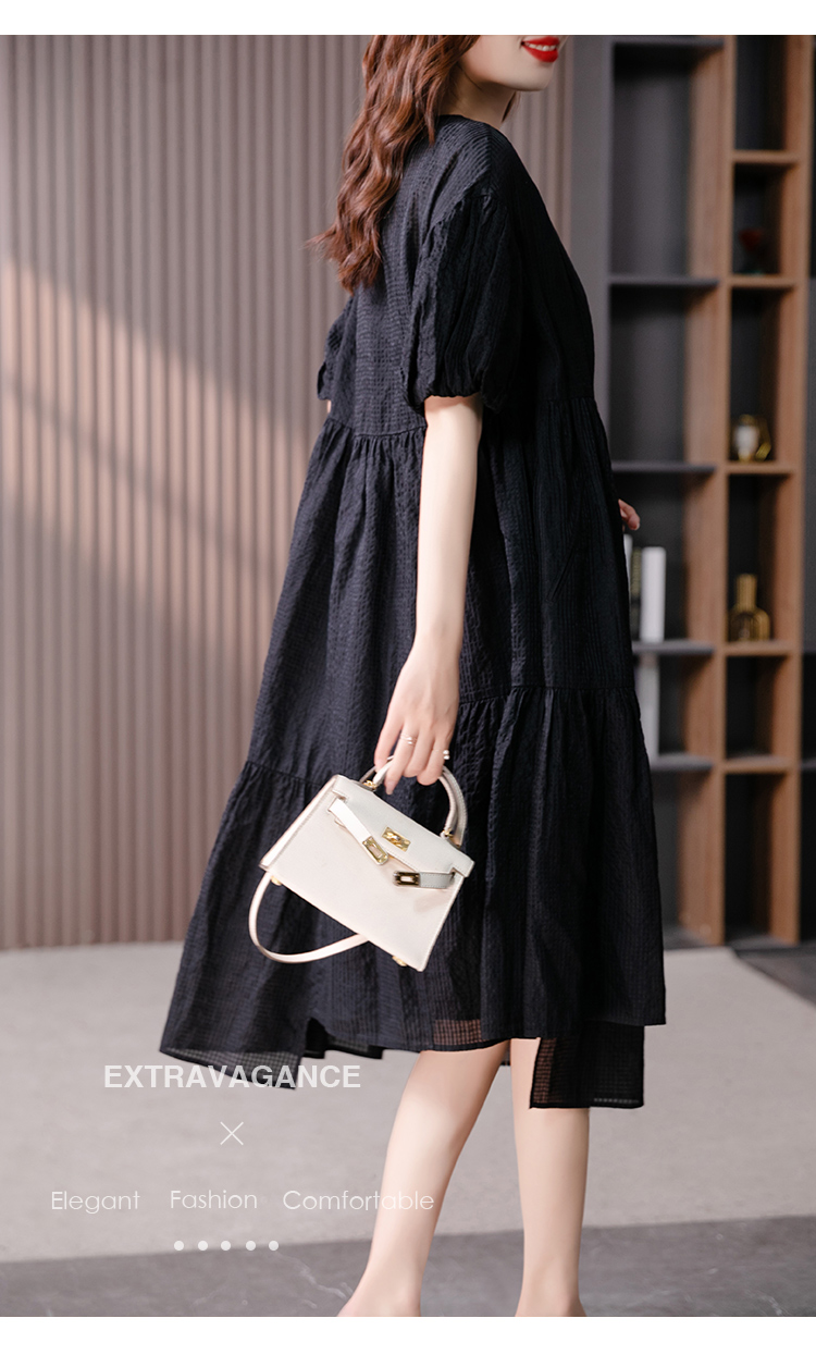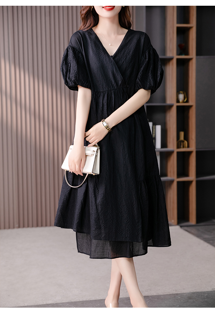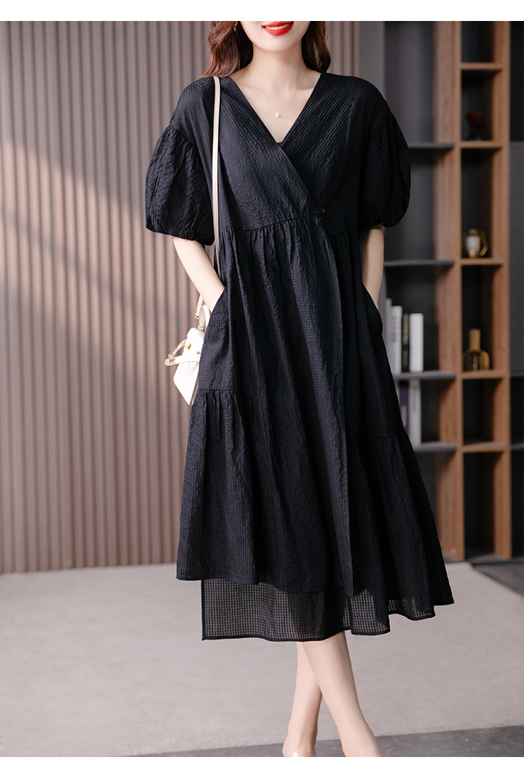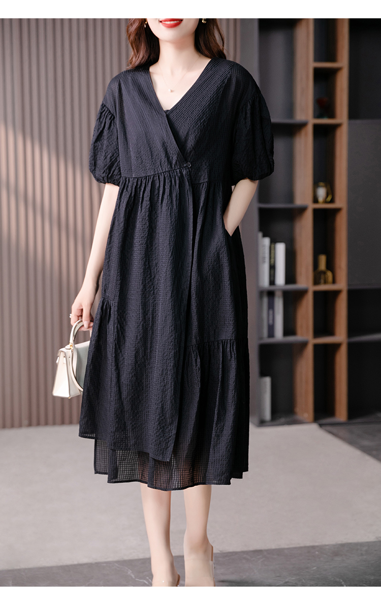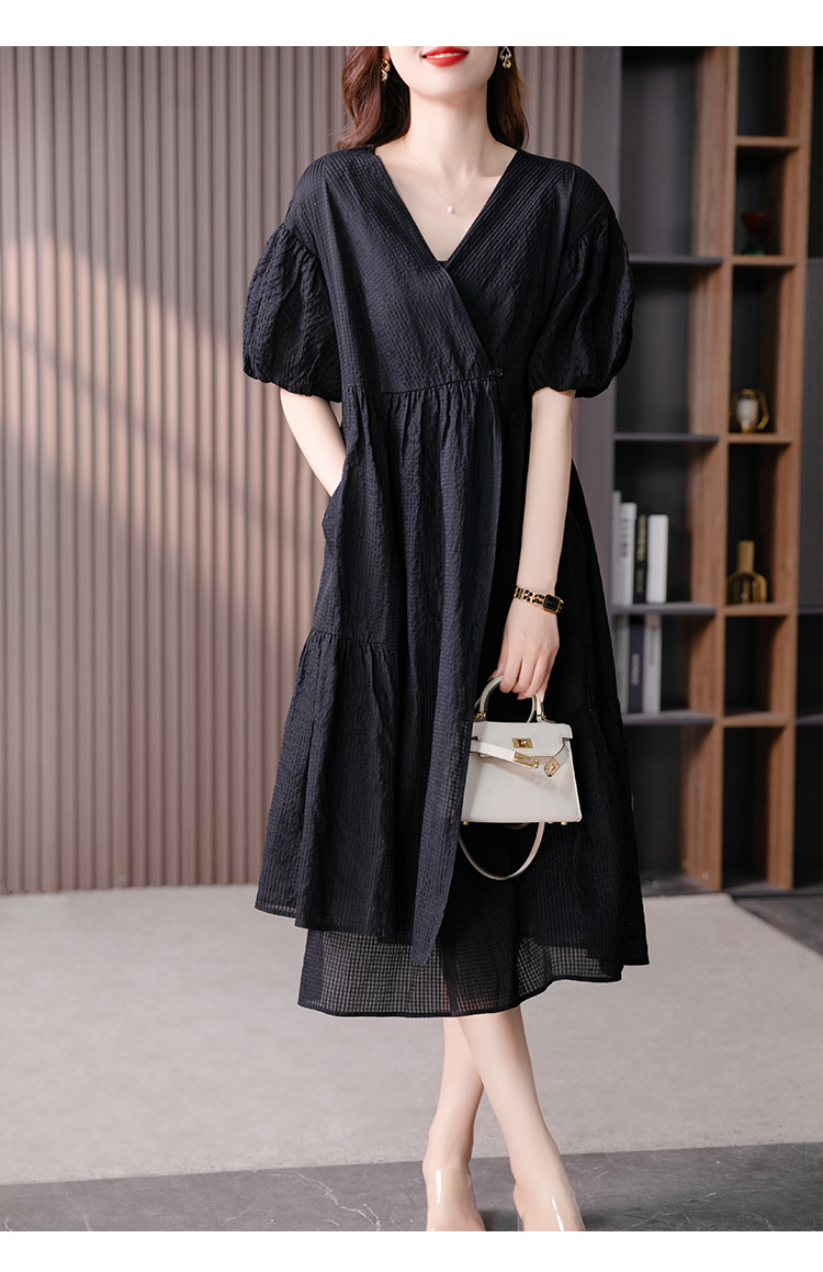 89153原形法式收腰不对称连衣裙女2024春夏季新款花苞袖V领显瘦长裙子