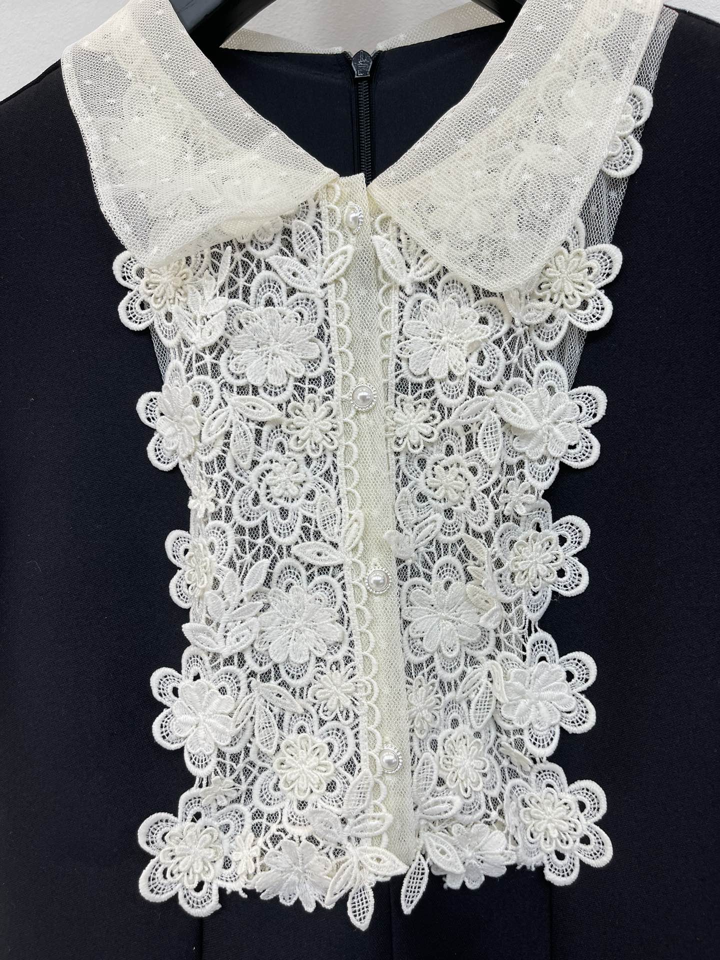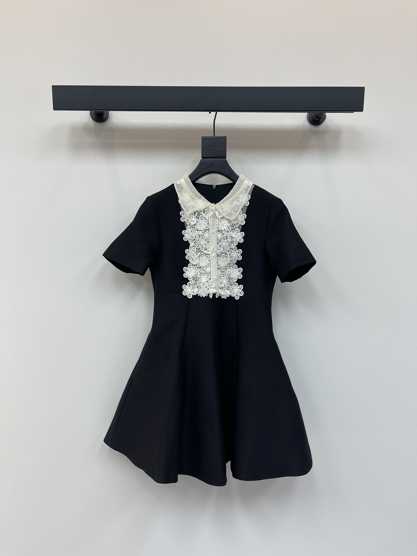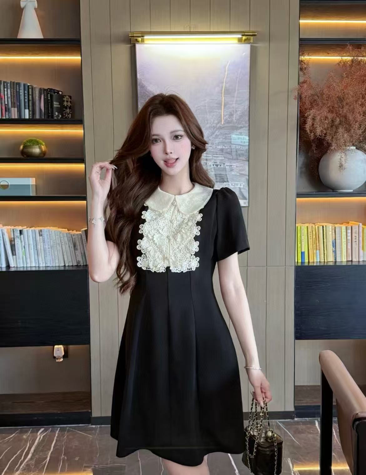 V家25春夏新品绣花蕾丝领娃娃款短袖连衣裙