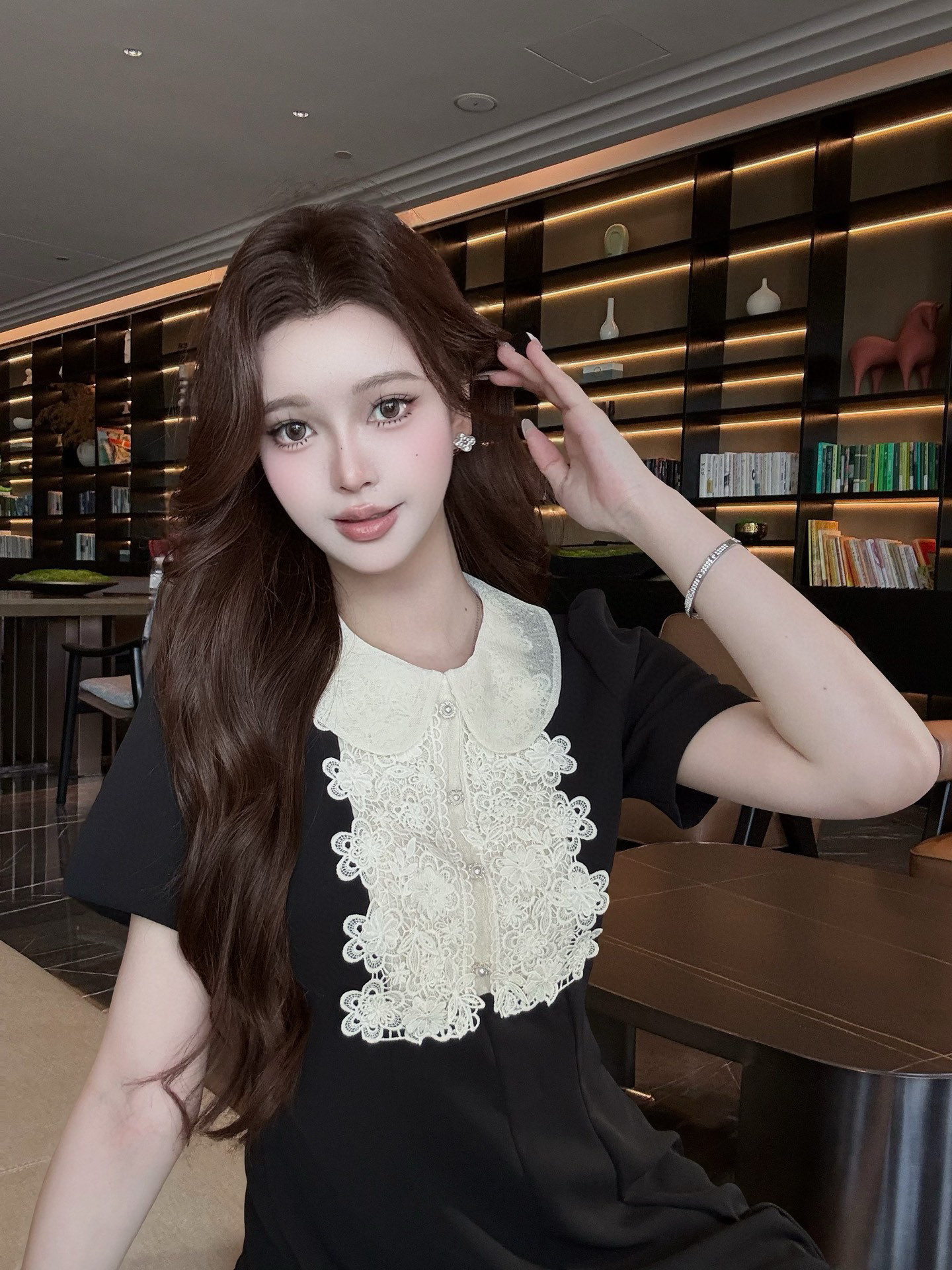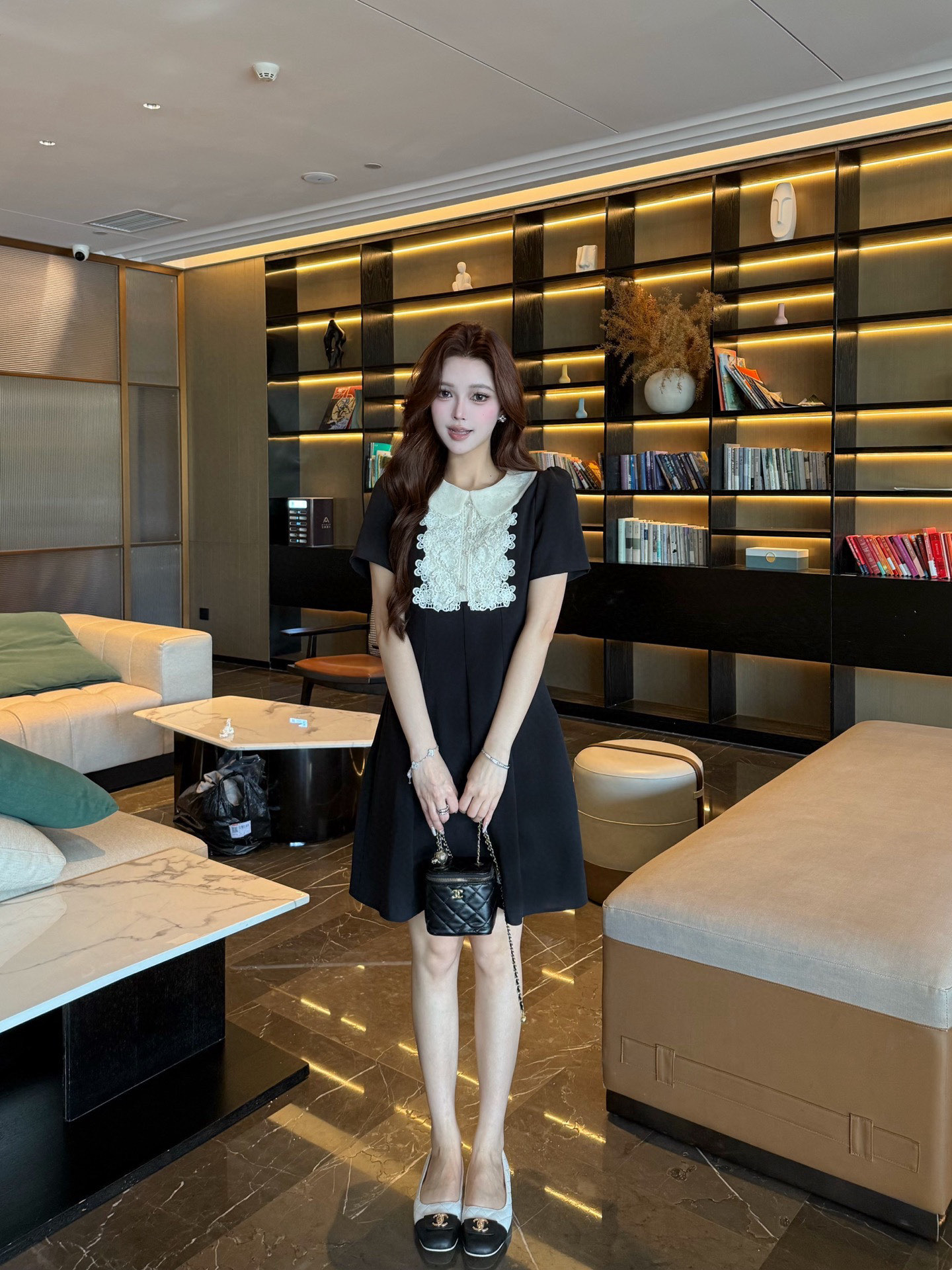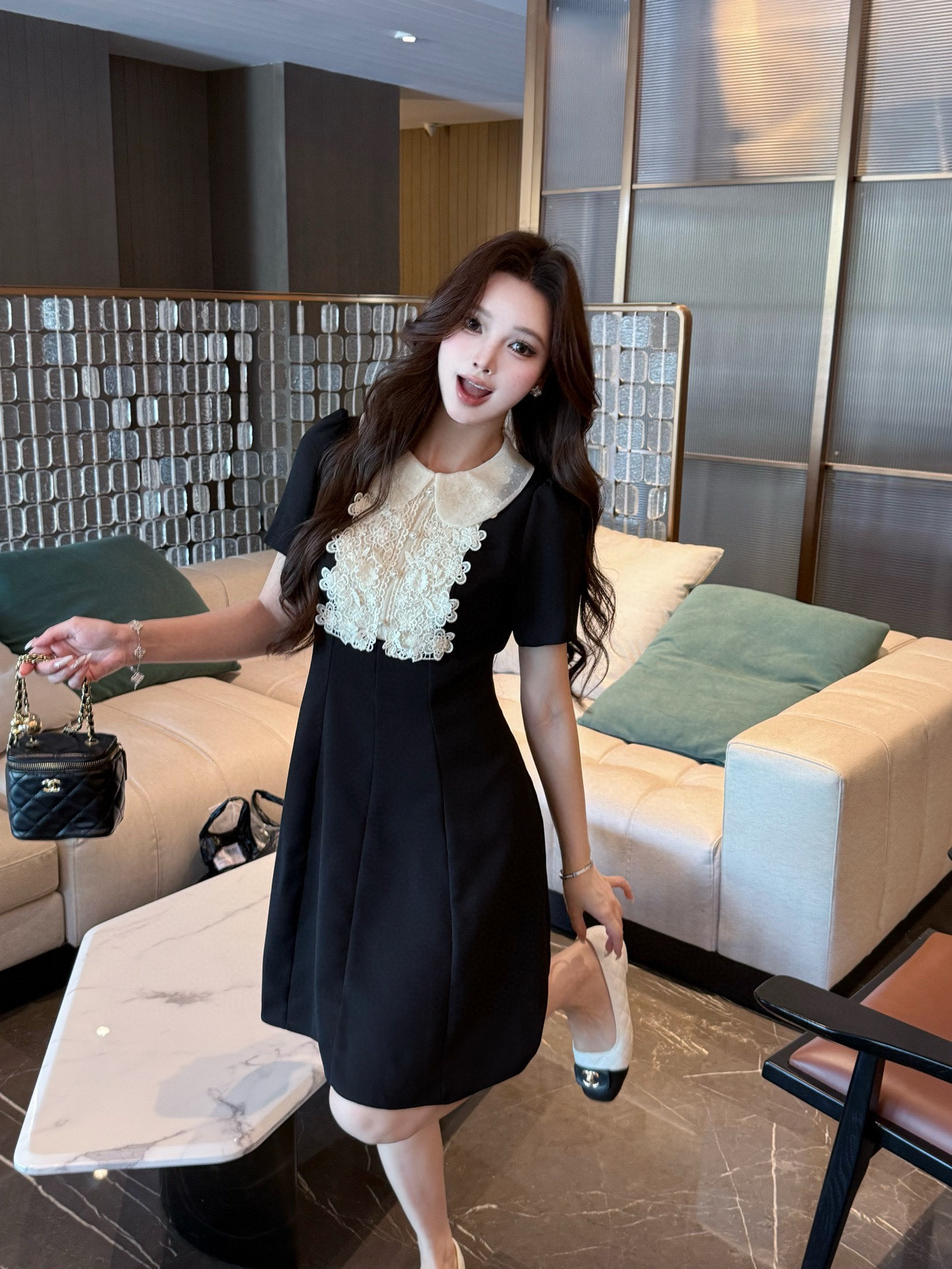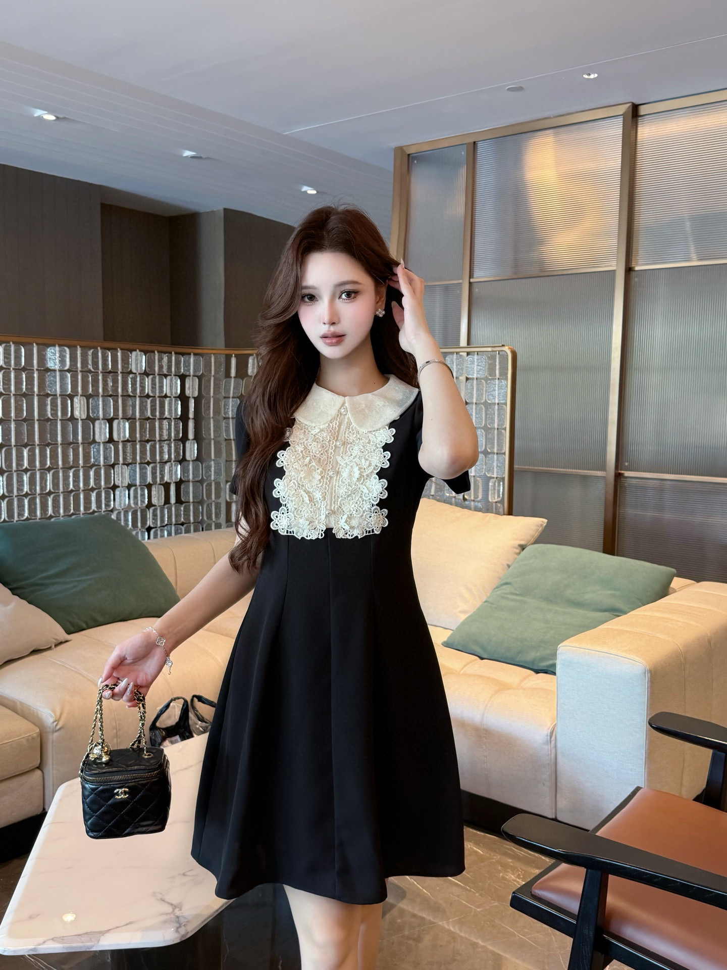 V家25春夏新品绣花蕾丝领娃娃款短袖连衣裙