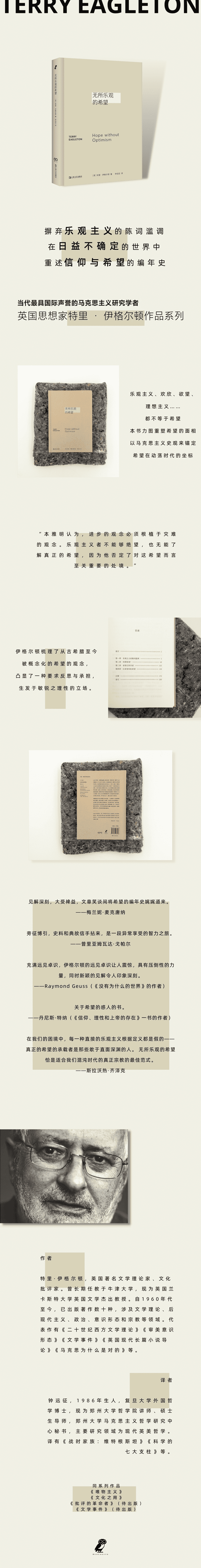 游刃于博学、慎思和幽默之间的特里·伊格尔顿,梳理了从古希腊至今被概念化的希望的观念,他将希望与朴素的乐观主义、欢欣、欲望、理想主义以及对进步教条的坚执区分开来,凸显了一种要求反思与承担,生发于敏锐之理性的立场。在一个愈加不确定的世界中,《无所乐观的希望》确实是一部出色而为、慷慨激昂的关乎人类信仰与希望的编年史。