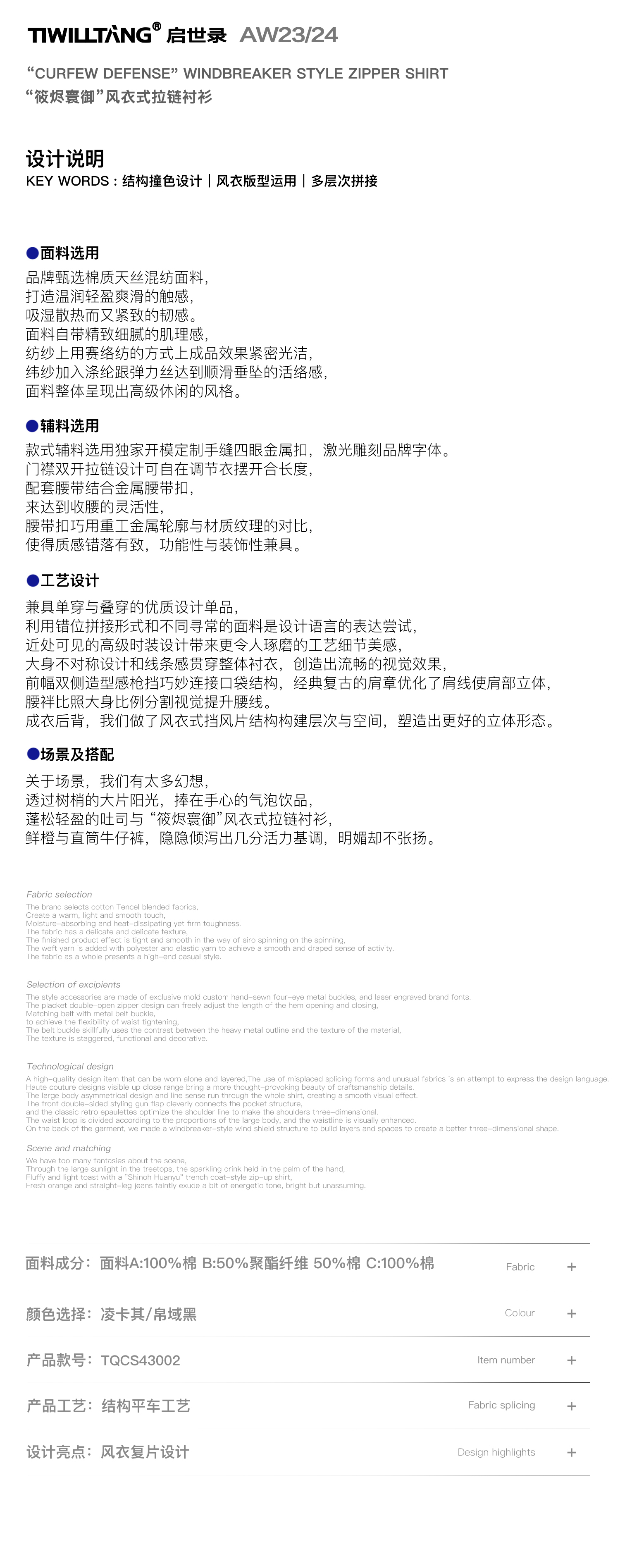 启世录TIWILLTANG“檩铸嚣尘”风衣式拉链结构男式衬衫