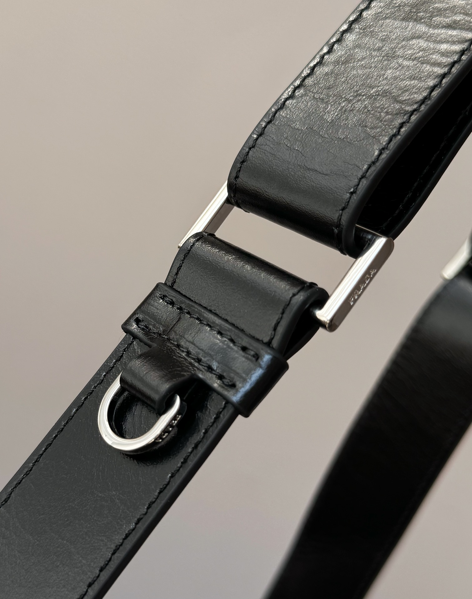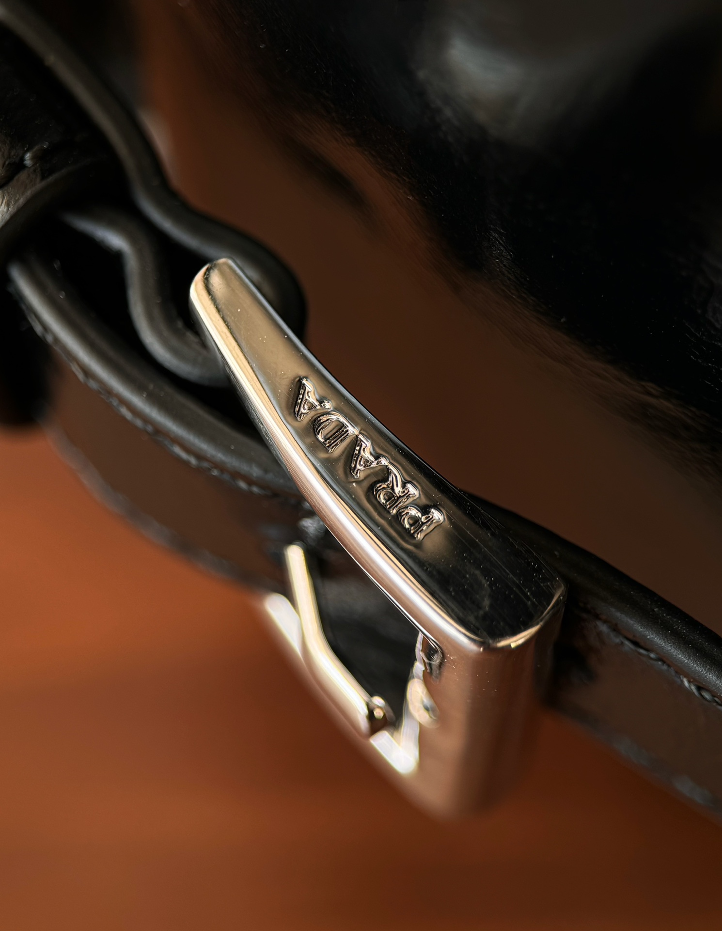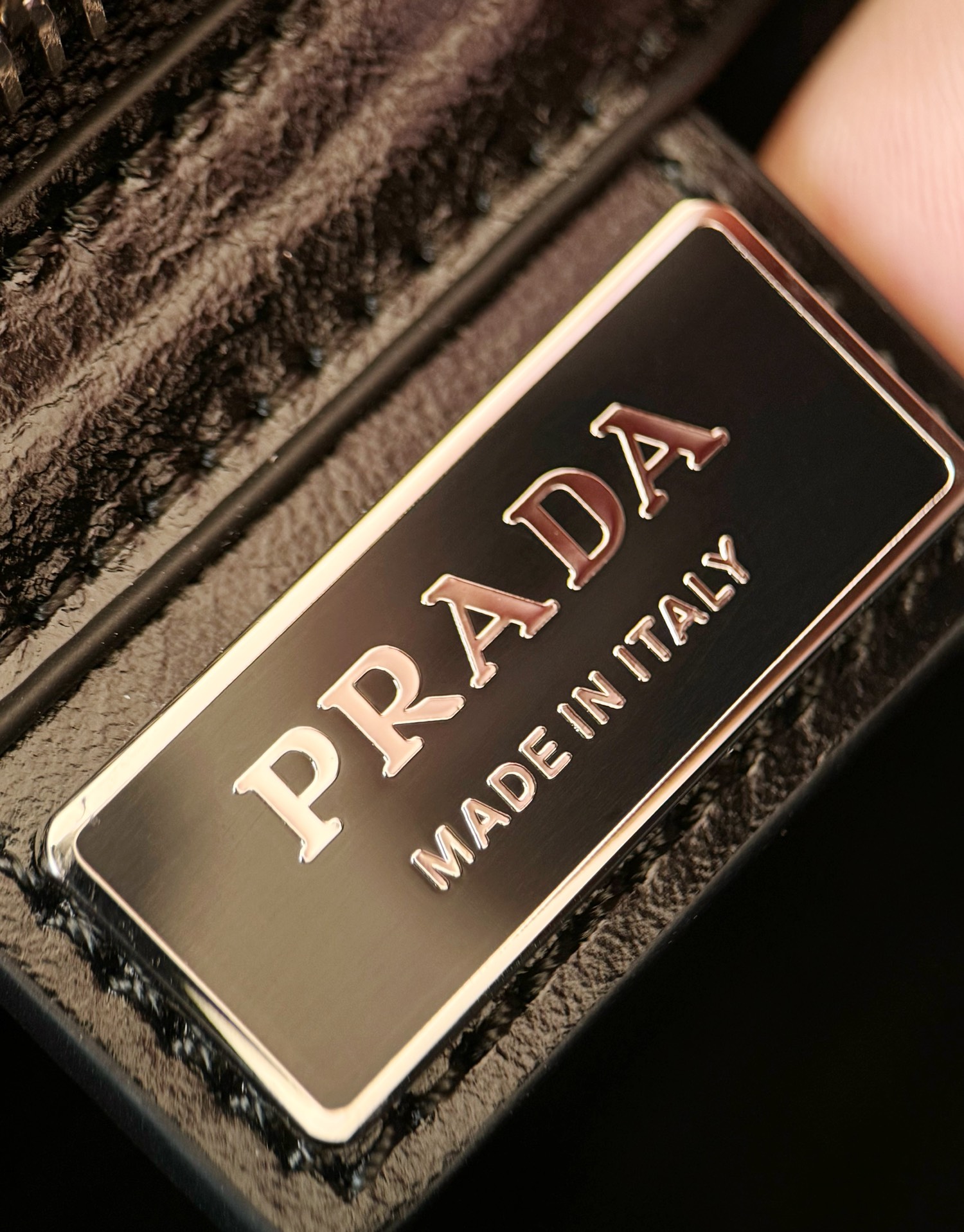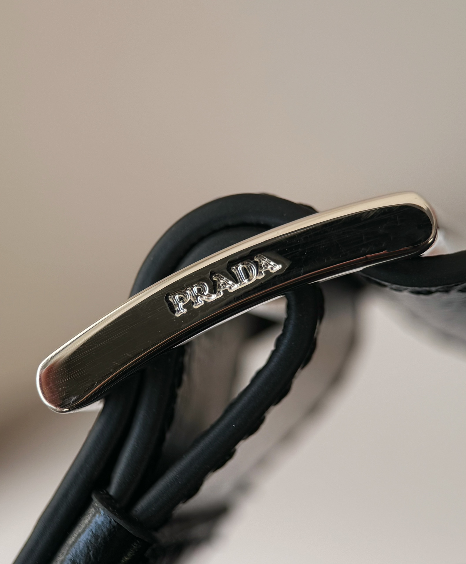微距特写!什么叫真正的原厂五金一眼就能分辨了吧,Prada的珐琅三角标绝对是一大亮点,字体清晰、细致~