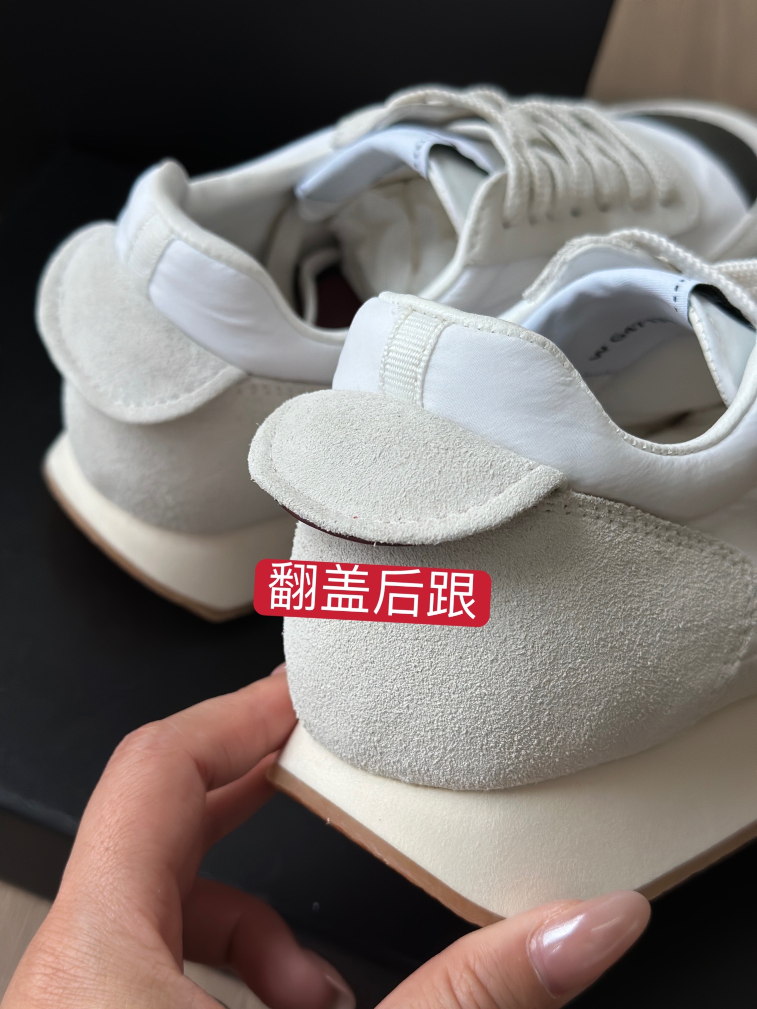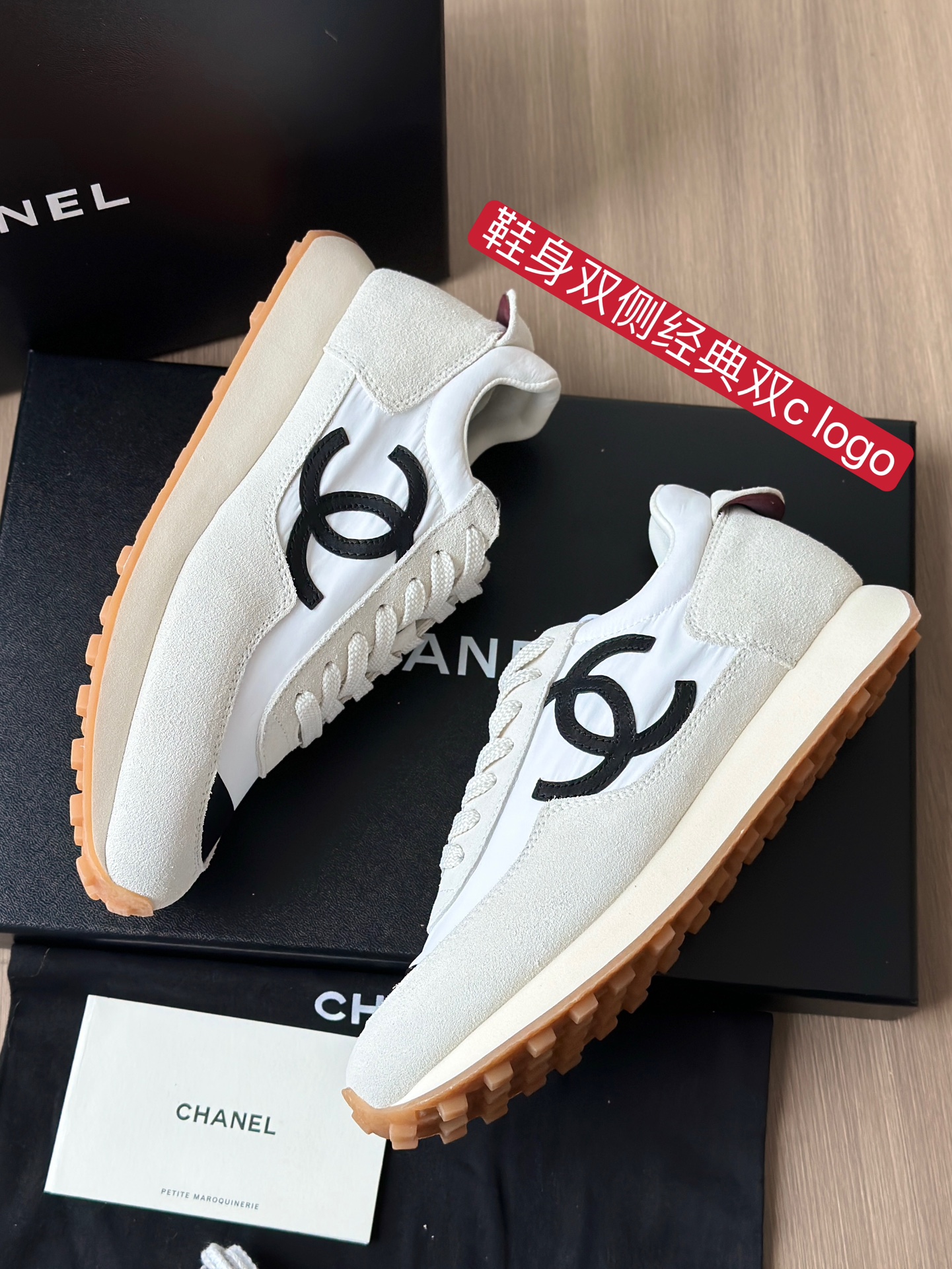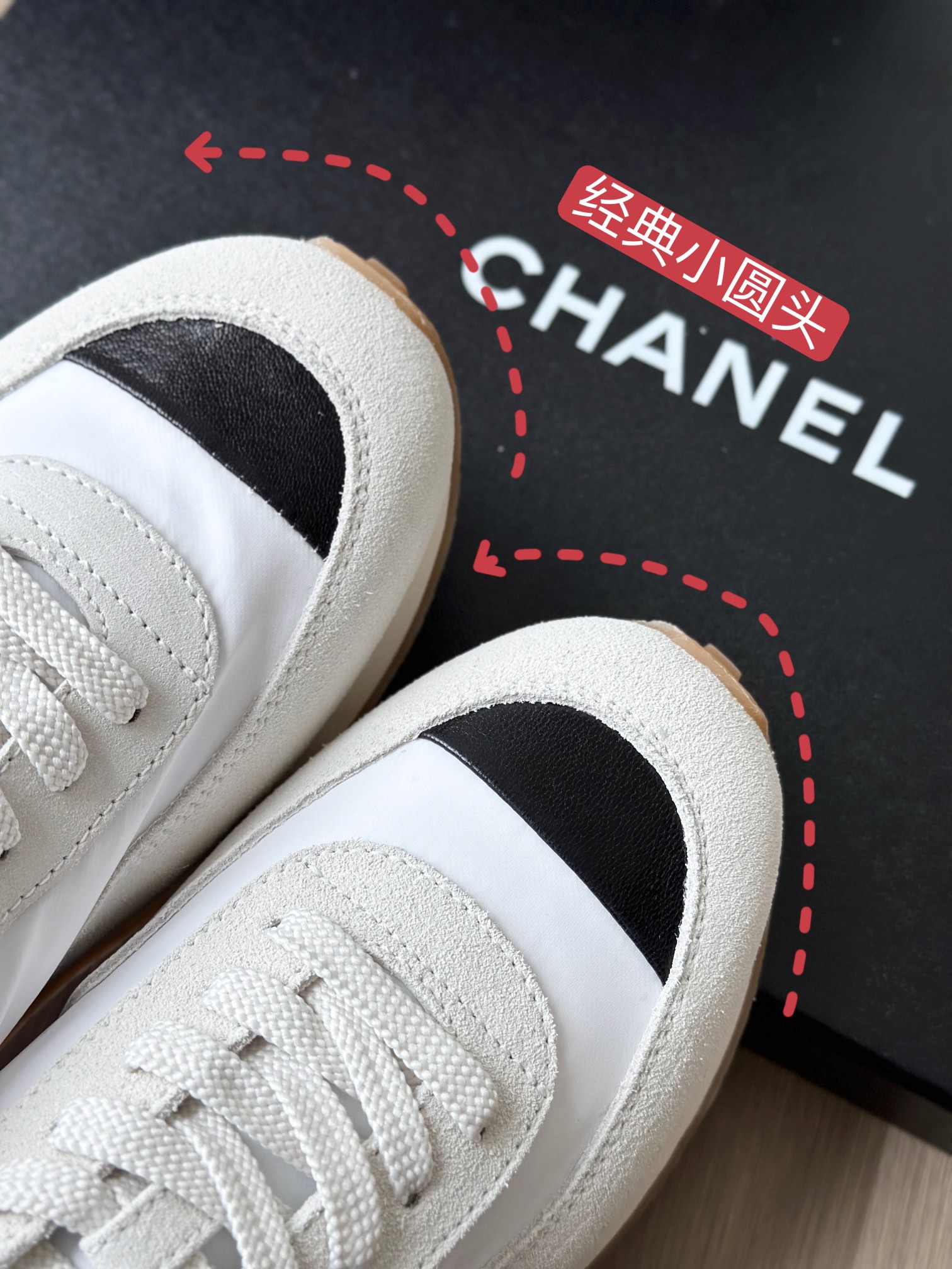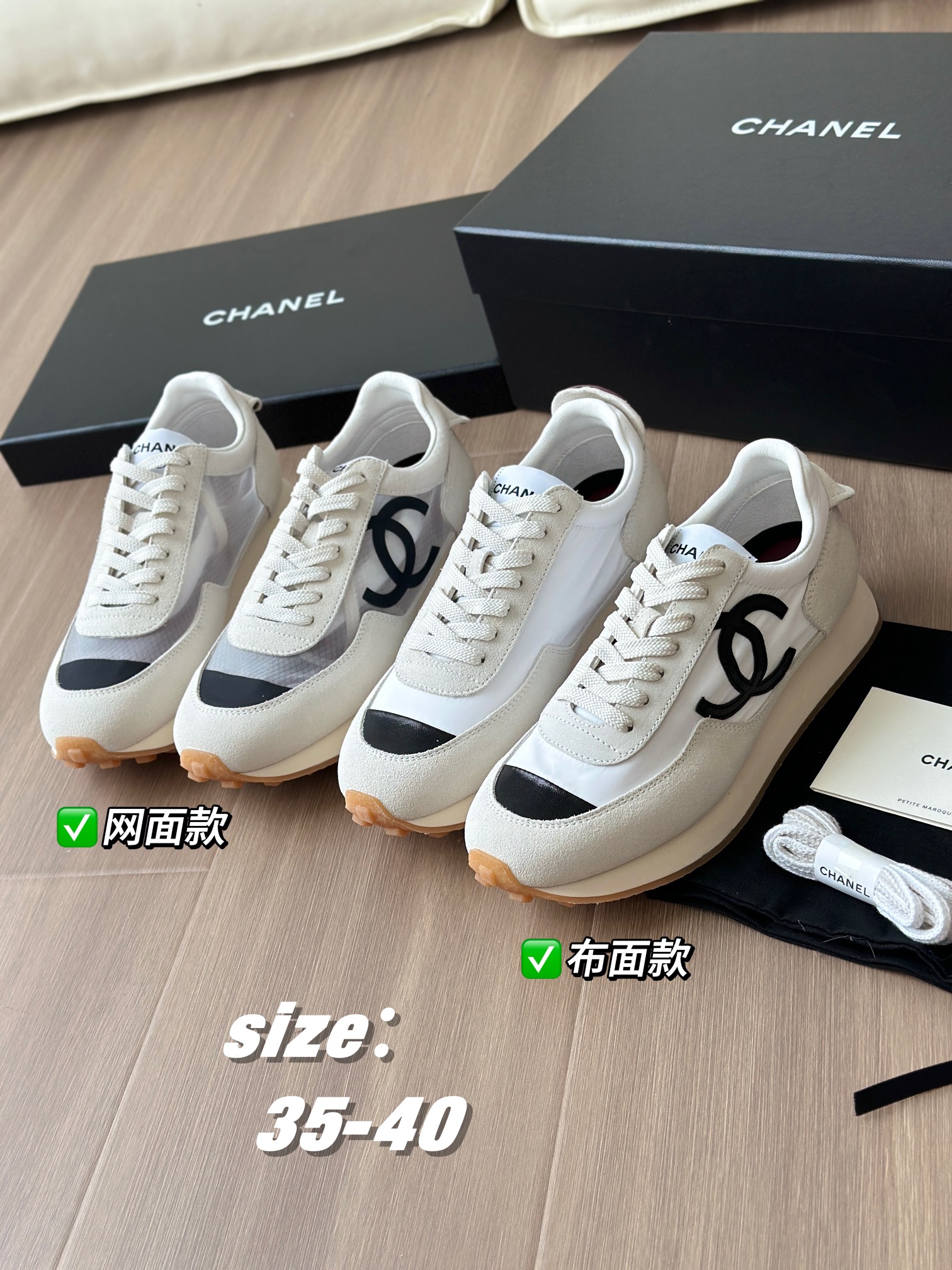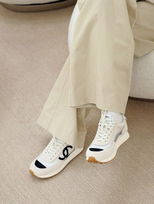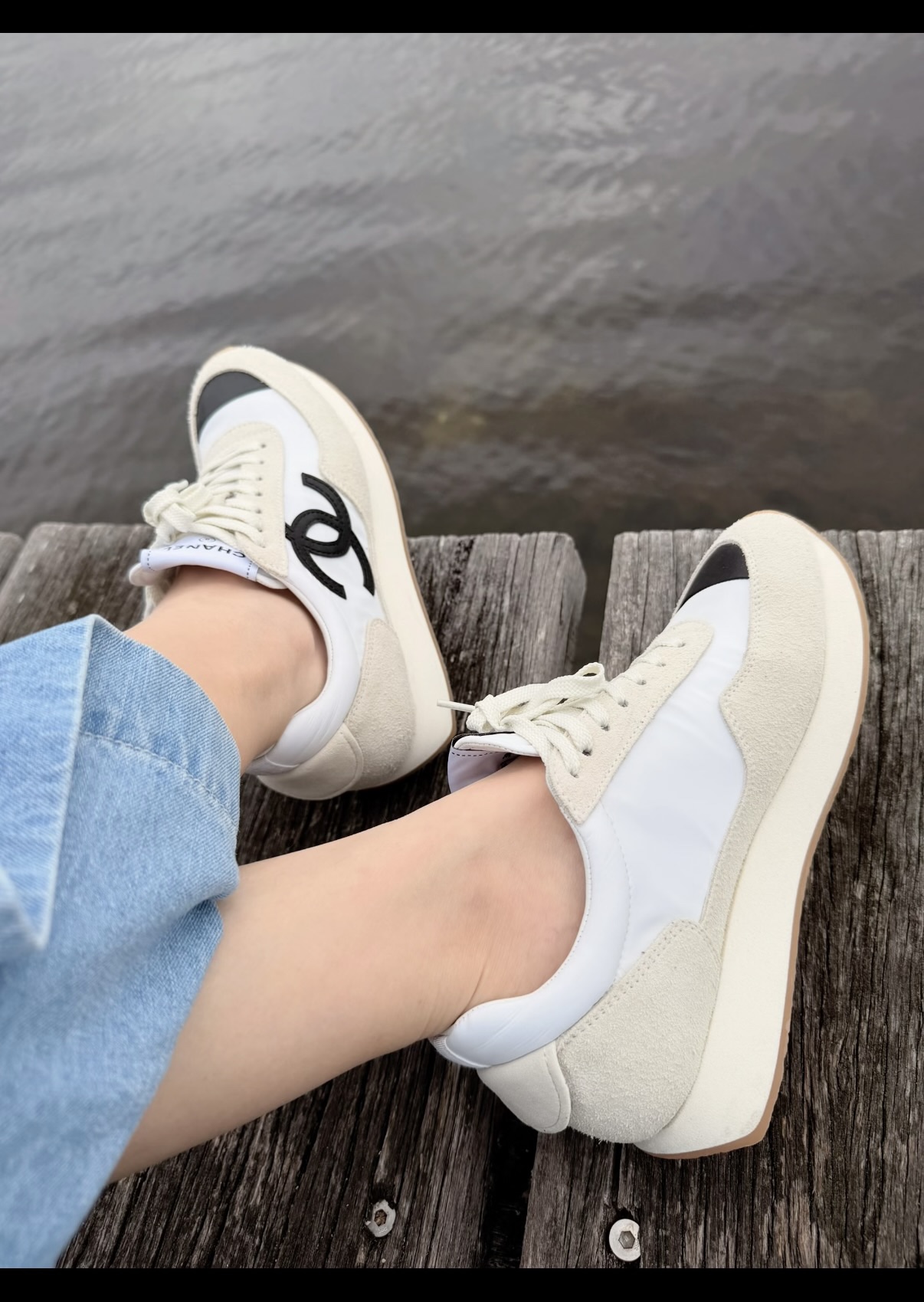 26P|休闲运动鞋 米白阿甘鞋|春日氛围感天花板✨ ▪️ 配色绝了:经典米白拼接网纱,搭配低调的黑色双C Logo,温柔又显贵,自带柔光滤镜,怎么搭都不出错✨ ▪️ 细节拉满:麂皮绒鞋面质感超棒,网面设计透气不闷脚,春夏穿再合适不过!鞋型超秀气,显脚小的同时还很修饰脚型,宽脚姐妹也能闭眼冲👍 舒适度&小心机双在线 ▪️ 厚底增高buff:4cm左右的厚底设计,悄悄拉长腿部线条,小个子姐妹直接拿捏黄金比例👯♀️ ▪️ 暴走不累:乳胶鞋垫+柔软内里,上脚就是“踩屎感”般的舒适,通勤逛街暴走2万步都毫无压力,打工人狂喜!😌 💃 万能穿搭公式 ▪️ 通勤风:搭配西装直筒裤,利落又专业,下班直接去约会无压力 ▪️ 休闲风:牛仔裤+针织衫,松弛感拉满,妥妥的法式富家既视感 ▪️ 甜妹风:碎花连衣裙/百褶裙,温柔又灵动,春日出街回头率拉满。 • 鞋面:采用织物(网眼/尼龙类面料) 鞋侧及后跟:拼接了麂皮效果小牛皮 • 内里:为小羊皮, • 大底:采用橡胶材质,部分款式加入PU缓震层 码数35---40
