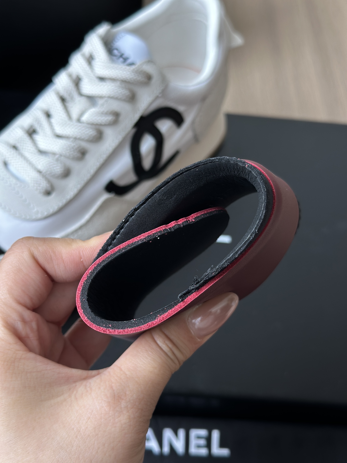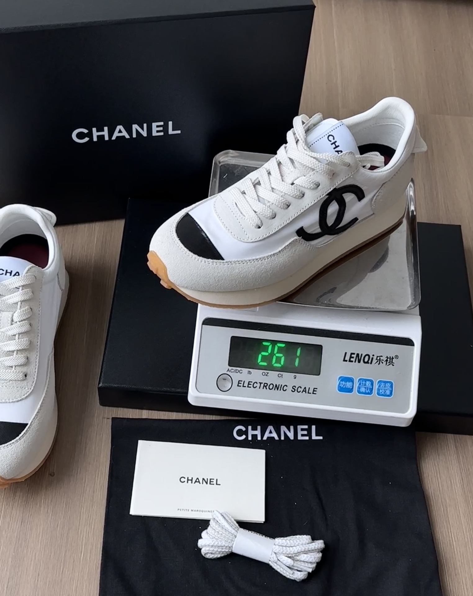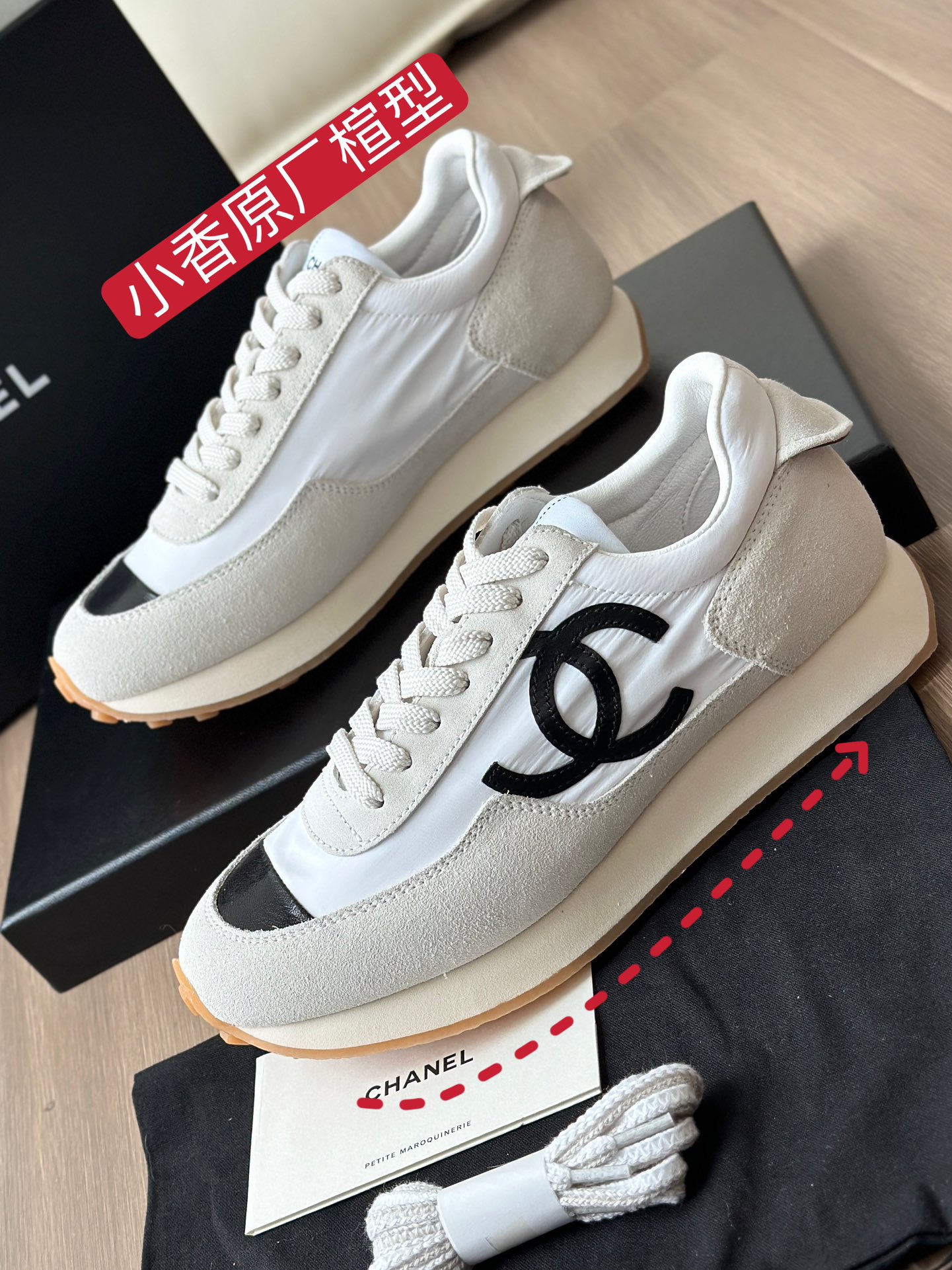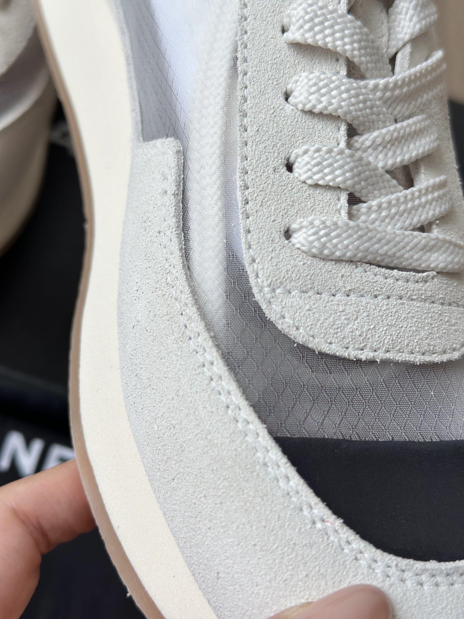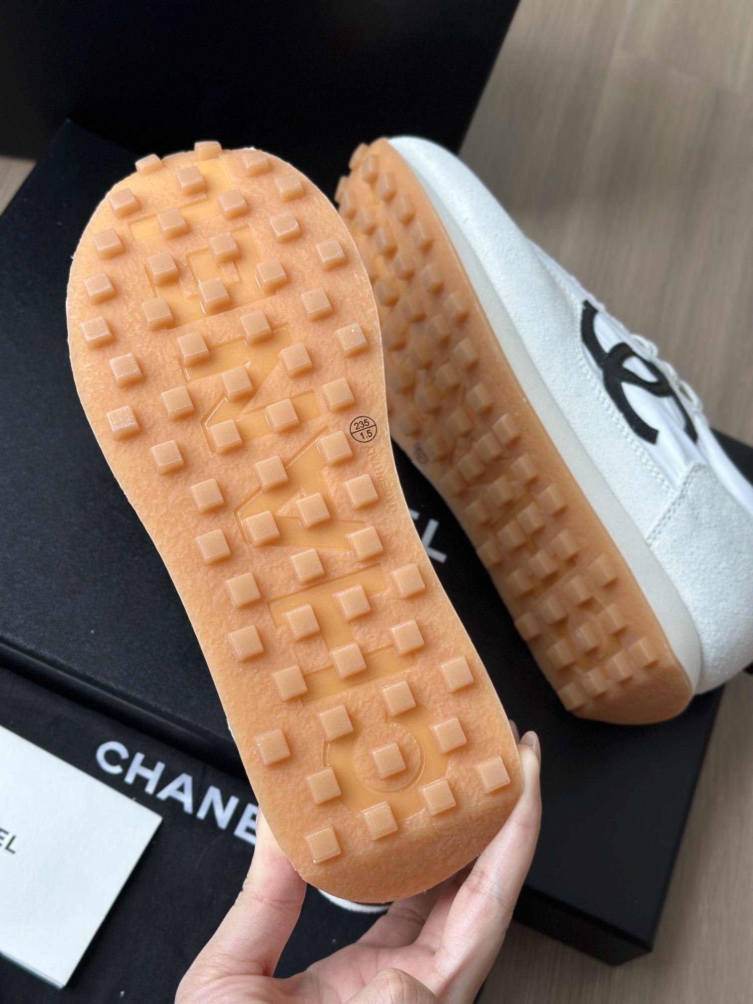 26P|休闲运动鞋 米白阿甘鞋|春日氛围感天花板✨ ▪️ 配色绝了:经典米白拼接网纱,搭配低调的黑色双C Logo,温柔又显贵,自带柔光滤镜,怎么搭都不出错✨ ▪️ 细节拉满:麂皮绒鞋面质感超棒,网面设计透气不闷脚,春夏穿再合适不过!鞋型超秀气,显脚小的同时还很修饰脚型,宽脚姐妹也能闭眼冲👍 舒适度&小心机双在线 ▪️ 厚底增高buff:4cm左右的厚底设计,悄悄拉长腿部线条,小个子姐妹直接拿捏黄金比例👯♀️ ▪️ 暴走不累:乳胶鞋垫+柔软内里,上脚就是“踩屎感”般的舒适,通勤逛街暴走2万步都毫无压力,打工人狂喜!😌 💃 万能穿搭公式 ▪️ 通勤风:搭配西装直筒裤,利落又专业,下班直接去约会无压力 ▪️ 休闲风:牛仔裤+针织衫,松弛感拉满,妥妥的法式富家既视感 ▪️ 甜妹风:碎花连衣裙/百褶裙,温柔又灵动,春日出街回头率拉满。 • 鞋面:采用织物(网眼/尼龙类面料) 鞋侧及后跟:拼接了麂皮效果小牛皮 • 内里:为小羊皮, • 大底:采用橡胶材质,部分款式加入PU缓震层 码数35---40