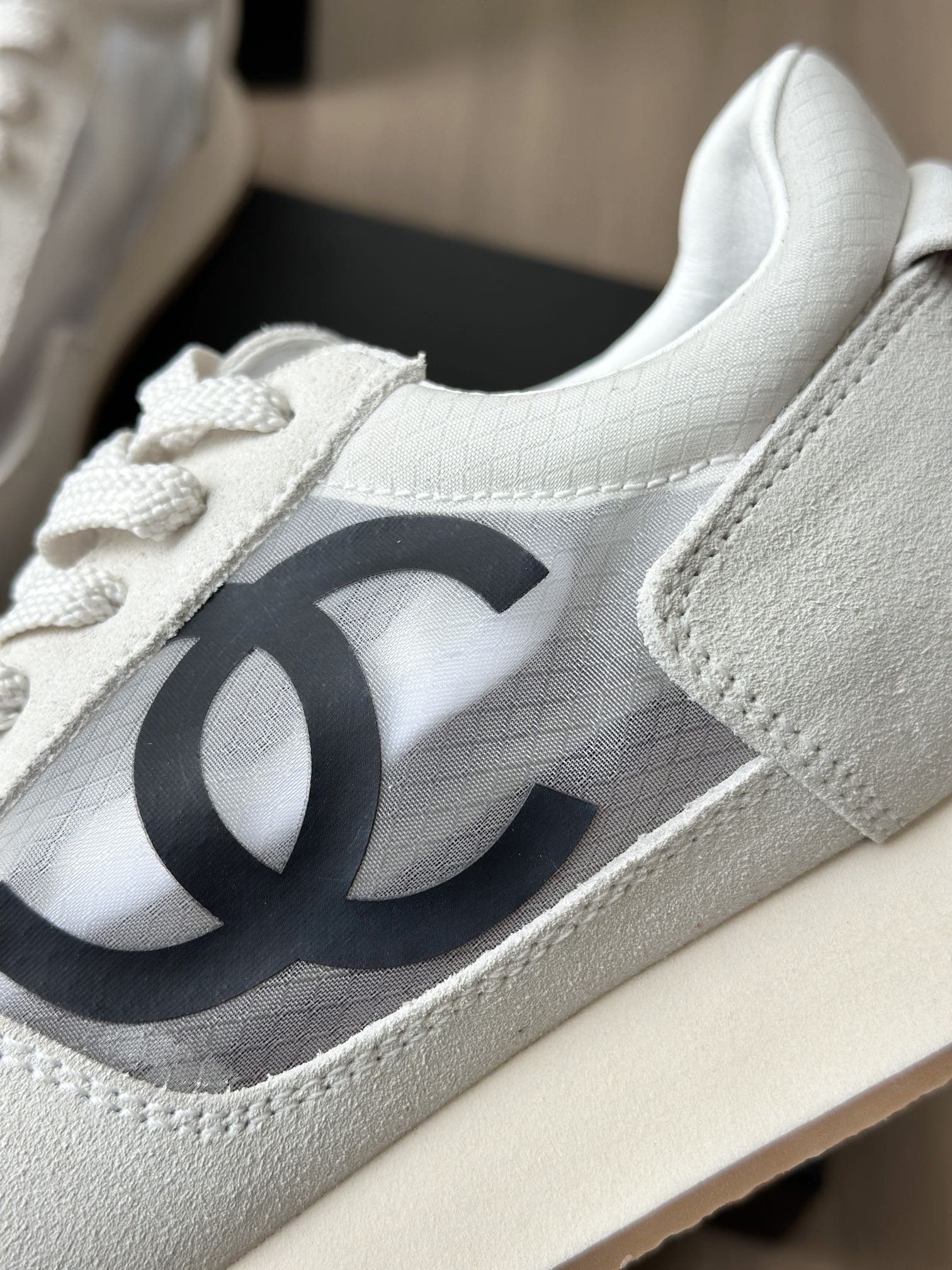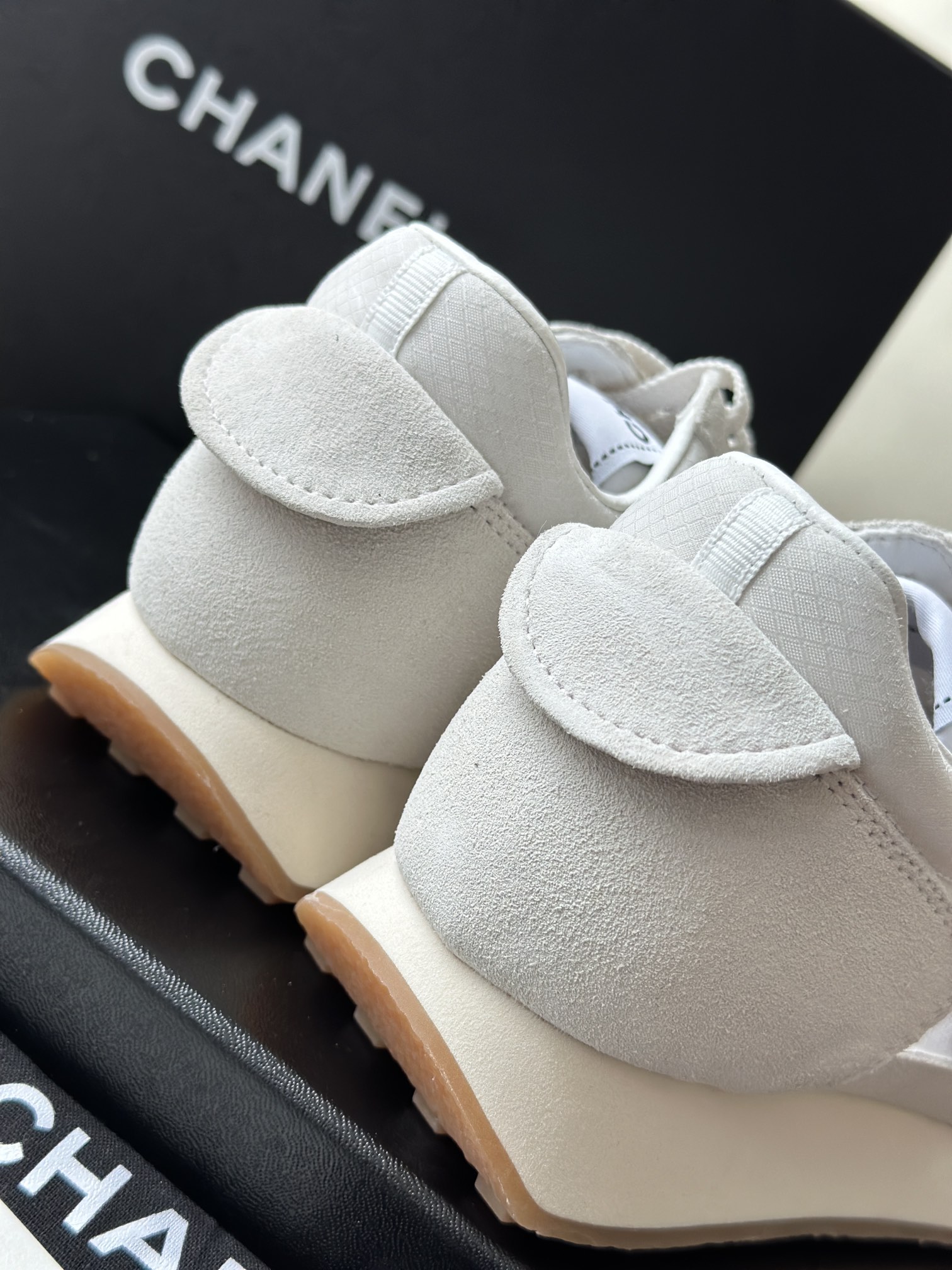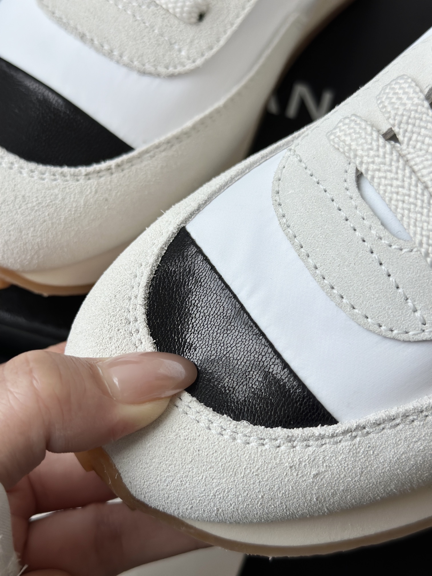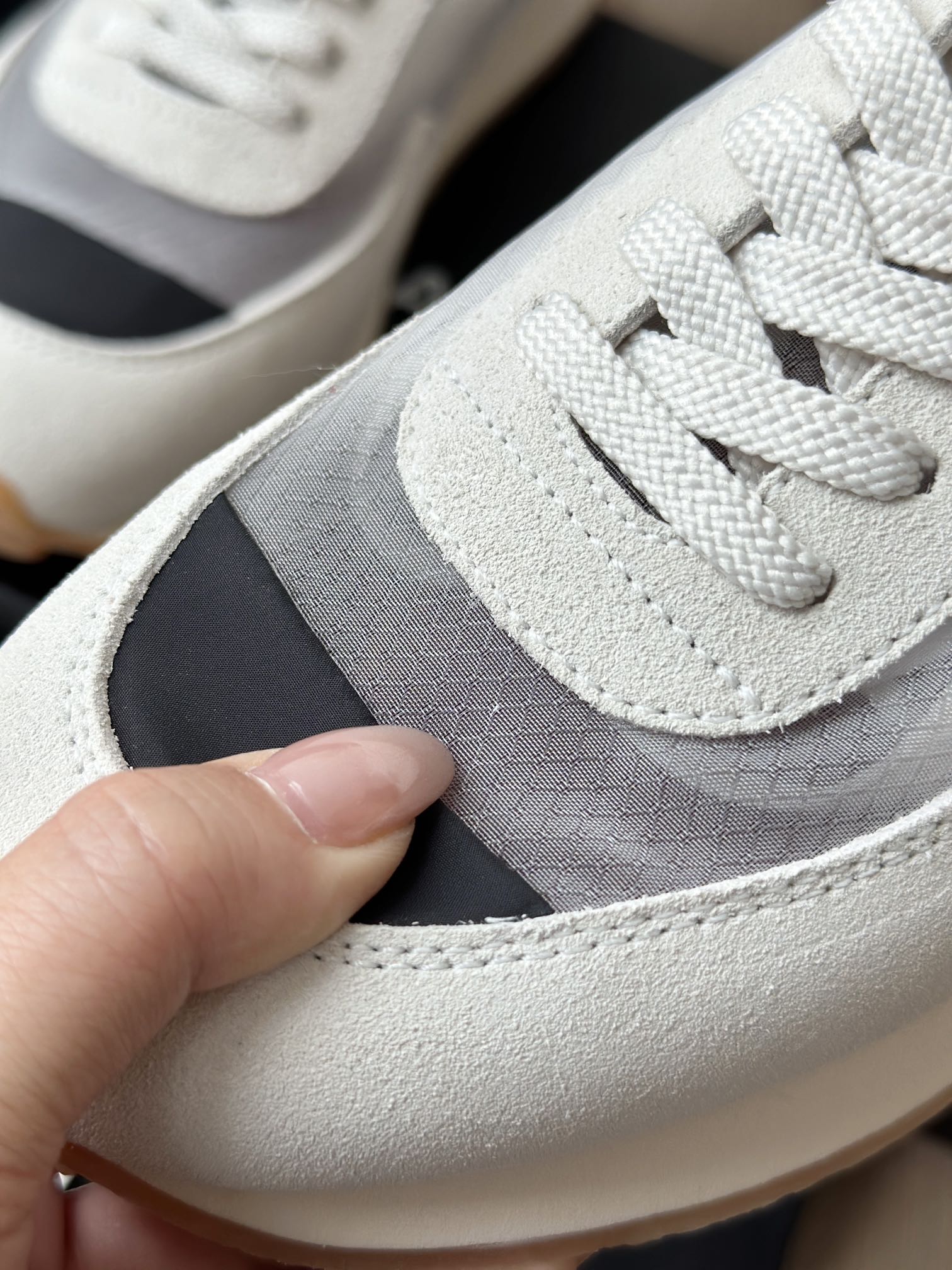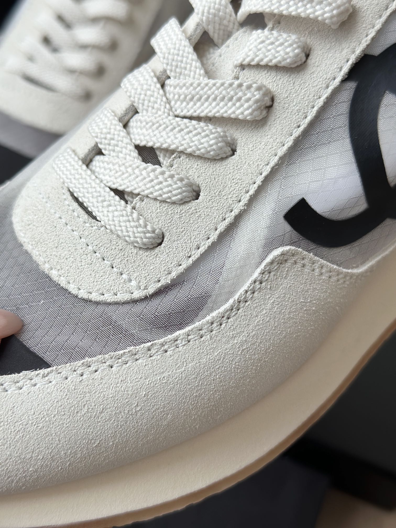 26P|休闲运动鞋 米白阿甘鞋|春日氛围感天花板✨ ▪️ 配色绝了:经典米白拼接网纱,搭配低调的黑色双C Logo,温柔又显贵,自带柔光滤镜,怎么搭都不出错✨ ▪️ 细节拉满:麂皮绒鞋面质感超棒,网面设计透气不闷脚,春夏穿再合适不过!鞋型超秀气,显脚小的同时还很修饰脚型,宽脚姐妹也能闭眼冲👍 舒适度&小心机双在线 ▪️ 厚底增高buff:4cm左右的厚底设计,悄悄拉长腿部线条,小个子姐妹直接拿捏黄金比例👯♀️ ▪️ 暴走不累:乳胶鞋垫+柔软内里,上脚就是“踩屎感”般的舒适,通勤逛街暴走2万步都毫无压力,打工人狂喜!😌 💃 万能穿搭公式 ▪️ 通勤风:搭配西装直筒裤,利落又专业,下班直接去约会无压力 ▪️ 休闲风:牛仔裤+针织衫,松弛感拉满,妥妥的法式富家既视感 ▪️ 甜妹风:碎花连衣裙/百褶裙,温柔又灵动,春日出街回头率拉满。 • 鞋面:采用织物(网眼/尼龙类面料) 鞋侧及后跟:拼接了麂皮效果小牛皮 • 内里:为小羊皮, • 大底:采用橡胶材质,部分款式加入PU缓震层 码数35---40