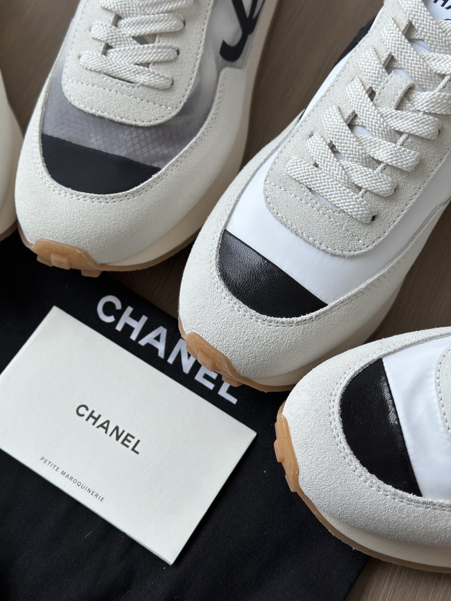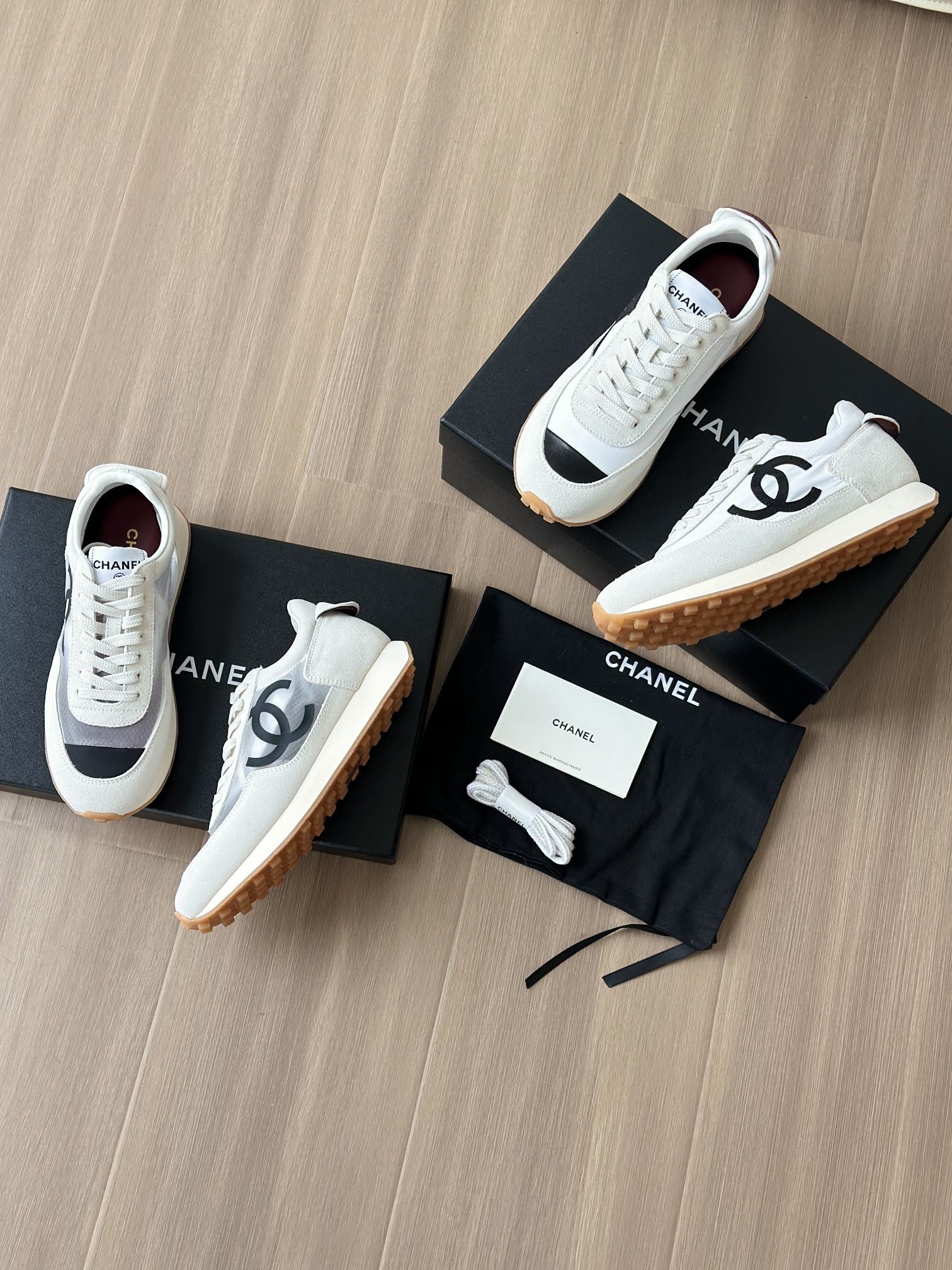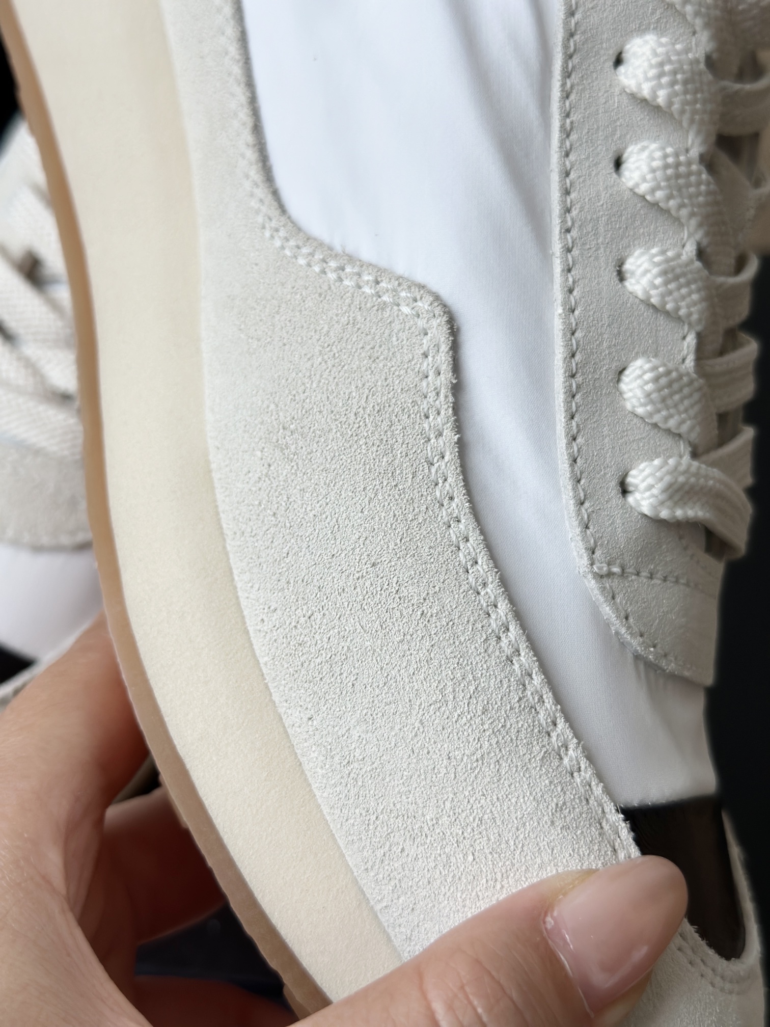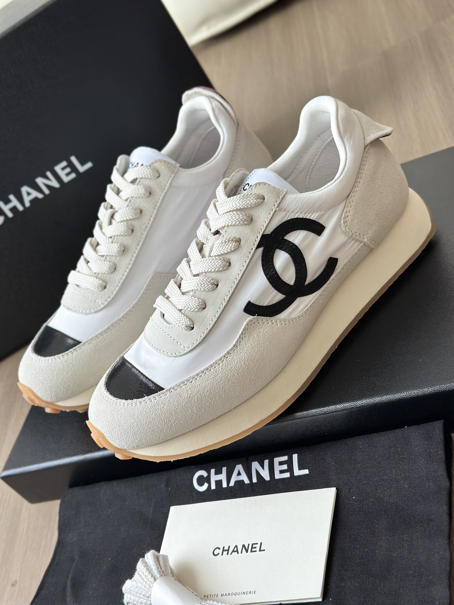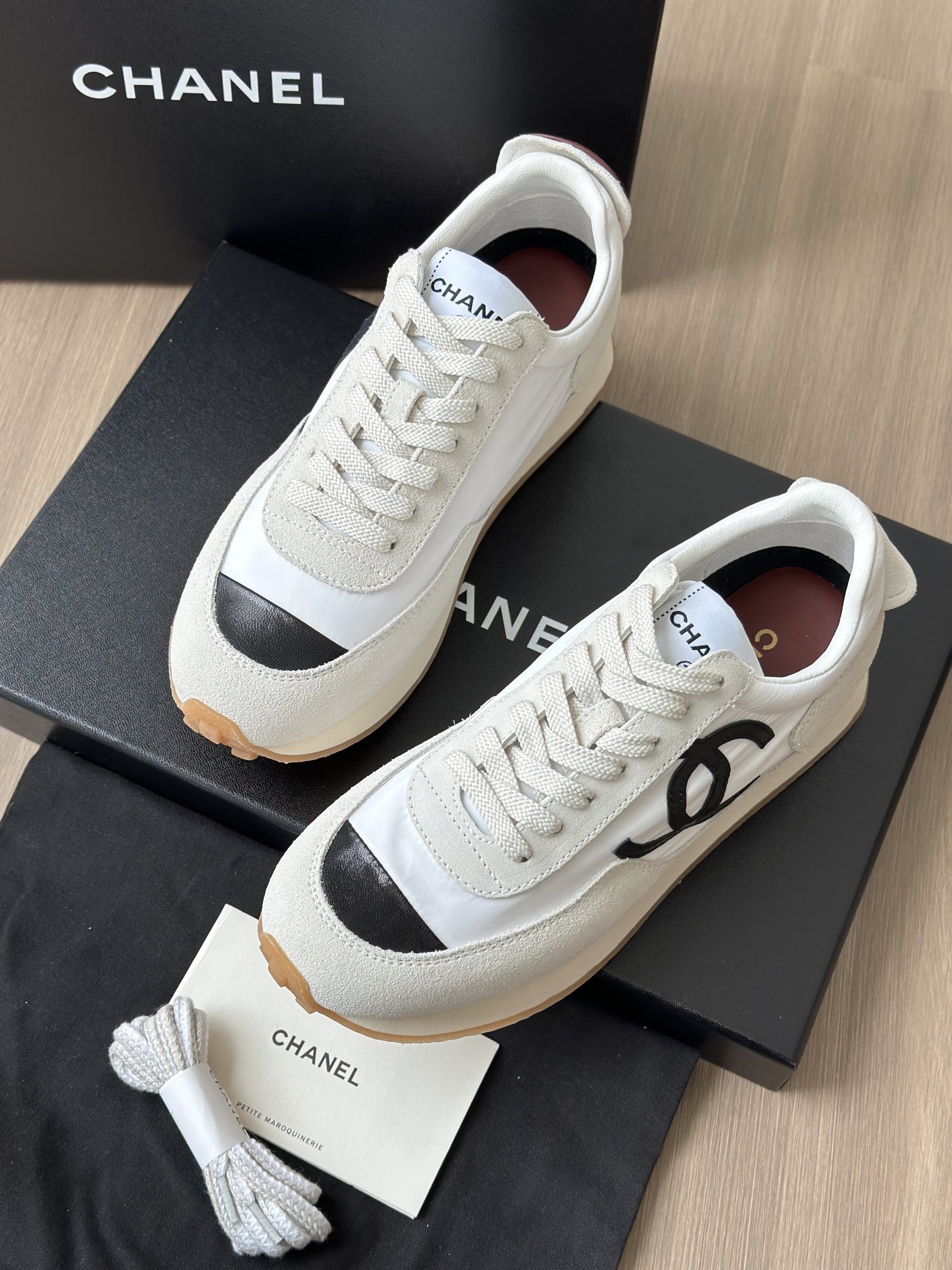 26P|休闲运动鞋 米白阿甘鞋|春日氛围感天花板✨ ▪️ 配色绝了:经典米白拼接网纱,搭配低调的黑色双C Logo,温柔又显贵,自带柔光滤镜,怎么搭都不出错✨ ▪️ 细节拉满:麂皮绒鞋面质感超棒,网面设计透气不闷脚,春夏穿再合适不过!鞋型超秀气,显脚小的同时还很修饰脚型,宽脚姐妹也能闭眼冲👍 舒适度&小心机双在线 ▪️ 厚底增高buff:4cm左右的厚底设计,悄悄拉长腿部线条,小个子姐妹直接拿捏黄金比例👯♀️ ▪️ 暴走不累:乳胶鞋垫+柔软内里,上脚就是“踩屎感”般的舒适,通勤逛街暴走2万步都毫无压力,打工人狂喜!😌 💃 万能穿搭公式 ▪️ 通勤风:搭配西装直筒裤,利落又专业,下班直接去约会无压力 ▪️ 休闲风:牛仔裤+针织衫,松弛感拉满,妥妥的法式富家既视感 ▪️ 甜妹风:碎花连衣裙/百褶裙,温柔又灵动,春日出街回头率拉满。 • 鞋面:采用织物(网眼/尼龙类面料) 鞋侧及后跟:拼接了麂皮效果小牛皮 • 内里:为小羊皮, • 大底:采用橡胶材质,部分款式加入PU缓震层 码数35---40