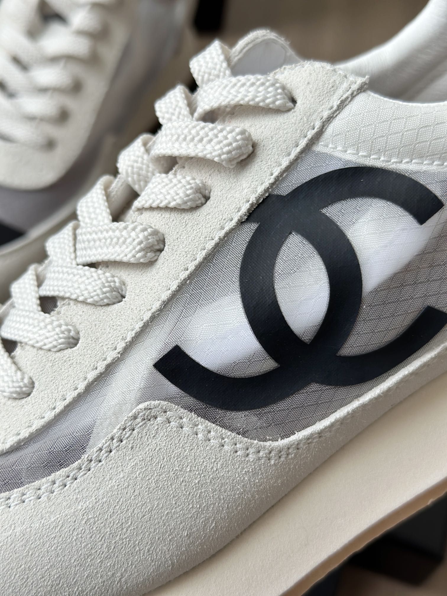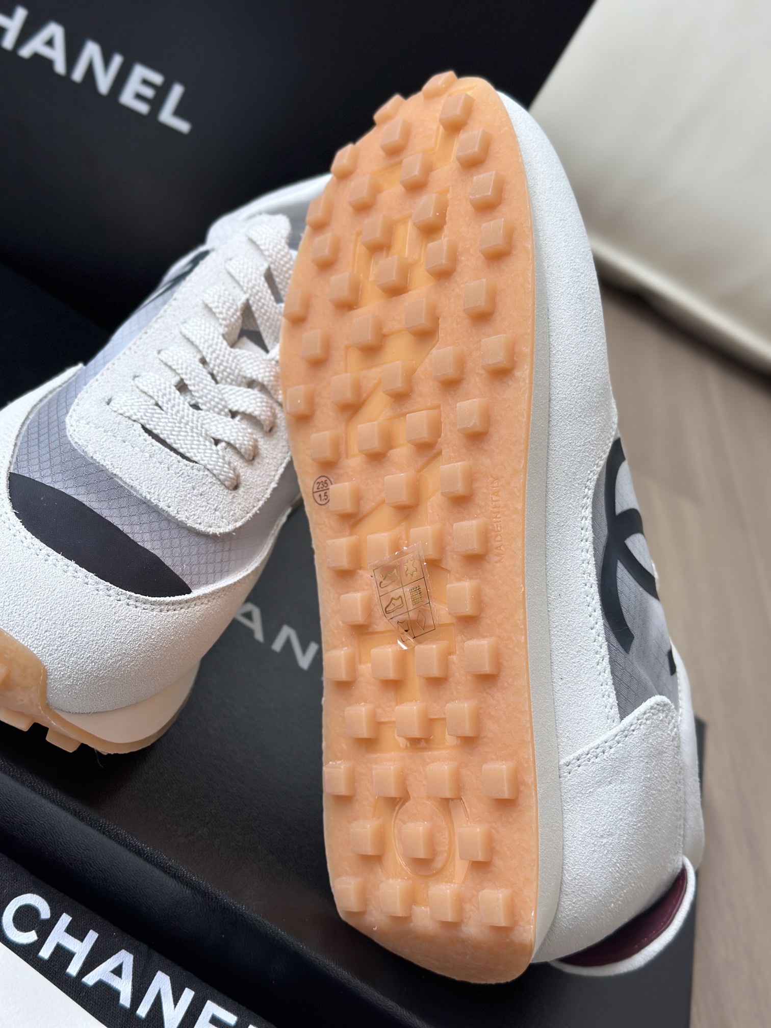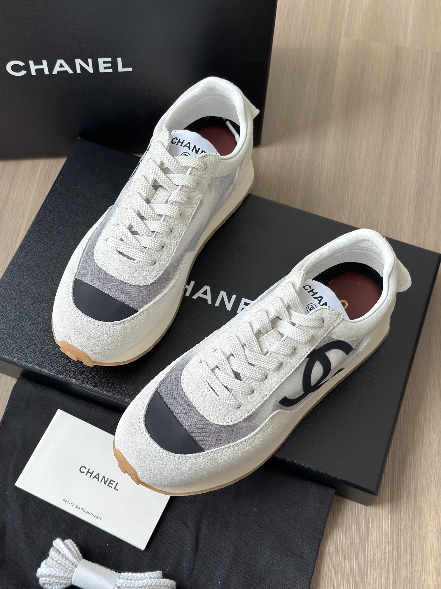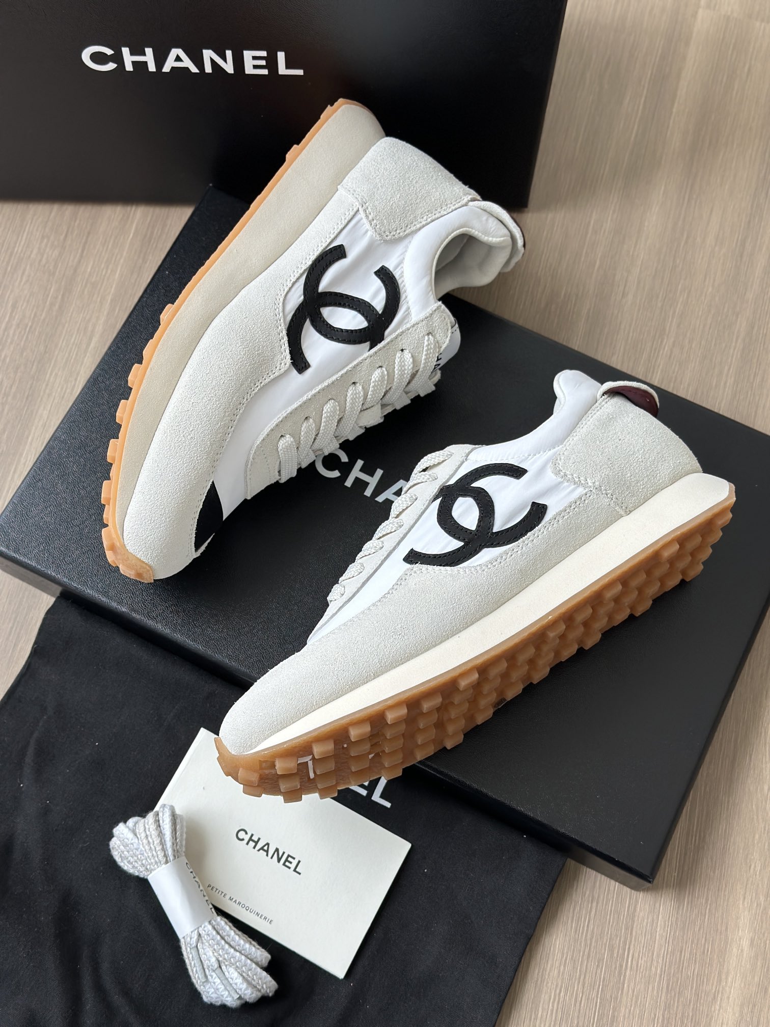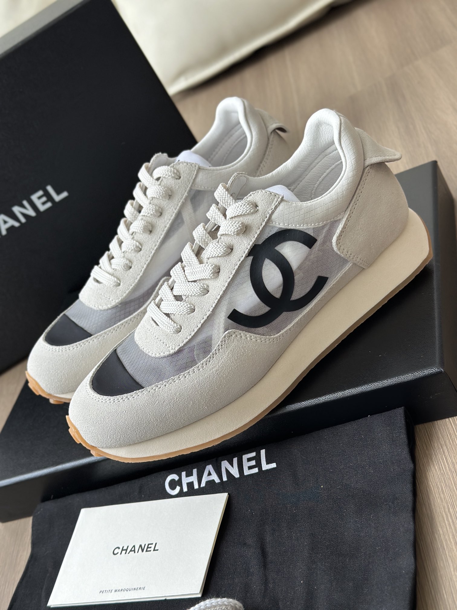 26P|休闲运动鞋 米白阿甘鞋|春日氛围感天花板✨ ▪️ 配色绝了:经典米白拼接网纱,搭配低调的黑色双C Logo,温柔又显贵,自带柔光滤镜,怎么搭都不出错✨ ▪️ 细节拉满:麂皮绒鞋面质感超棒,网面设计透气不闷脚,春夏穿再合适不过!鞋型超秀气,显脚小的同时还很修饰脚型,宽脚姐妹也能闭眼冲👍 舒适度&小心机双在线 ▪️ 厚底增高buff:4cm左右的厚底设计,悄悄拉长腿部线条,小个子姐妹直接拿捏黄金比例👯♀️ ▪️ 暴走不累:乳胶鞋垫+柔软内里,上脚就是“踩屎感”般的舒适,通勤逛街暴走2万步都毫无压力,打工人狂喜!😌 💃 万能穿搭公式 ▪️ 通勤风:搭配西装直筒裤,利落又专业,下班直接去约会无压力 ▪️ 休闲风:牛仔裤+针织衫,松弛感拉满,妥妥的法式富家既视感 ▪️ 甜妹风:碎花连衣裙/百褶裙,温柔又灵动,春日出街回头率拉满。 • 鞋面:采用织物(网眼/尼龙类面料) 鞋侧及后跟:拼接了麂皮效果小牛皮 • 内里:为小羊皮, • 大底:采用橡胶材质,部分款式加入PU缓震层 码数35---40